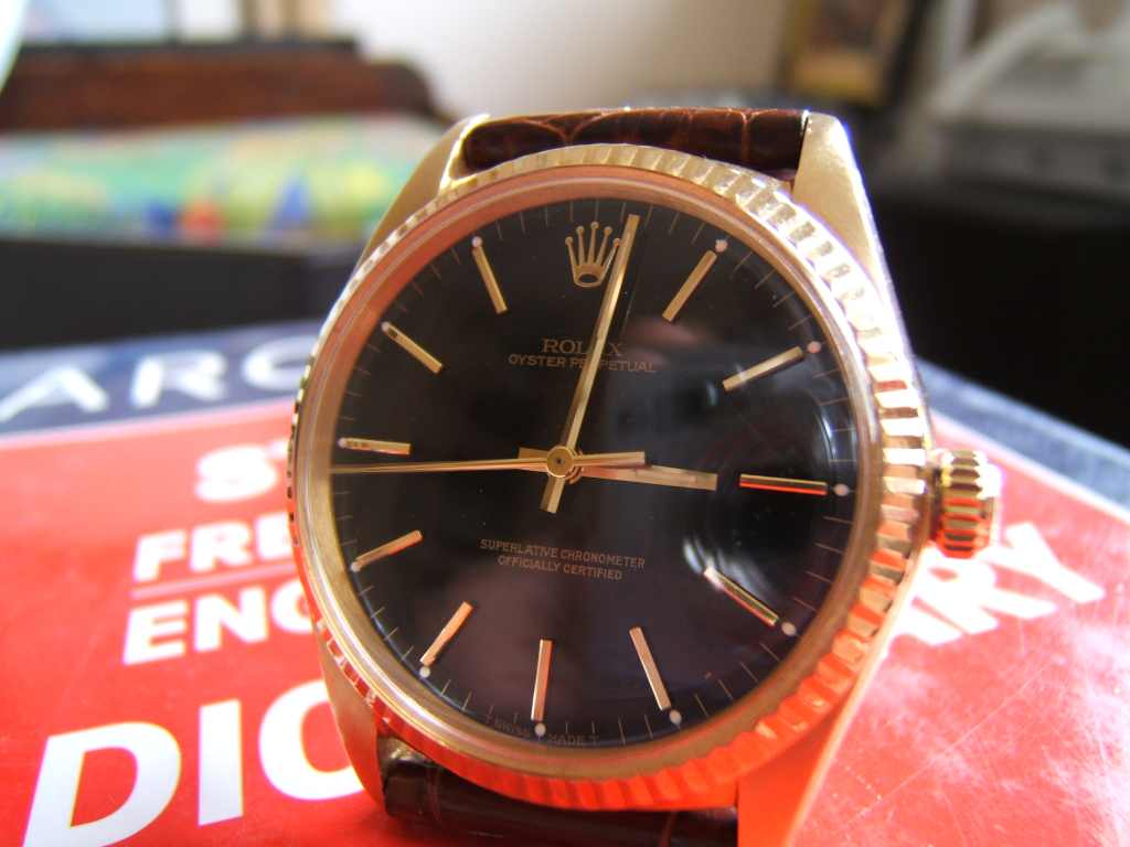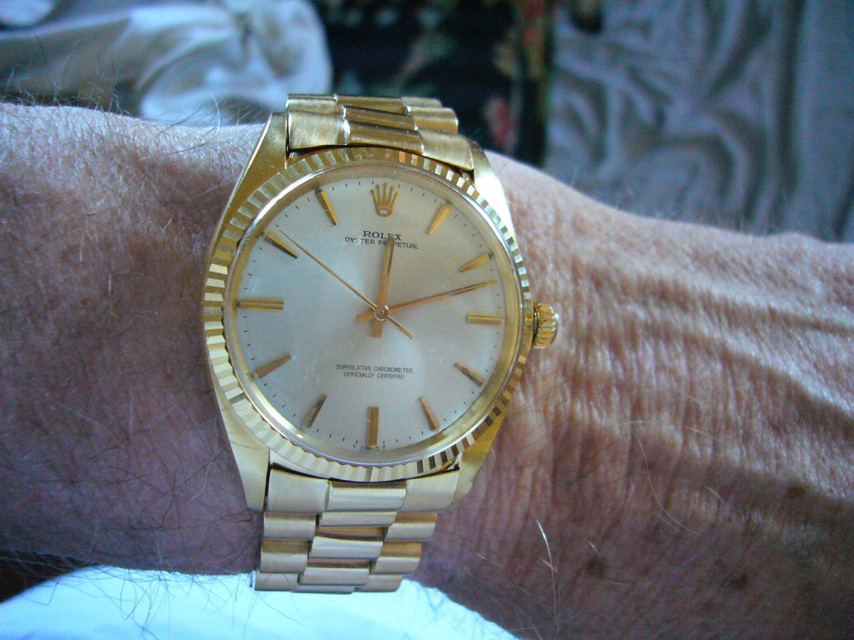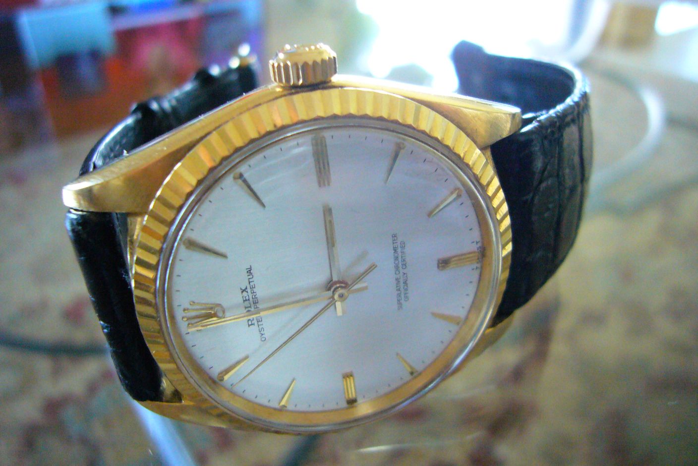 The 1013s are an amazing bargain, even today. $13k on a bracelet, $^k to $7k on a strap with gold rolex buckle. 18k 36mm case with 20mm lugs, same basic size as the 18k DateJust and Day Date, but not quite as tall so it lies flatter on the wrist. Intro'd in Sept. 1960 it had the 1560 movement, Dauphine hands and dagger markers. By the mid to late sixties it had changed to the 1570 movement with baton markers and stick hands. In the early seventies it got the hacking movement. Not sure how long after that production stopped. Some came on Oyster bracelets, others on Jubilees, and many on leather straps. They were for the few who did not want the more complicated DJ and DD, as a result they were probably produced in much fewer numbers or ordered by request. Here are a couple of others that I owned, and then let get away...included a pink gold smooth bevel 1012 version (mabe the rarest).