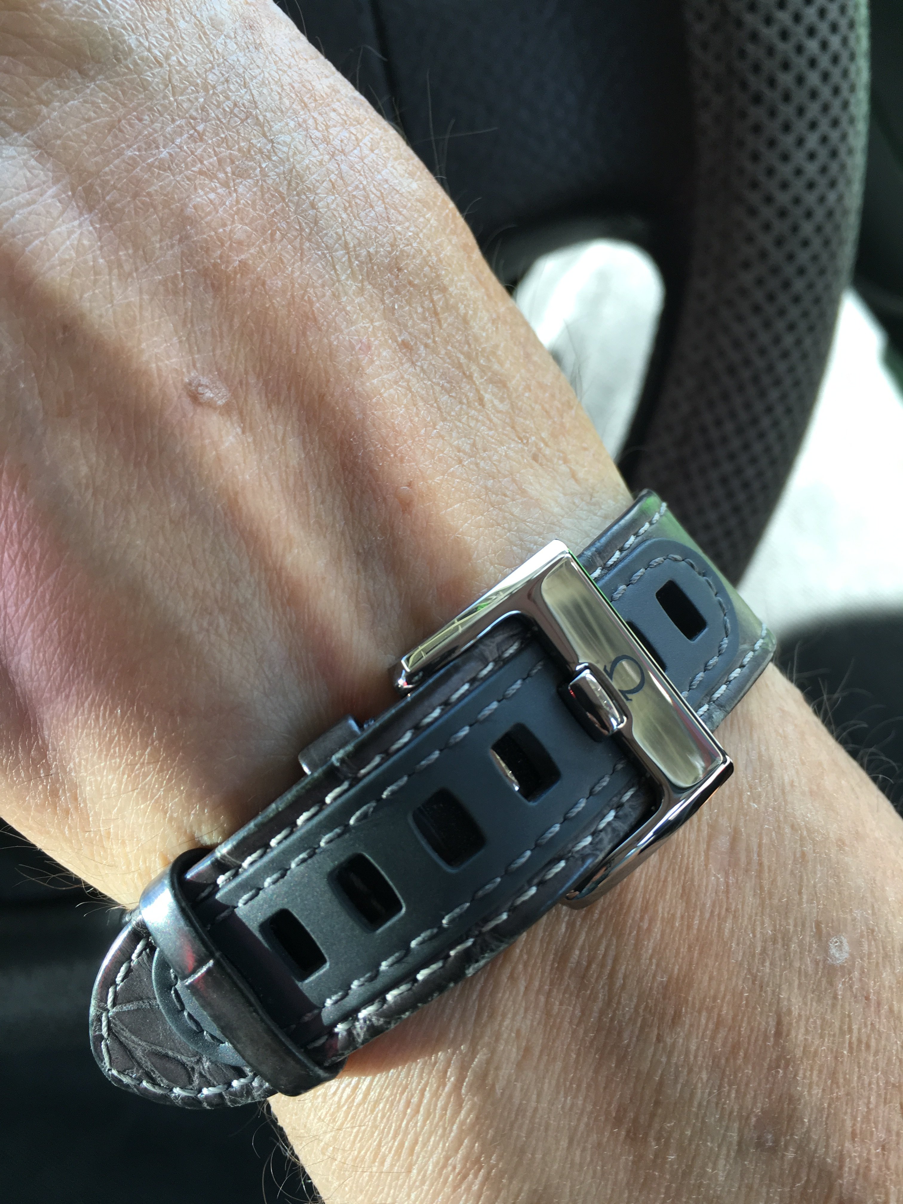 Here are some photos on the wrist. Note especially the third photo - Omega has done some fantastic (to me) things with this strap. For one, where most belts and watchbands wear badly at the hole that's used all the time, this one has such good reinforcement that even though I've worn it day and night for a month, there's zero evidence of wear at that hole. The second great feature is a small projection/nib under the loop that encloses the strap near the end that locks into the last hole, so the end of the strap doesn't get bent upward and look bad. I've cut the ends of some straps off because of that issue.