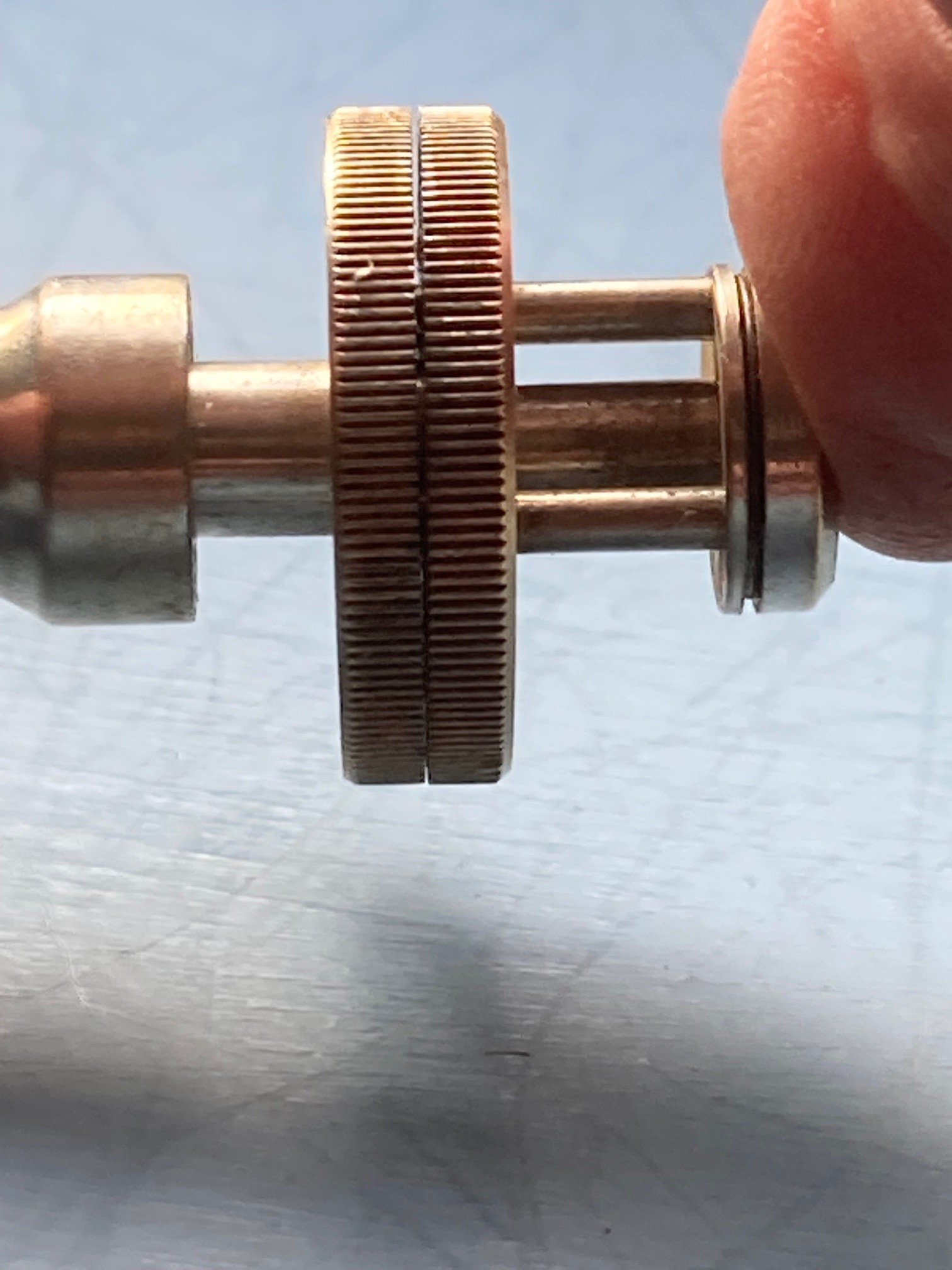 It is about 40mm long and 20mm across the two plates. The plates have 10 holes of graduated sizes. The holes are counter bored so that there is a shoulder inside each except the largest. I you look at the other pictures you will see that the the plates are held together by a concealed spring but can be separated by pressing on the opposite ends. The thumbscrew could either be used to lock the plates together or set an exact separation when depressed.
