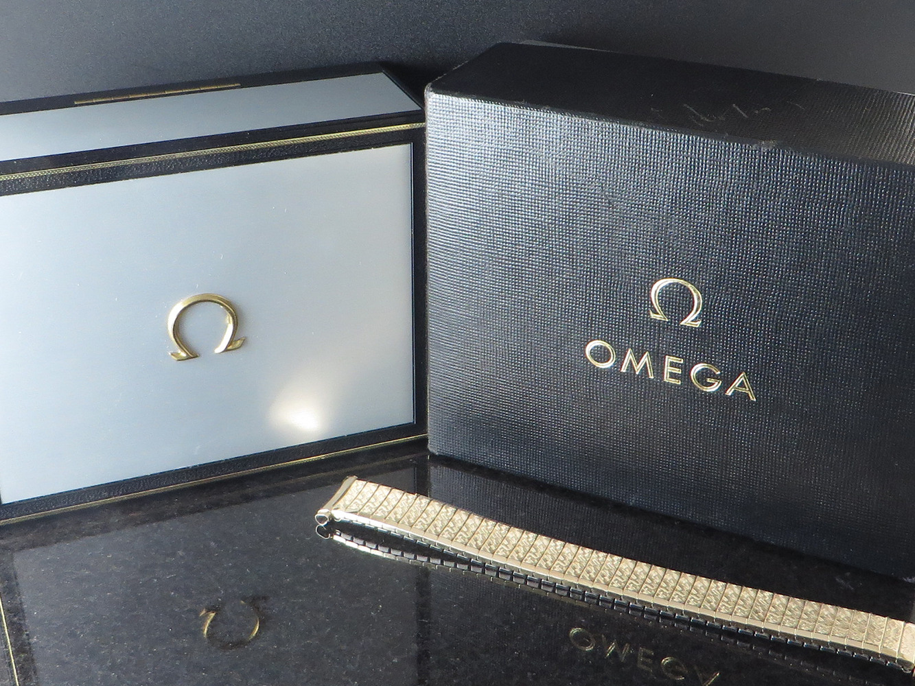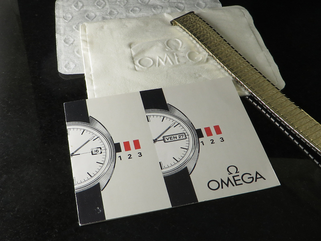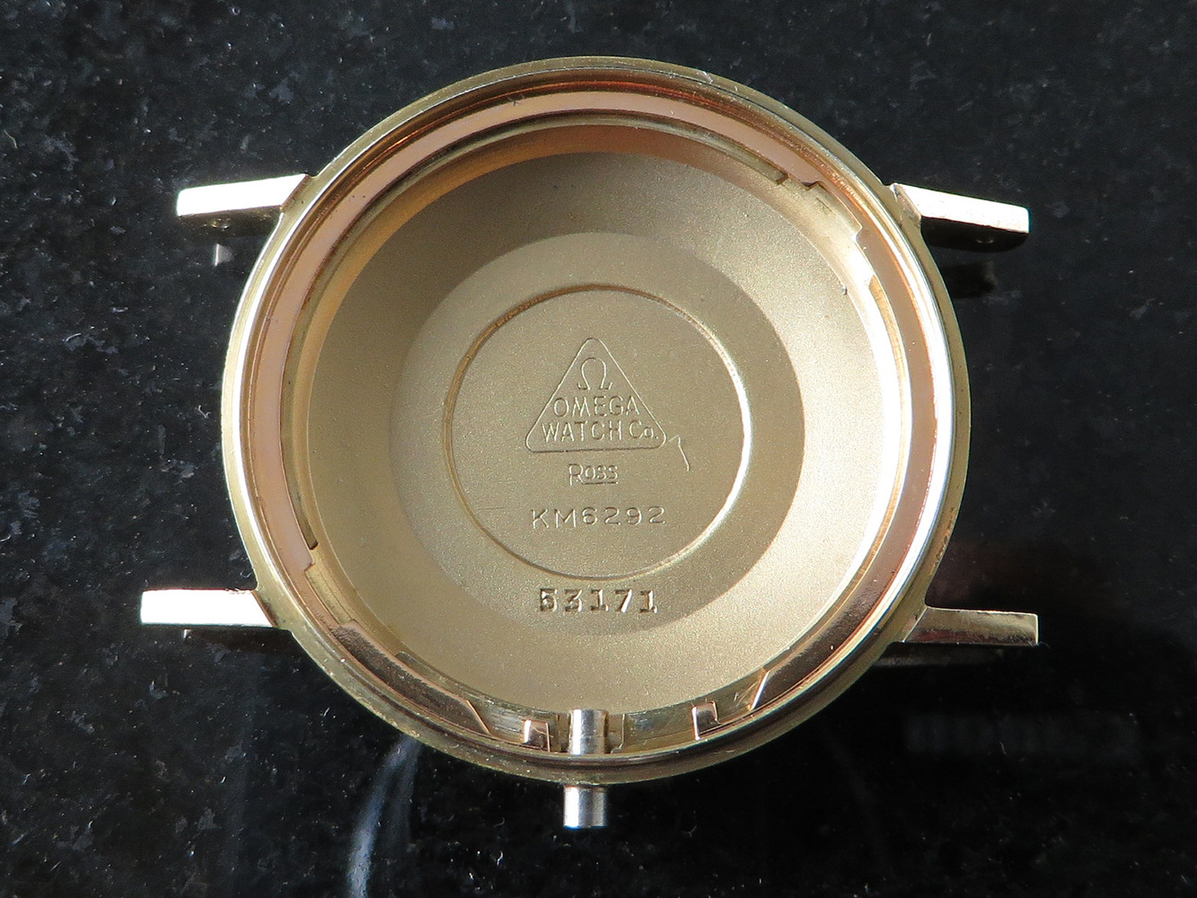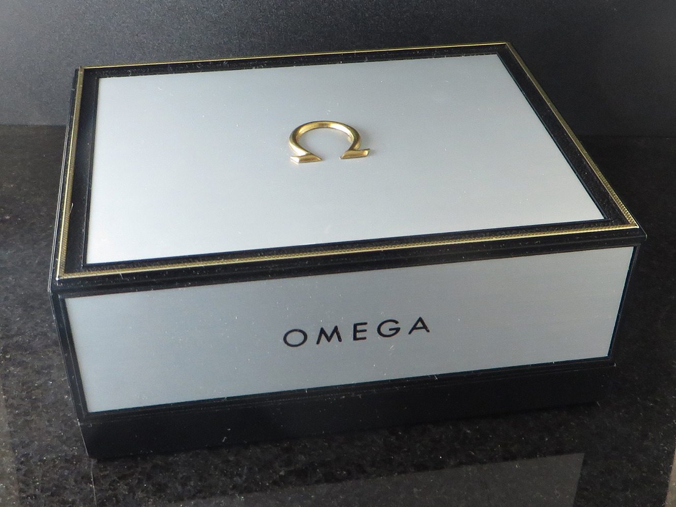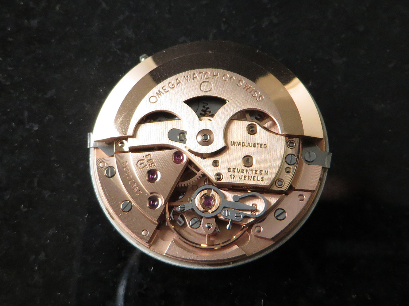 MINT original sunburst silver dial with applied faceted gold figures, Omega symbol and script.