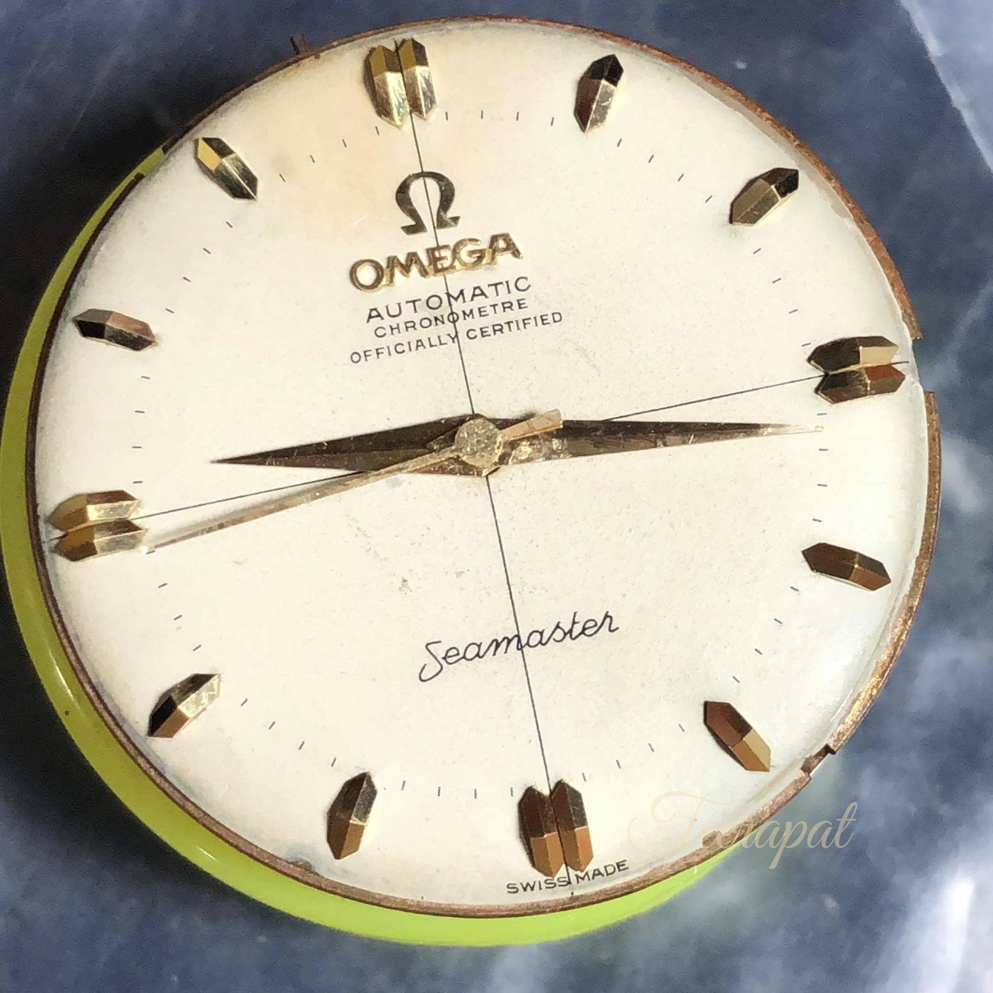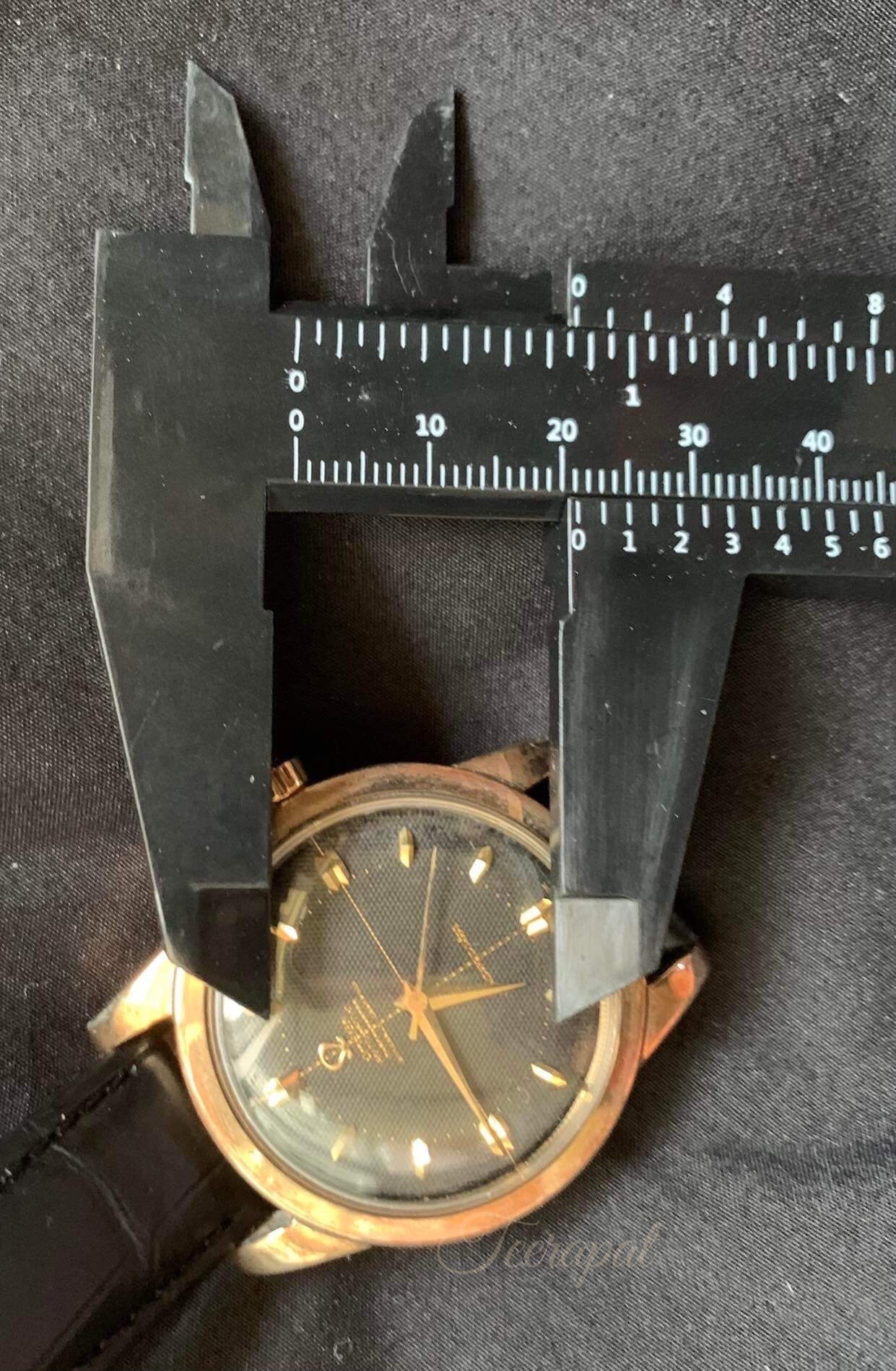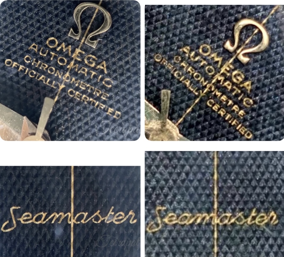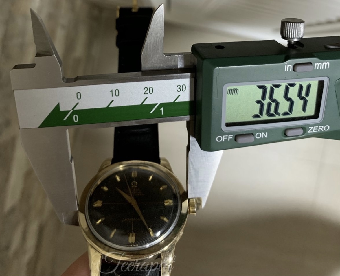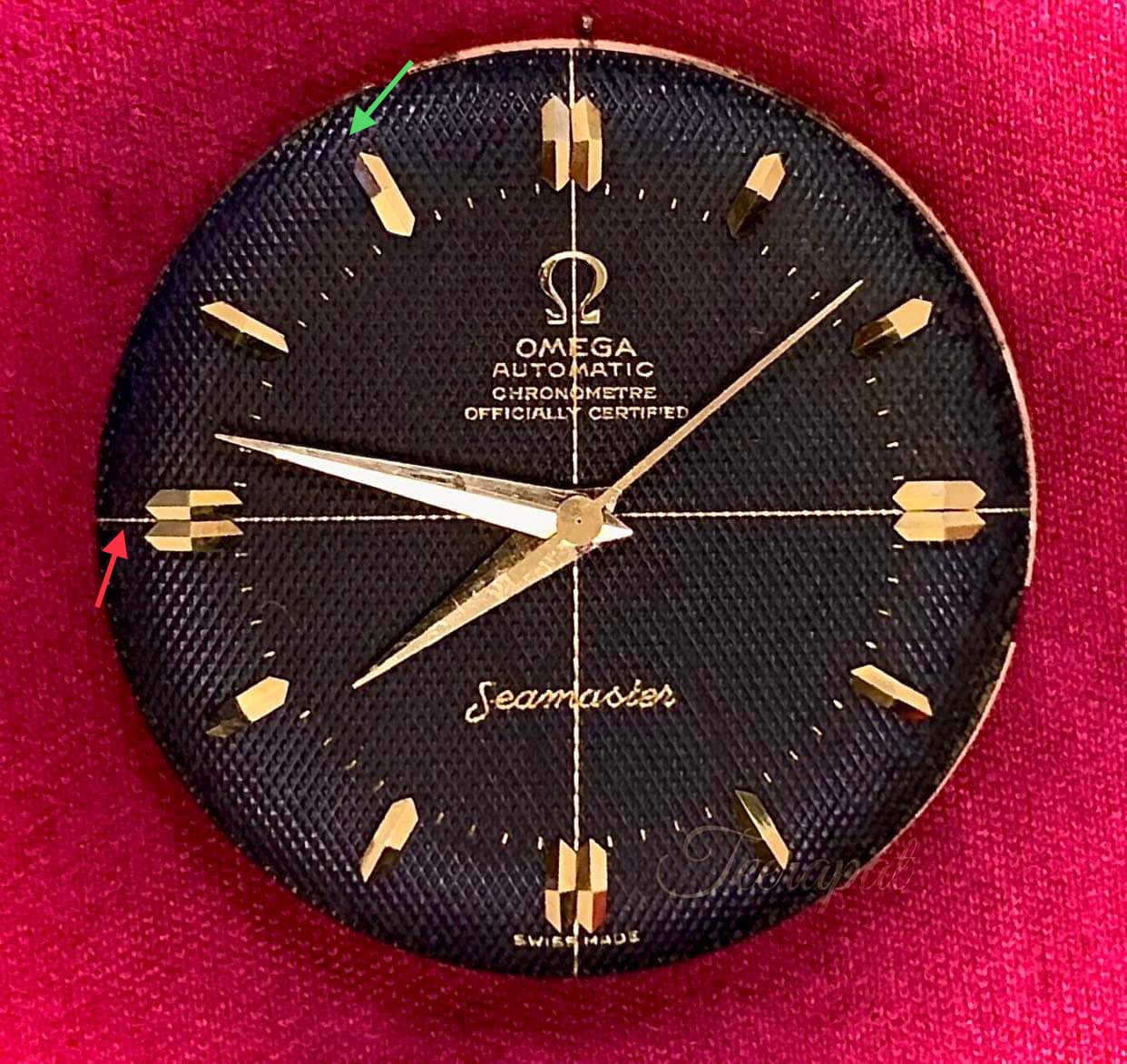 I compared my watch to my friend’s omega ref.2577-22 with original black chronometer in the usual case size, please see the smaller gap under the word “Swiss Made” (red arrow) and smaller gap next to the markers (green arrow)