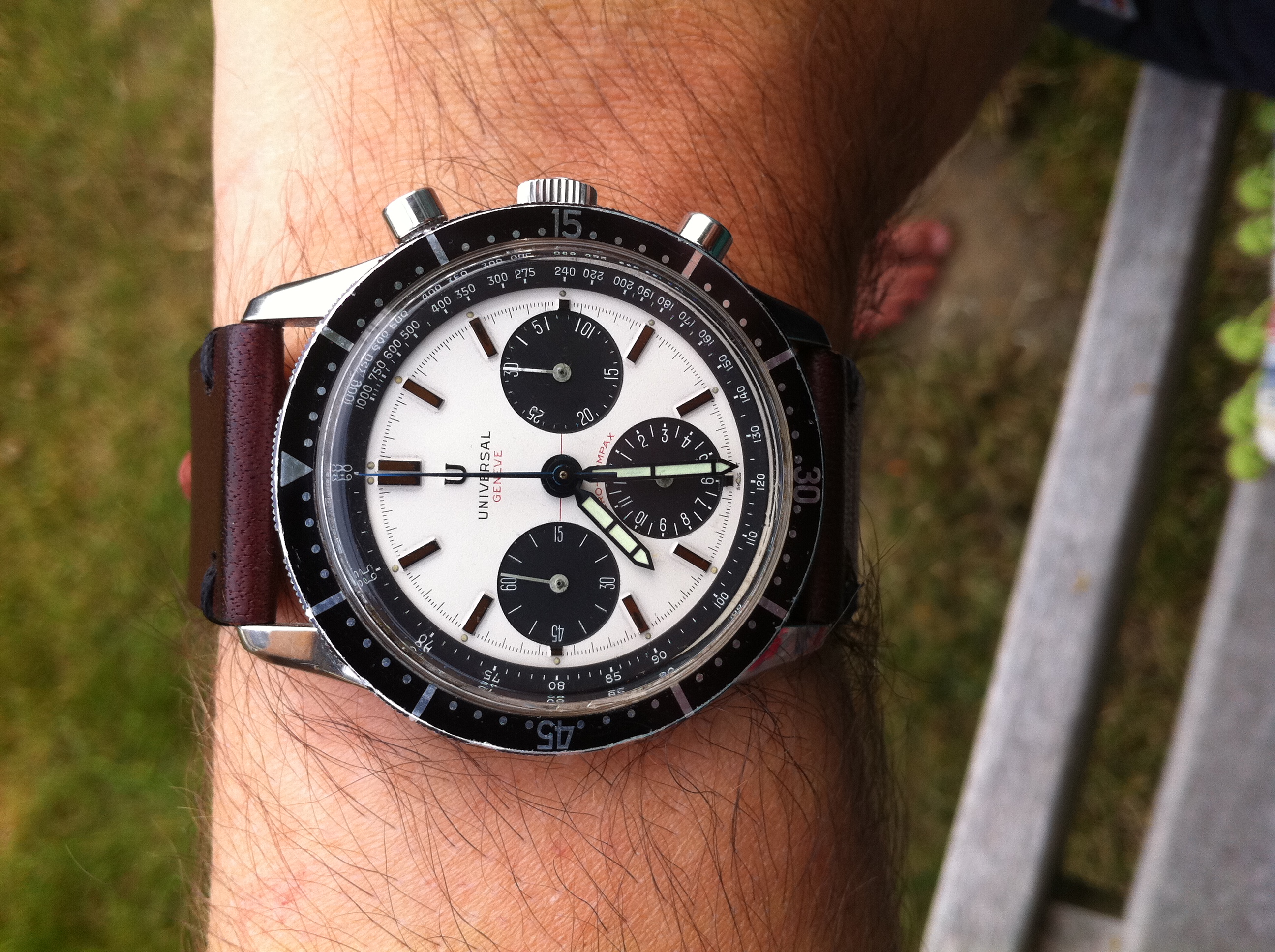 this is an especially tough one because it is from a very poorly documented period in Universal Geneva chronograph history, roughly 1960-1972. These late Aero-Compaxes in particular exist in so many references that I have no idea about production sequence, rarity, etc. I'd suggest letting the market decide - stick it on ebay, straight auction, PayPal, international shipping (no PayPal, domestic only restricts the market and the price). Just to take a (conservative) stab at it I'd predict a price north of USD2500.