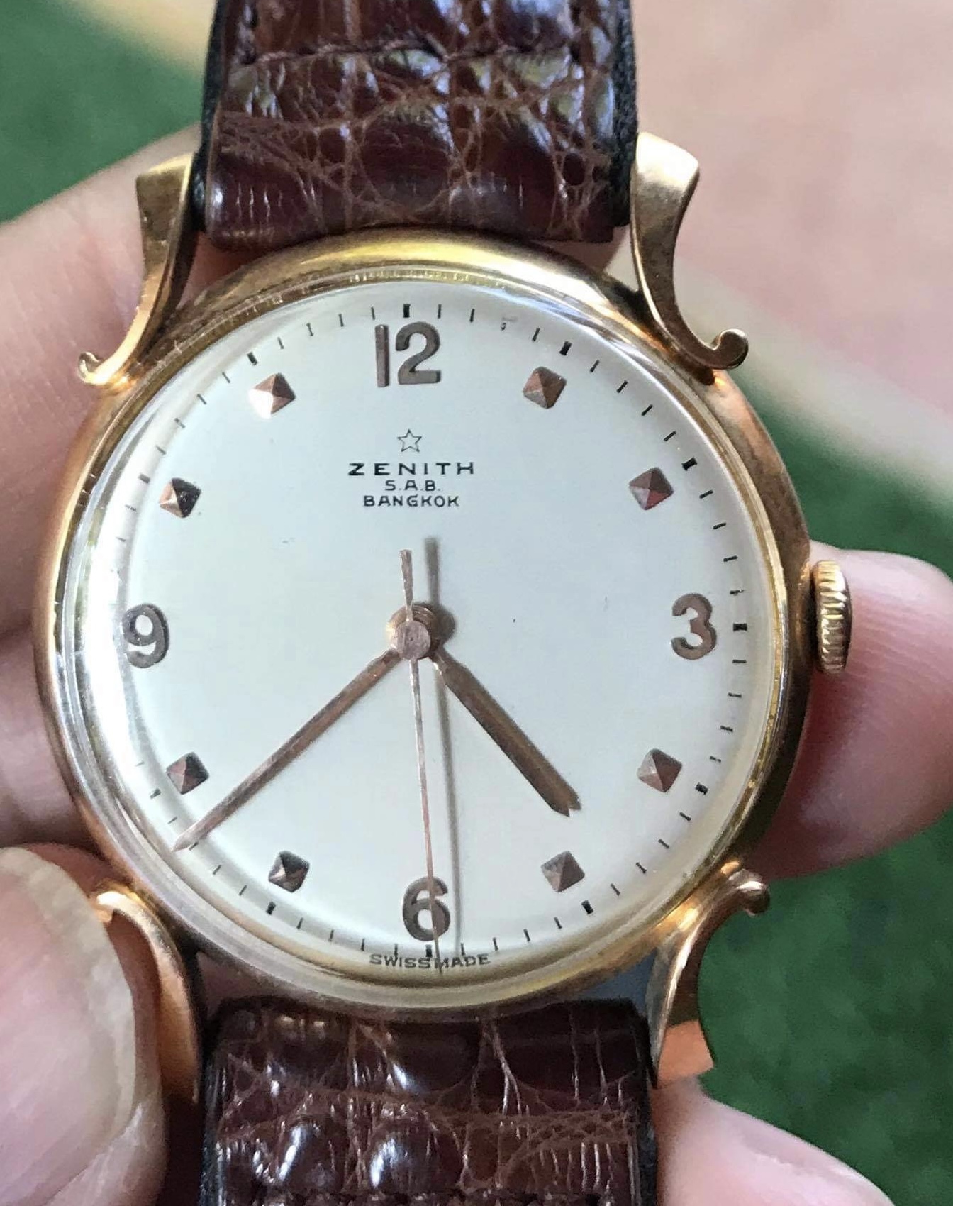 It was the 18k-yellow gold version, uncommon lug style, serial no. 4,010,6xx. with “S.A.B.” and “BANGKOK” on dial.