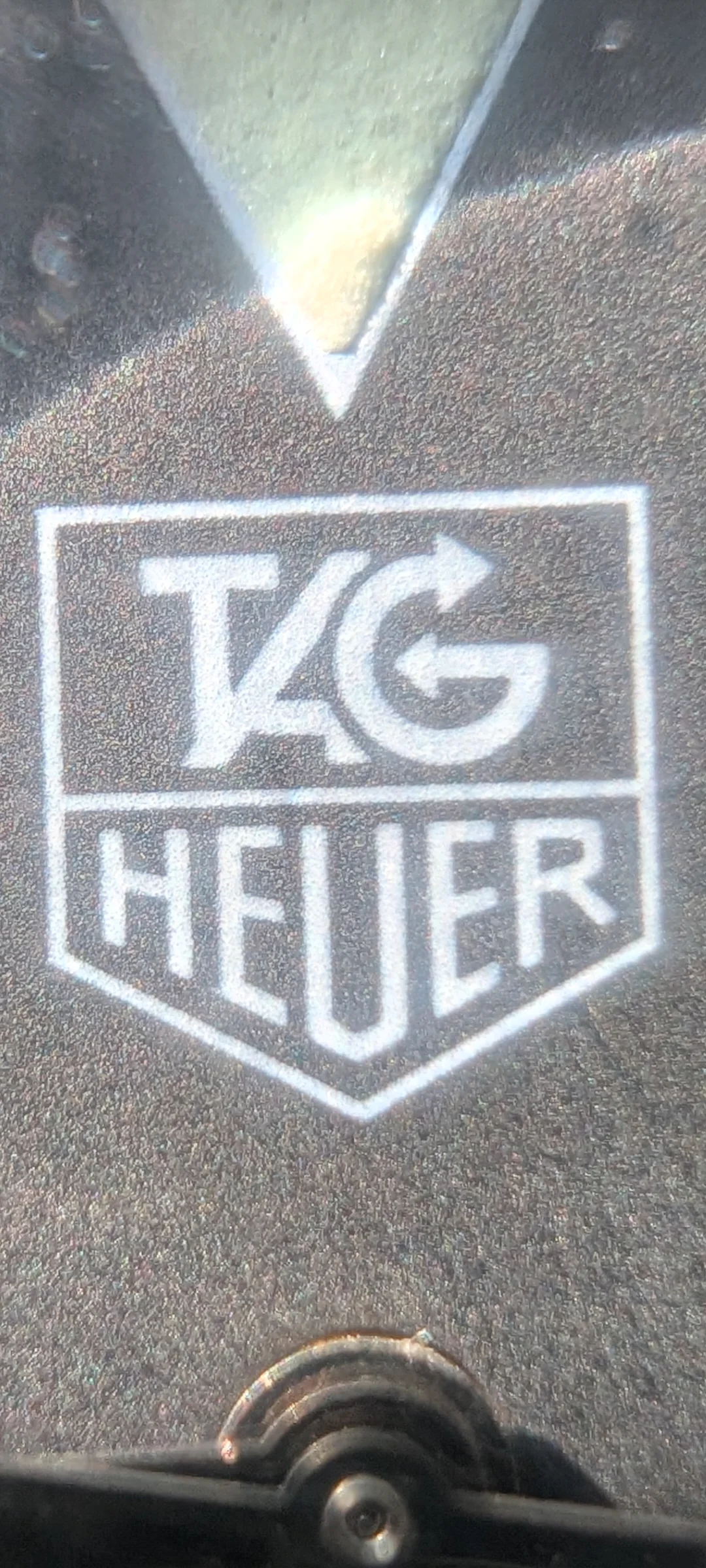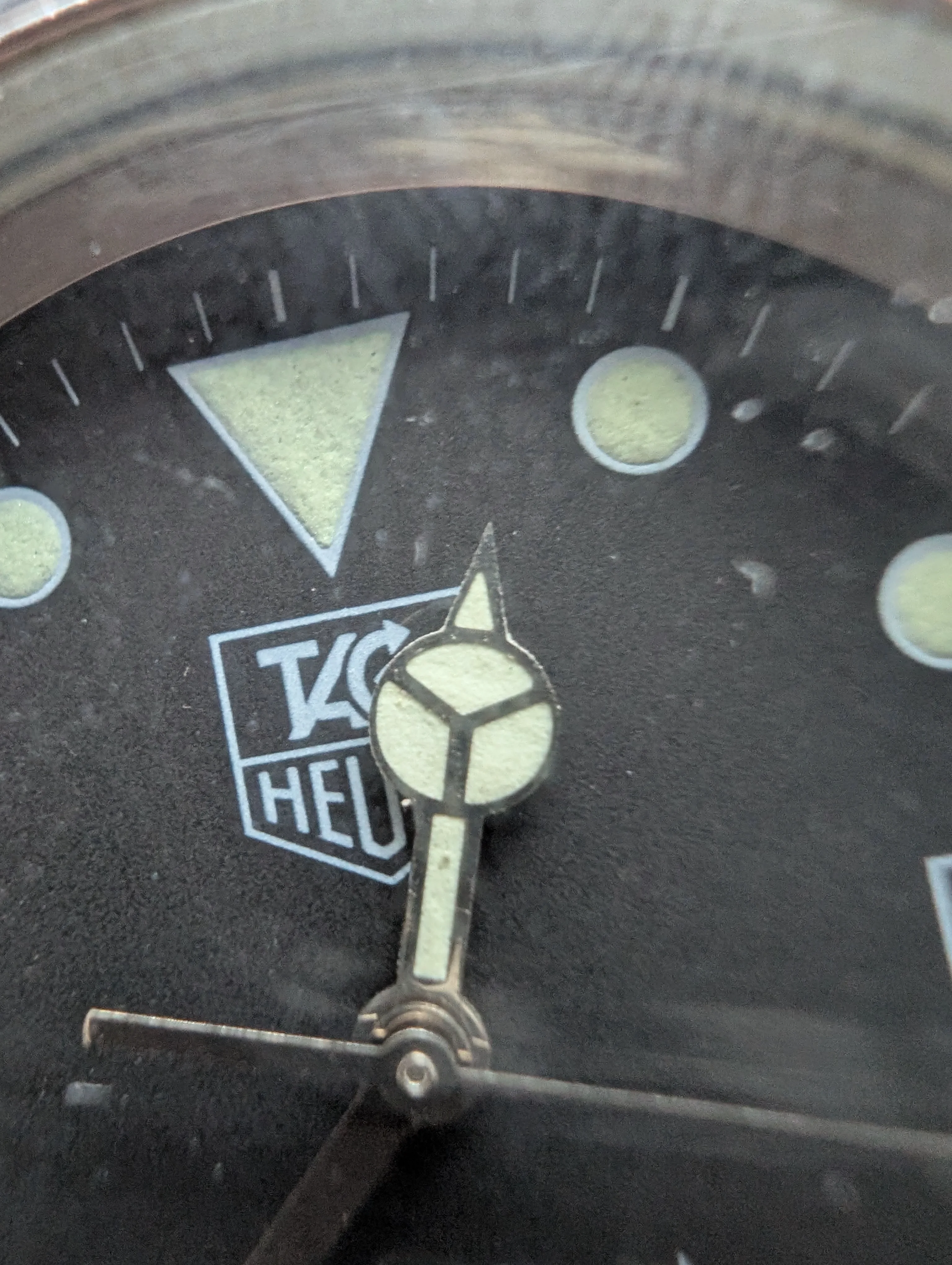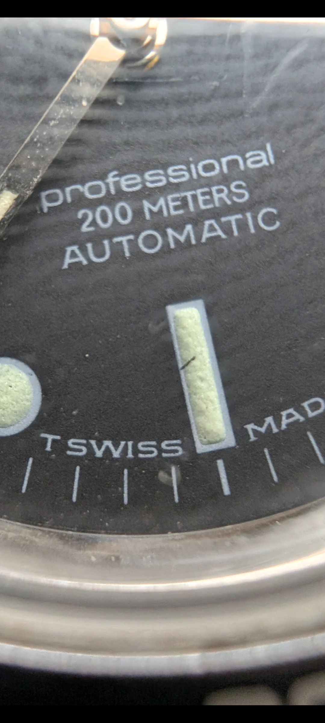 The hour hand looks odd, possibly aftermarket or very poorly relumed. The dial surface is irregular grainy, is that normal for this model? Under magnification, the logo seems questionable: the print shows uneven thickness, slight misalignment, and some of the letter shapes look off compared to known originals. Also the rest of the printing seems odd to me, but because I noticed that more recently, so I don't have proper macro shots from it yet. It's late here and there's no good light anymore to make some.