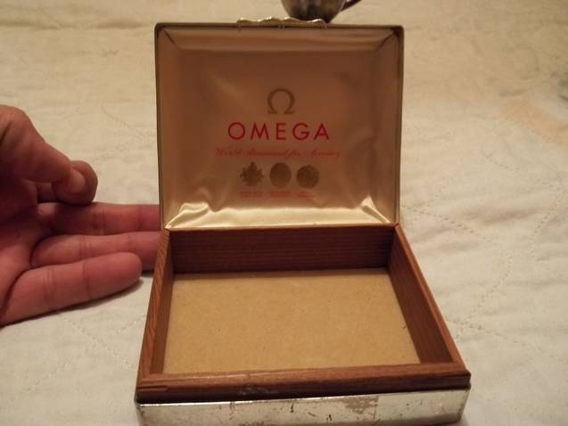 It would have had a small sideways stand inside, similar to the Speemaster shown above. Given the medium size of the box, it likely held something like a Seamaster DeVille when new.