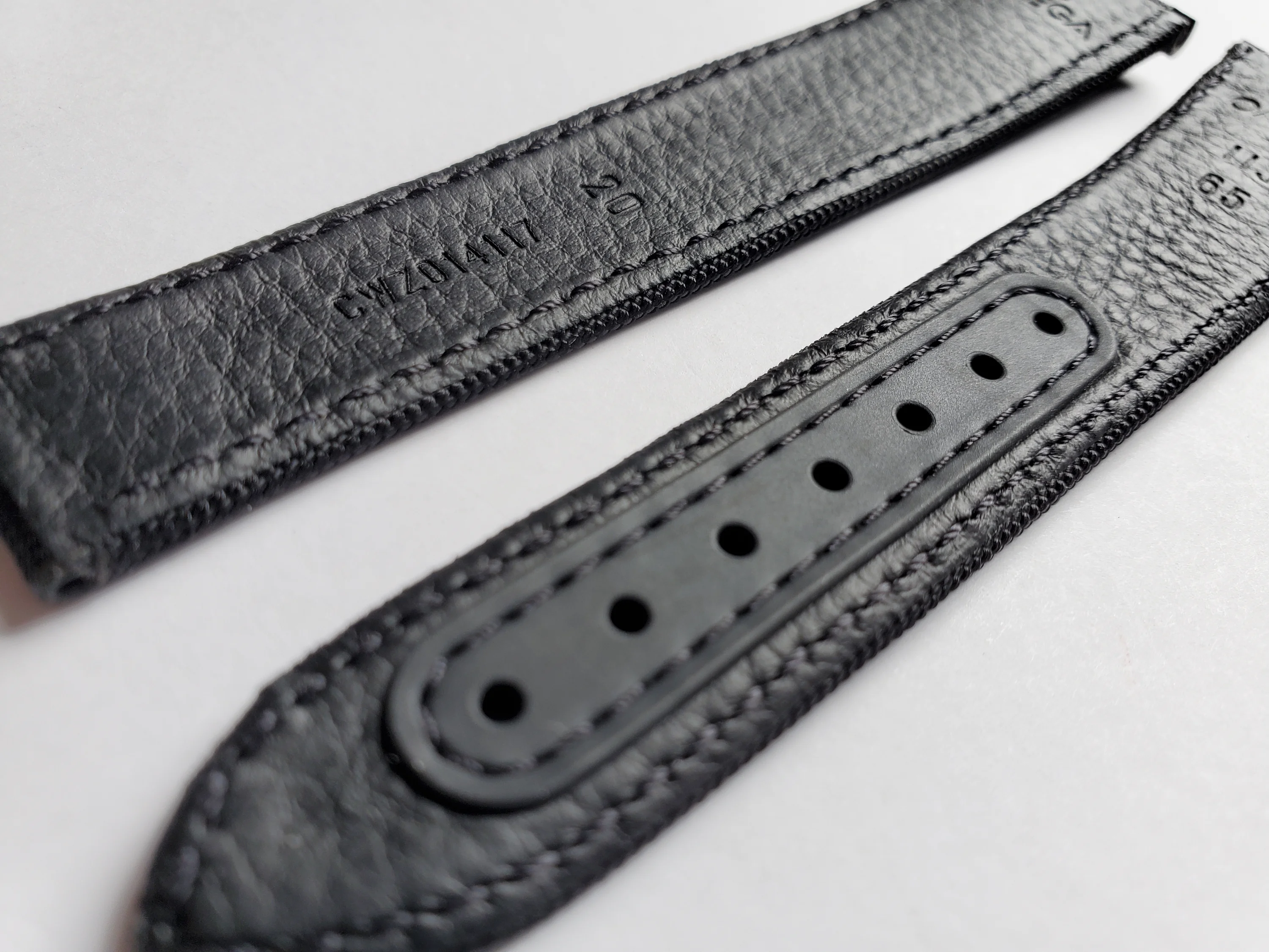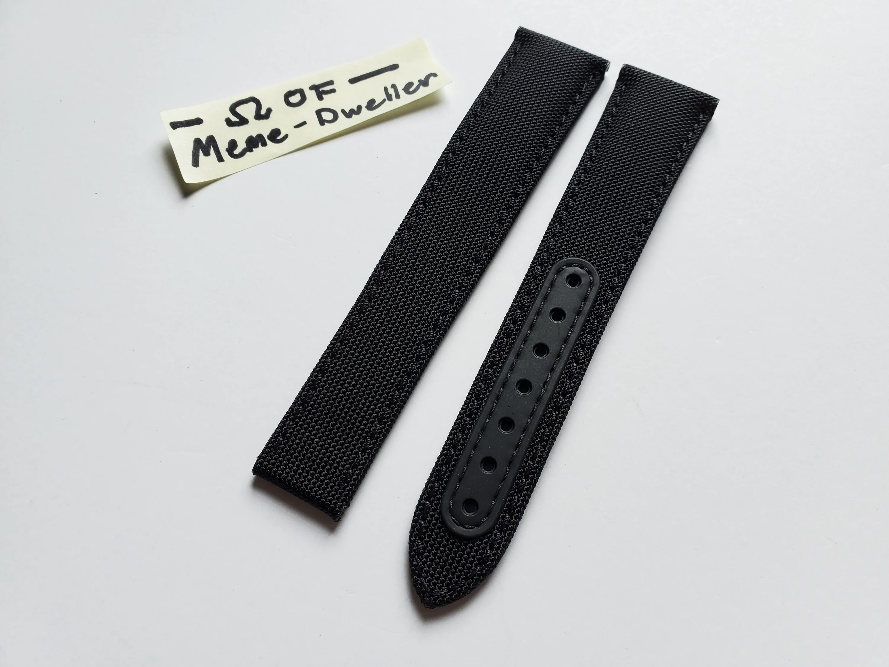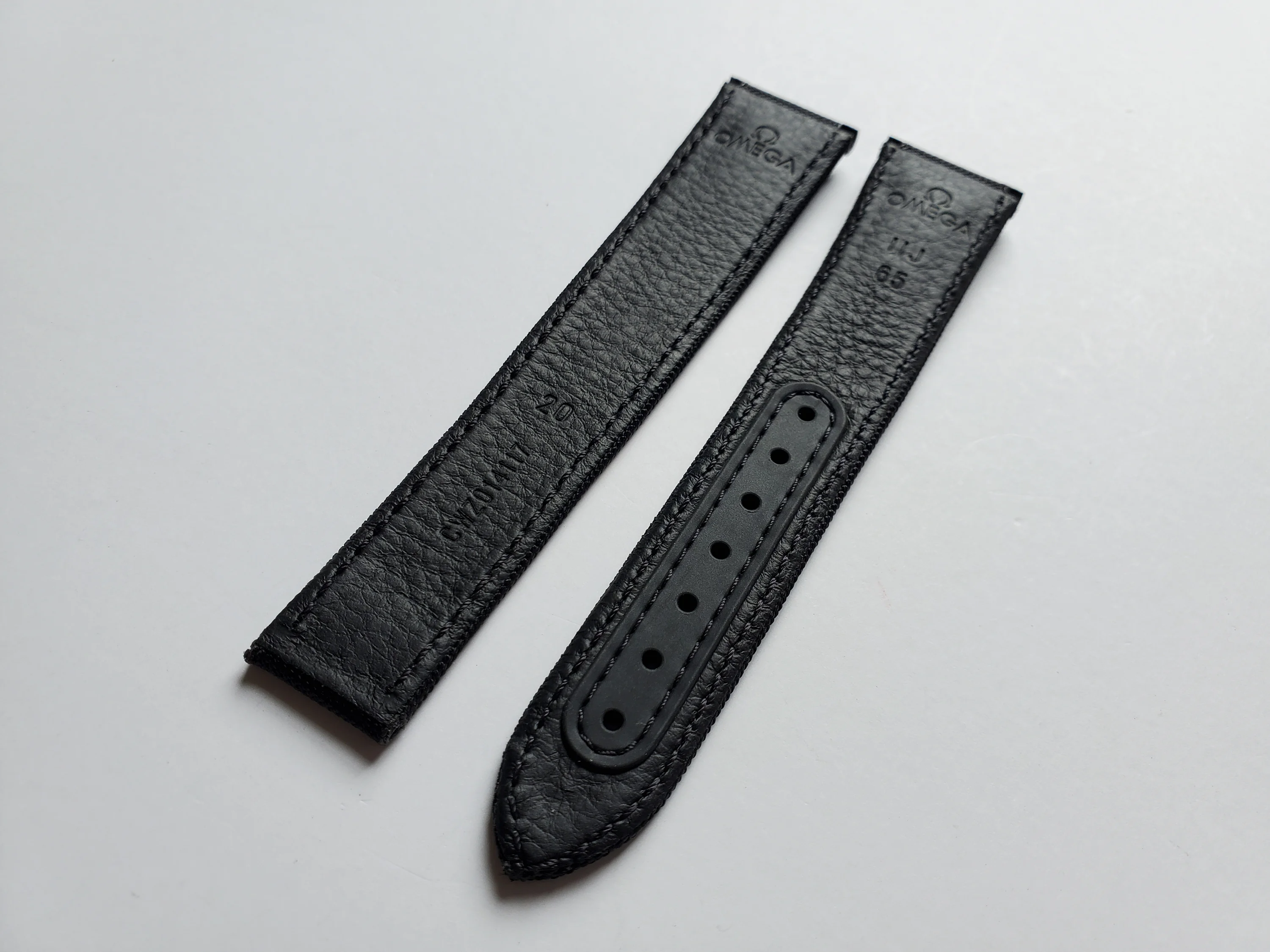 ·Up for sale is a new & unworn genuine Omega black fabric & leather strap with genuine Omega stainless steel buckle. The strap is 20mm wide at the lugs and tapers to 16mm at the clasp. No spring bars included (except the one that connects to the clasp). Standard/Regular/M length. This is meant for the Moonwatch, but it'll fit almost any watch with a 20mm lug width.