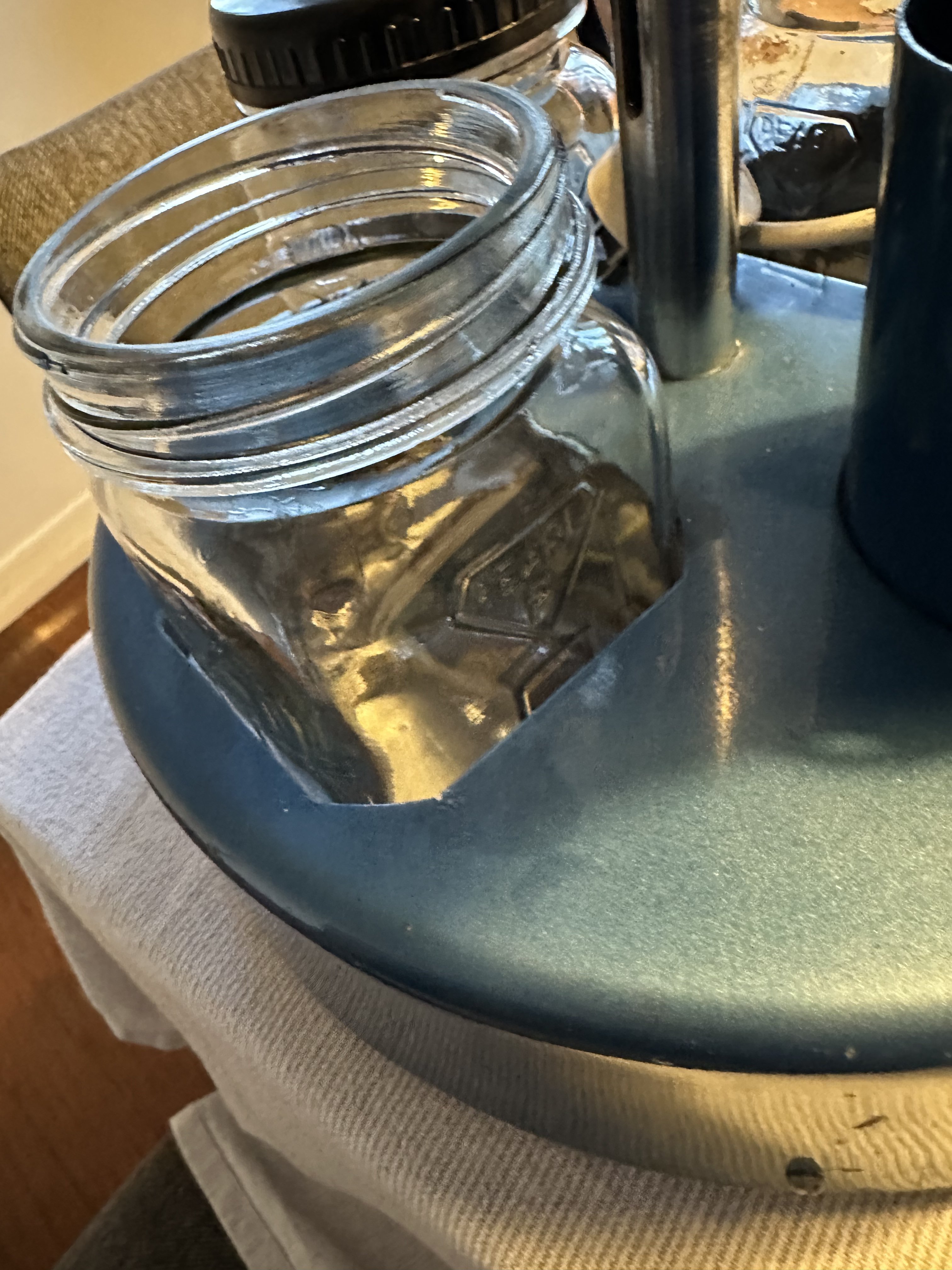I think I’ll put a seal around the edges of the holes where the jars sit so they are more snug and some seals inside the lids before I drop it off to dad.