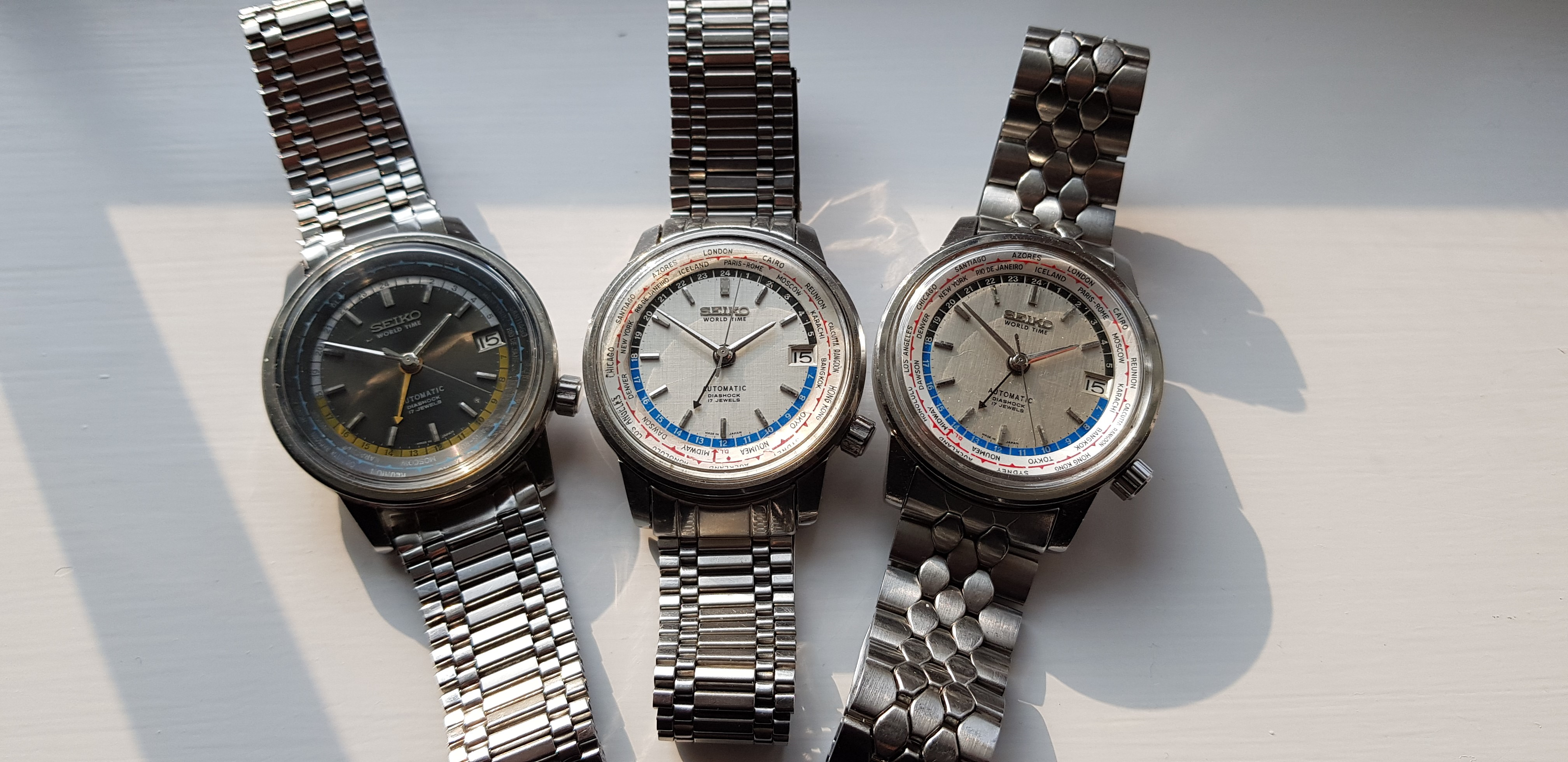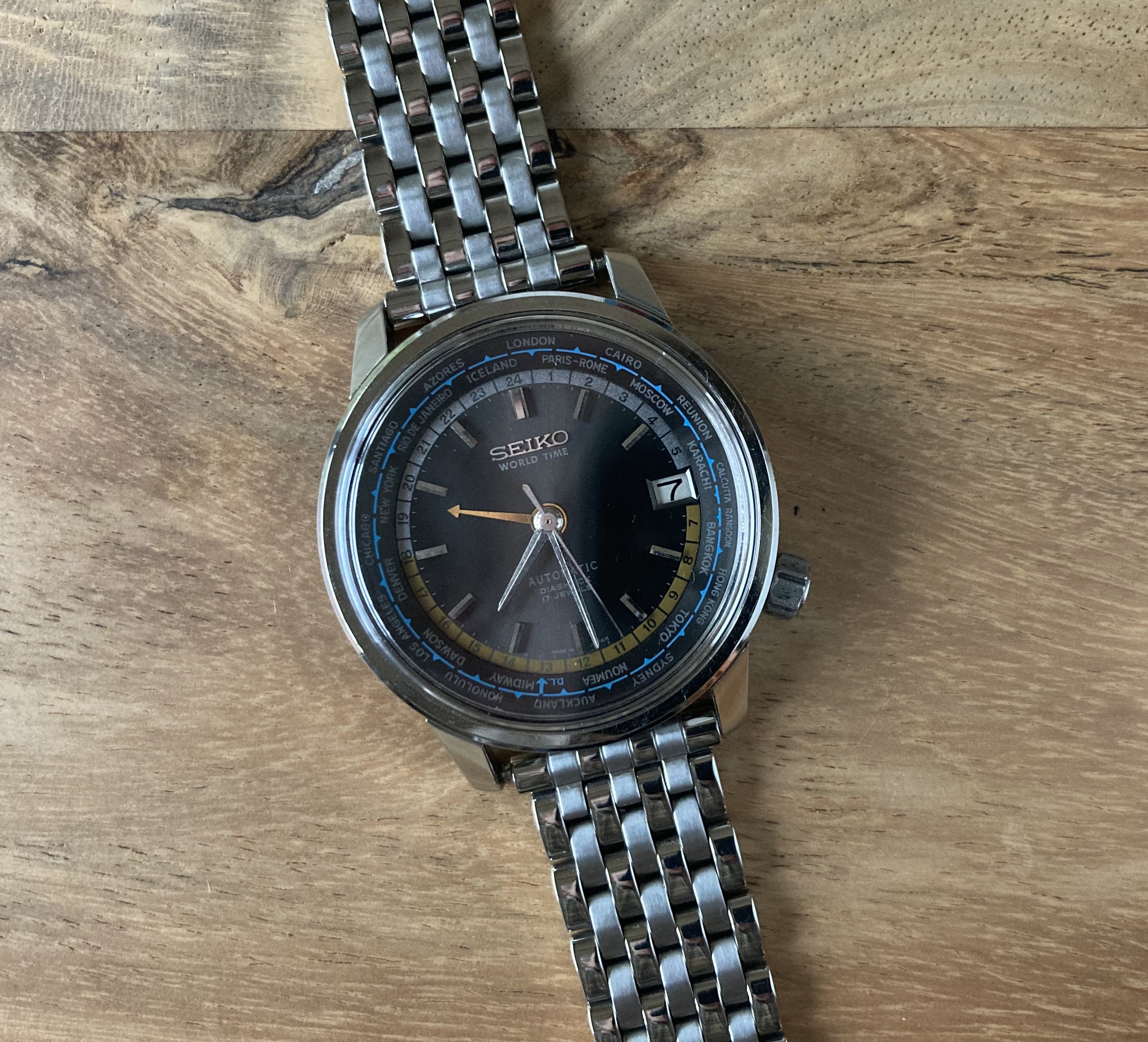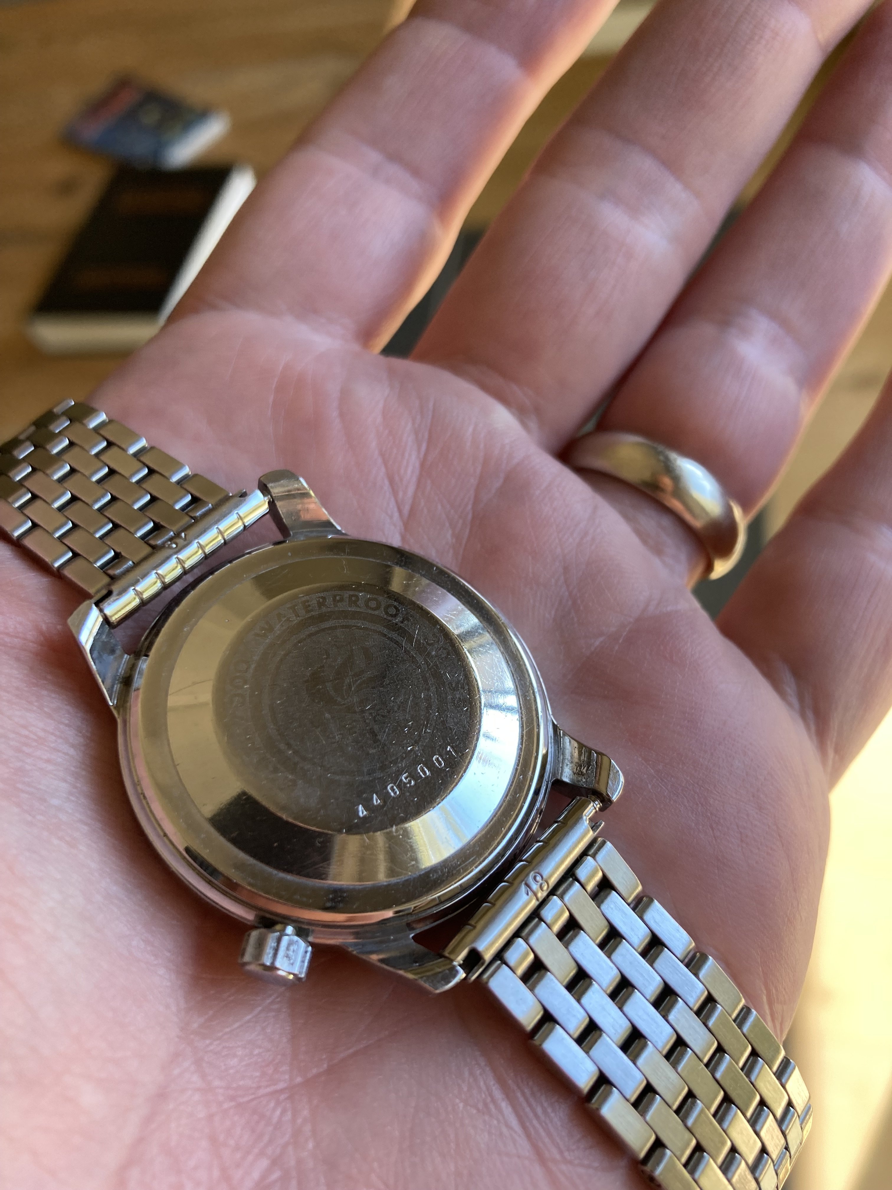 The auction photos showed a nice dial, but I was unsure of the case condition. It turns out to be in pretty good shape, with well-defined edges. The inner bezel ring rotates as it should, which is a handy little feature. The Olympic torch etching on the case back is still visible but pretty worn down, which appears to be common.