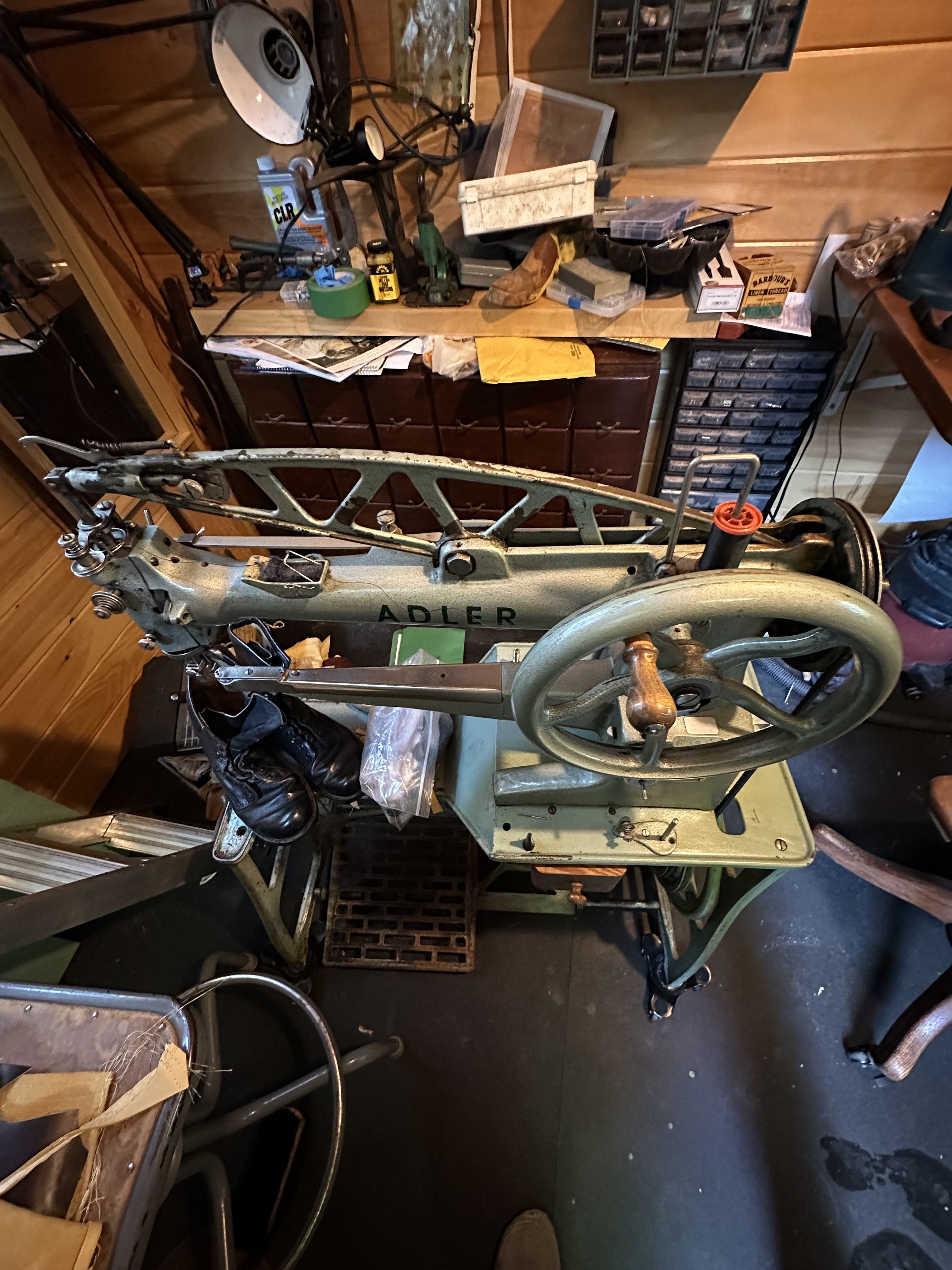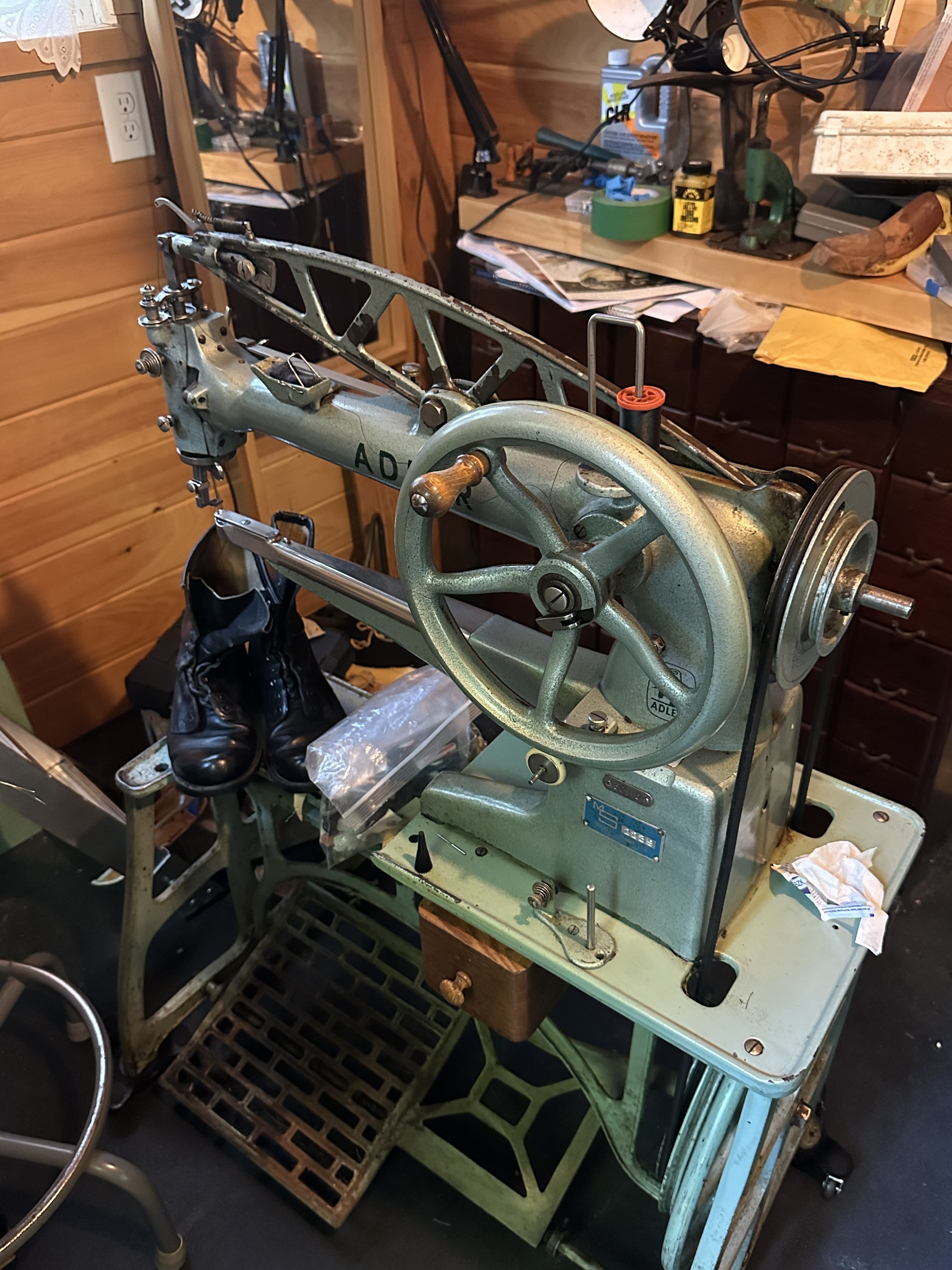I already have two similar machines. A 29K15 circa 1911 and a mid century Adler 30. They must be separated from the table (via four screws) to transport.