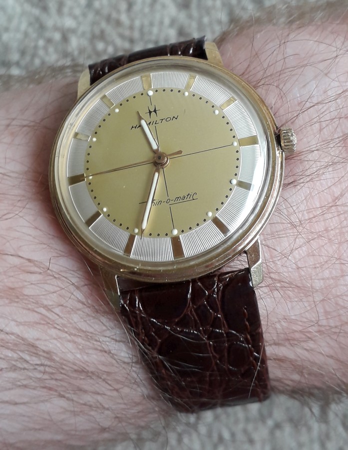 This is the one I'm wearing right now, a Hamilton Thin-o-matic T-451 from 1960 with the Hamilton 663 micro-rotor movement (= Buren 1000A):