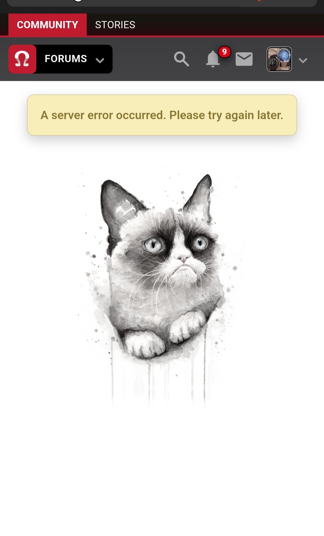It's constant ...typically when I first visit the site and I'm already logged-on, but more so after I log-in. However, the "Sad Cat" page completely goes away and does not re-populate after I click on "Latest" and browse different Threads. It's certainly not a huge issue, but I thought you would want to know. For your information, I view OF using my Samsung phone with Brave as my browser.