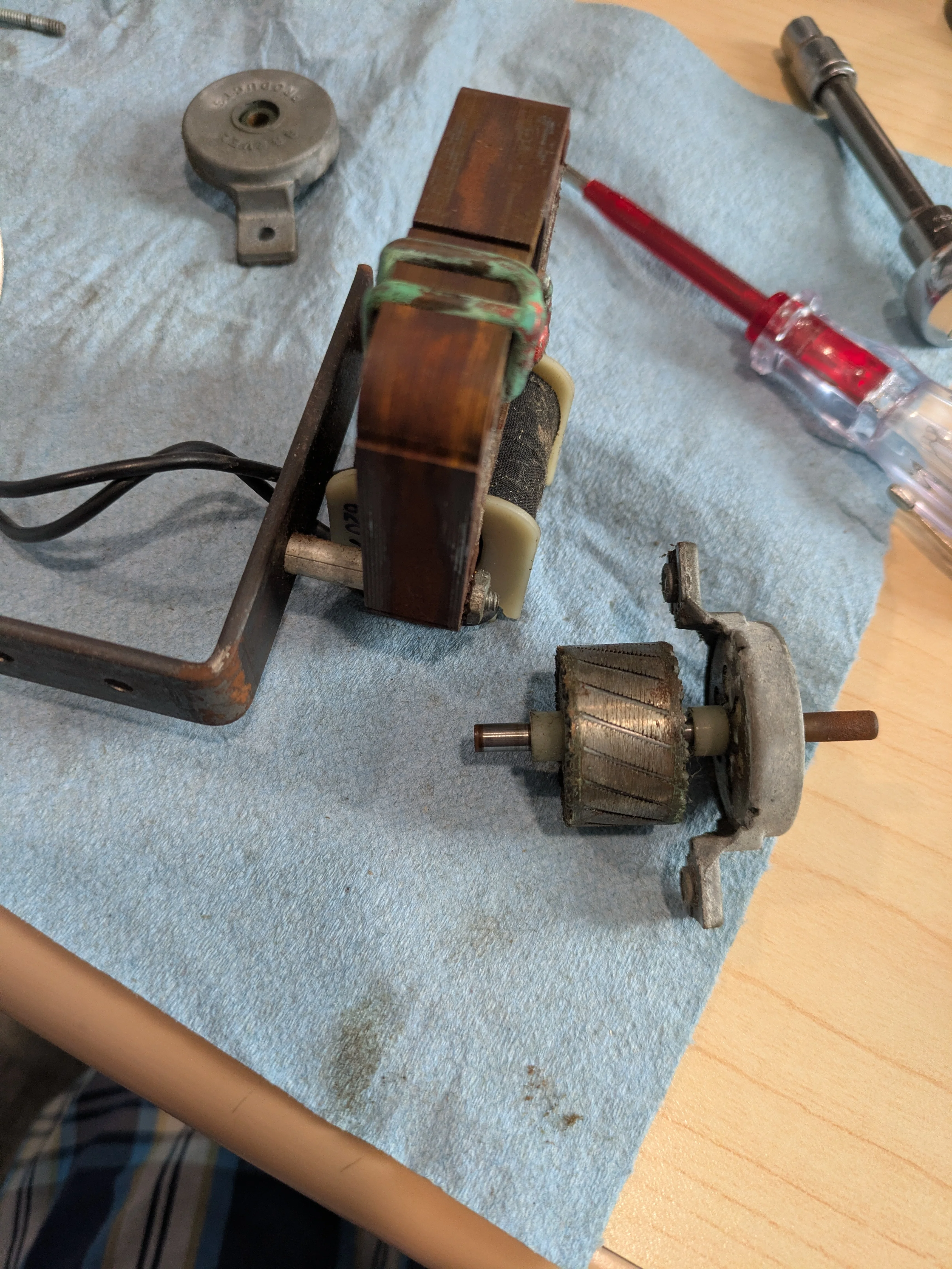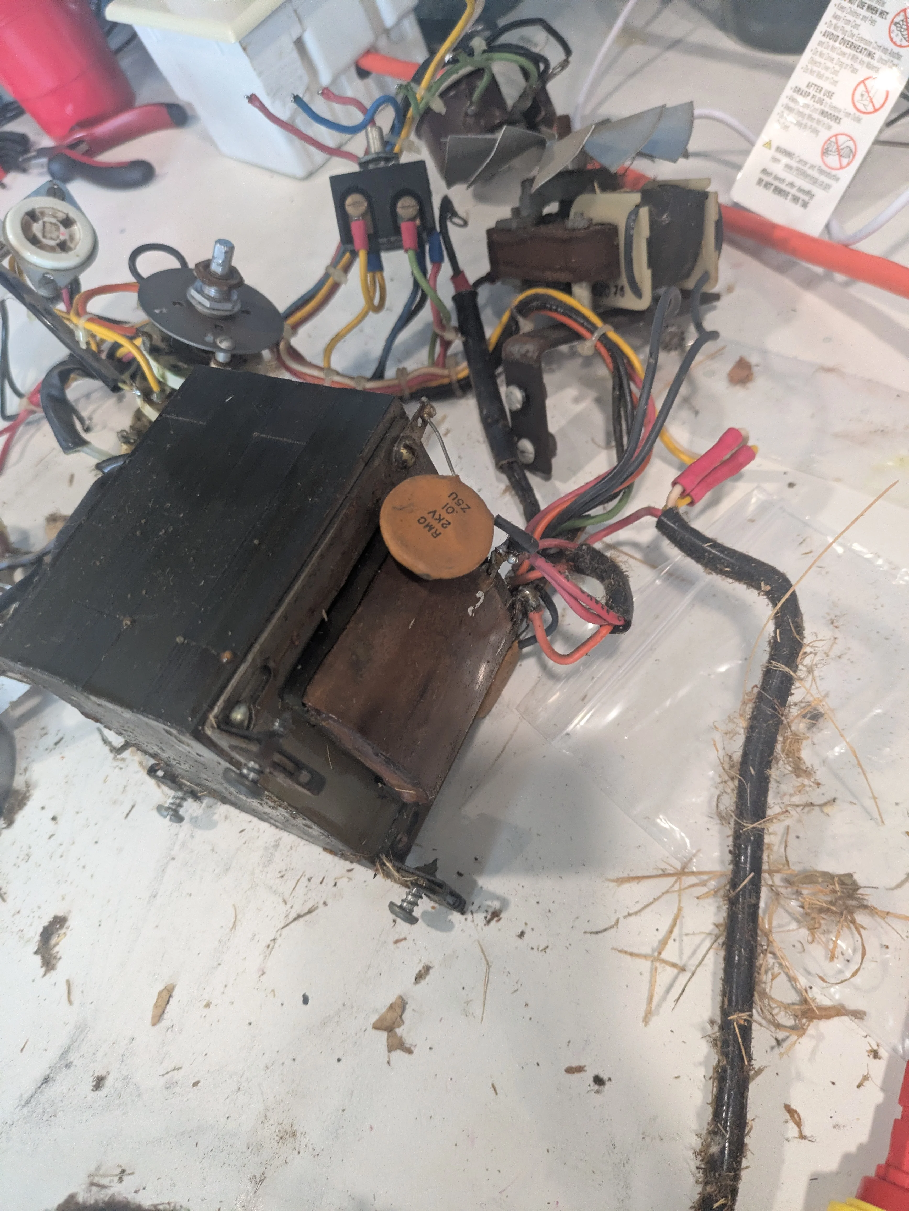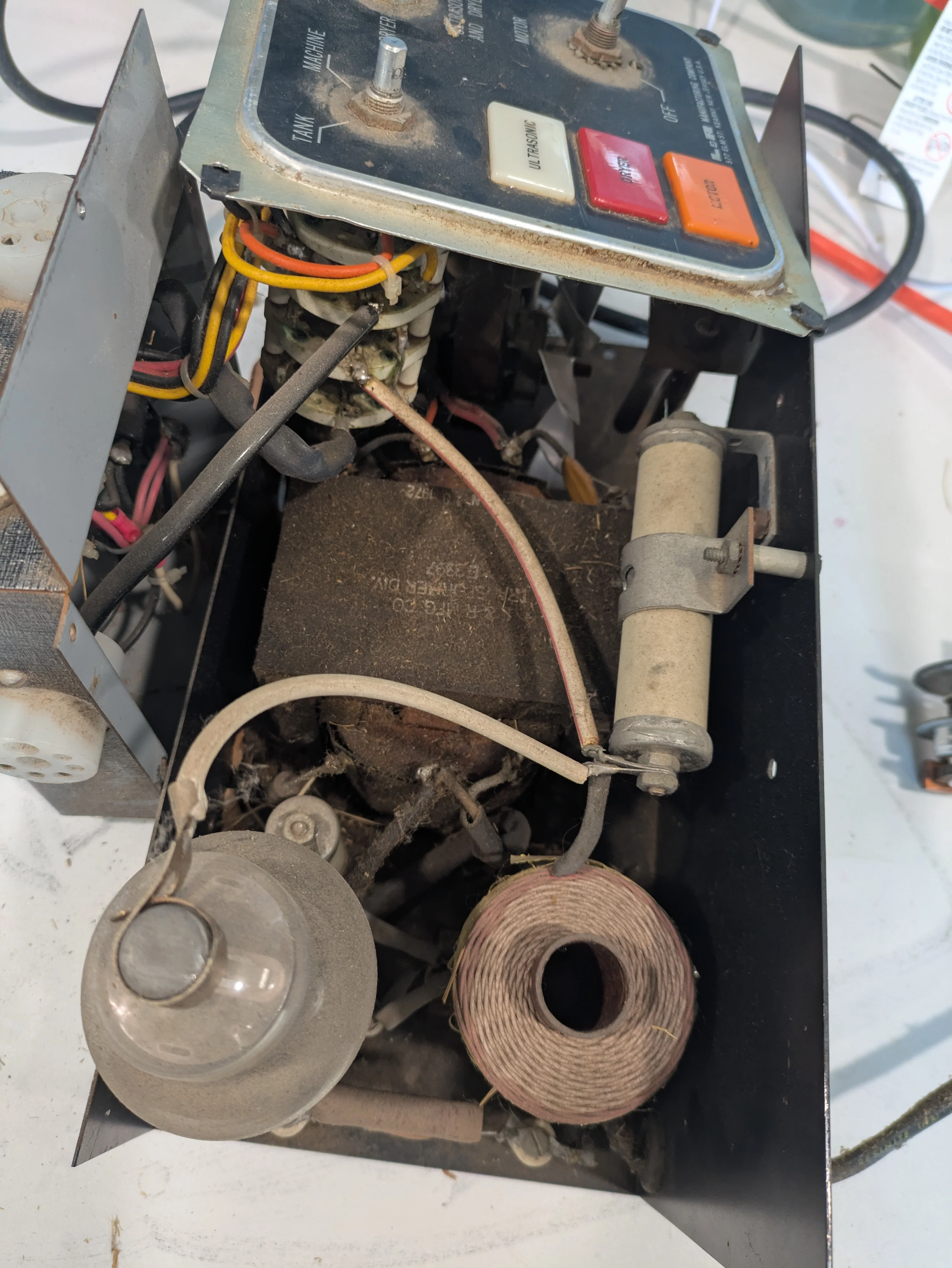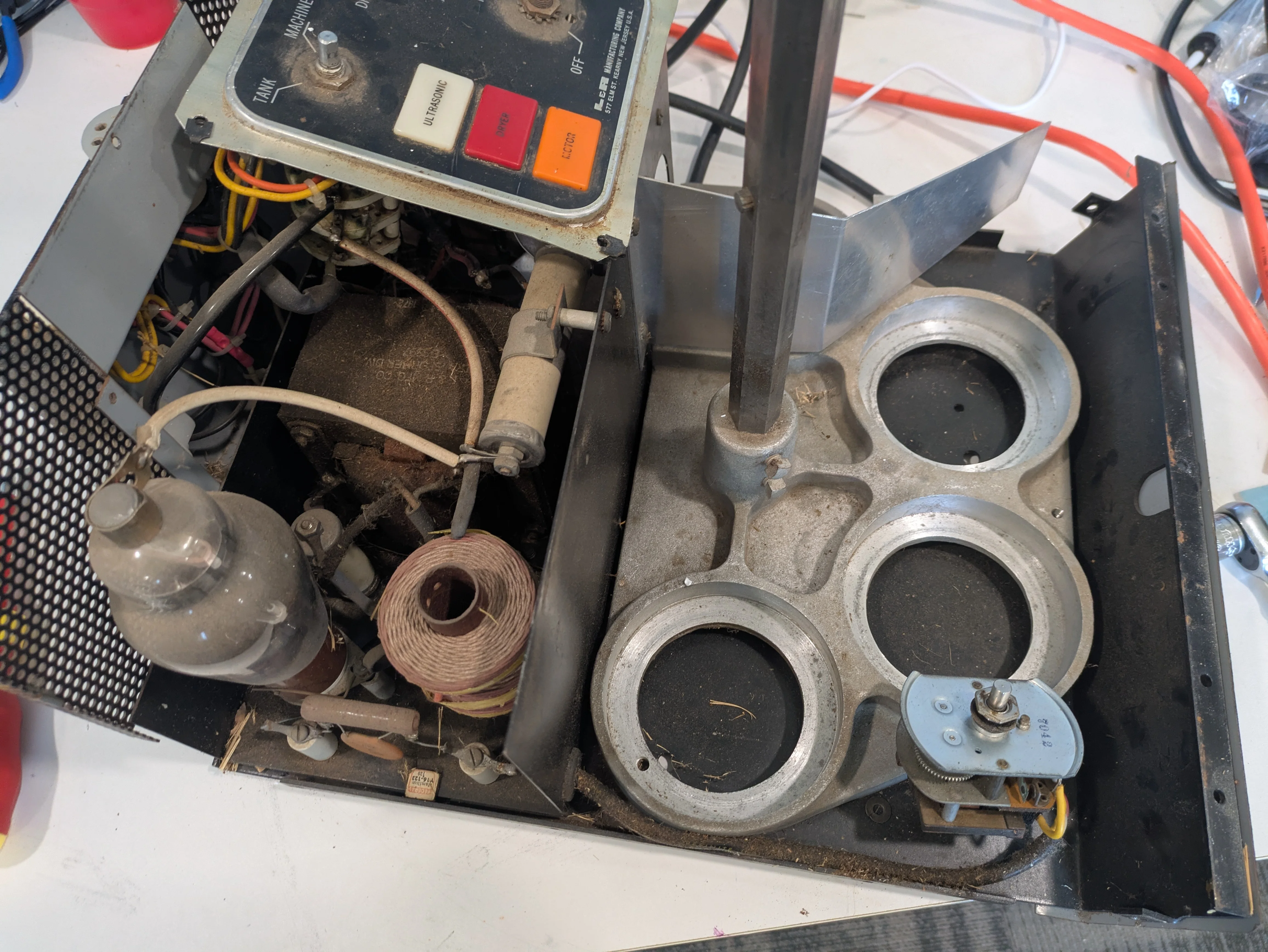 I spent a few hours disassembling it today. I took plenty of pictures, and have to figure out what needs repair. I presume all of the switches dirty/need cleaning in SOME way, and I'm sure there are some other components that need help. My next step is probably going to be to give it a good clean, and try to figure out the wiring diagram. The machine is FILTHY, there is grime and grossness all over the machine, plus some grass, webs, and bugs throughout. I'm guessing this lived in a barn for a while. I ALSO haven't even dug into the head, where the motor and transducer are. The brushes no doubt need some TLC, and the wiring that goes into the head has a busted grommet at least, so I'll have to poke at that as well.