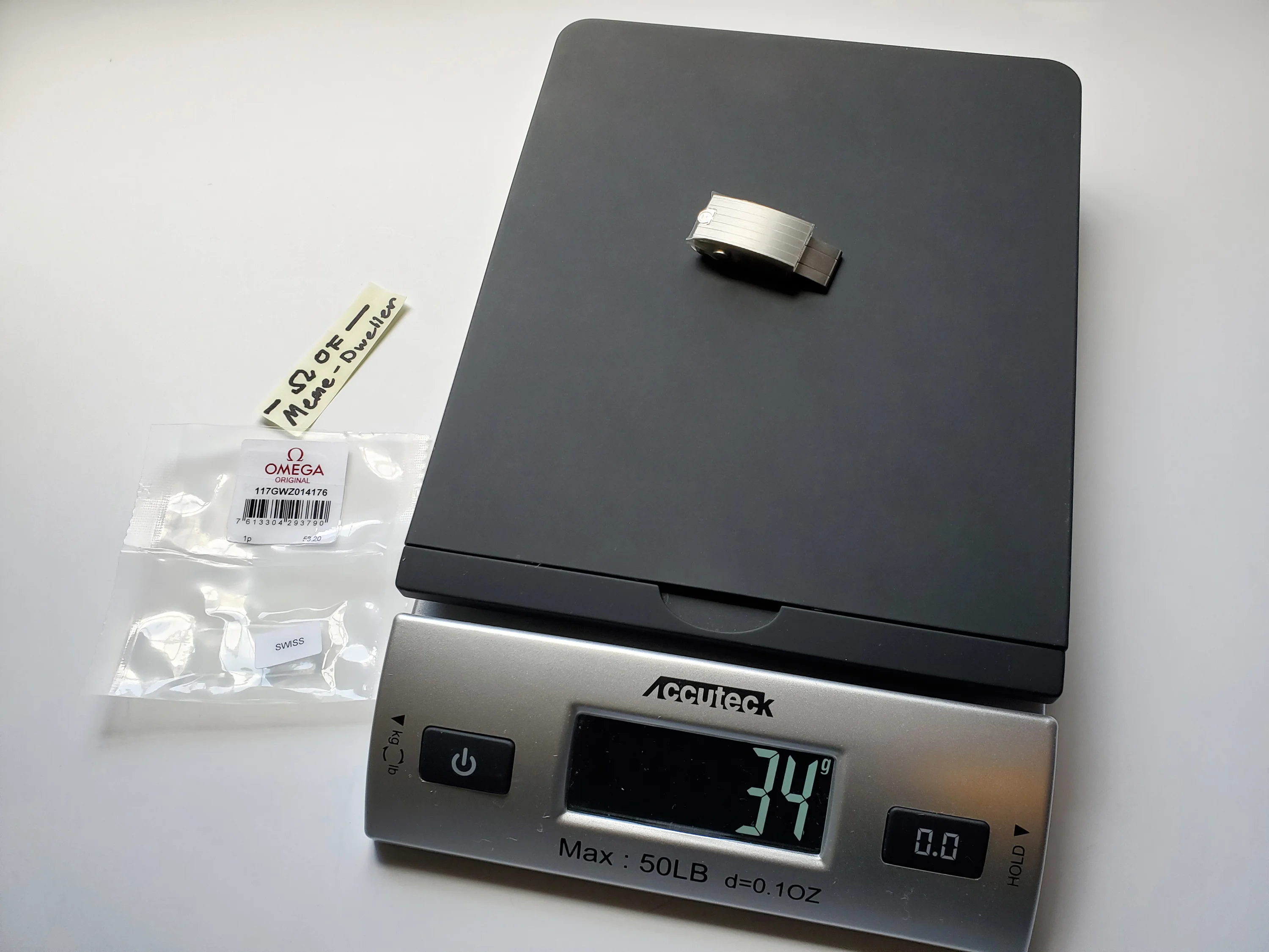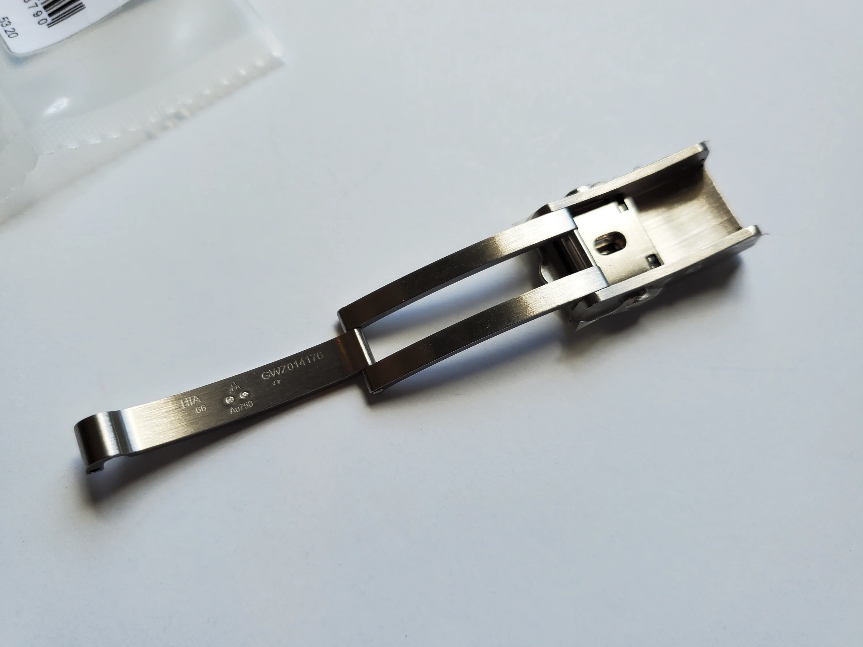 ยทUp for sale is a new & unused genuine Omega Canopus white gold clasp for the 3861 Speedmaster (310.60.42.50.02.001). Still has a protective sticker on the clasp. Width is 15mm for the 20mm bracelet. This is the non-push button version. Also includes a spring bar and a tube/collar (not pictured).