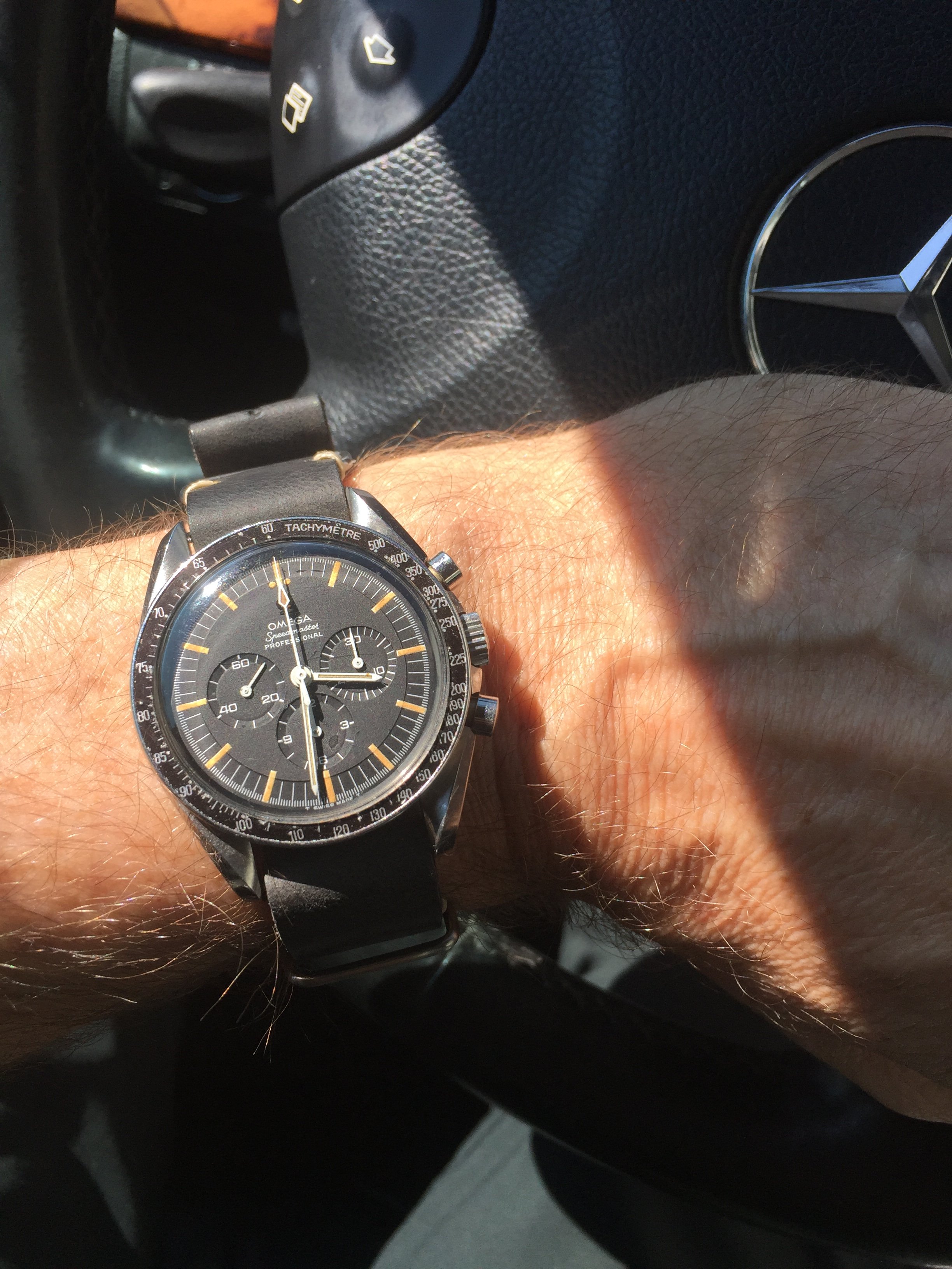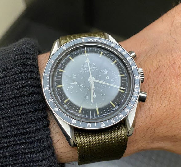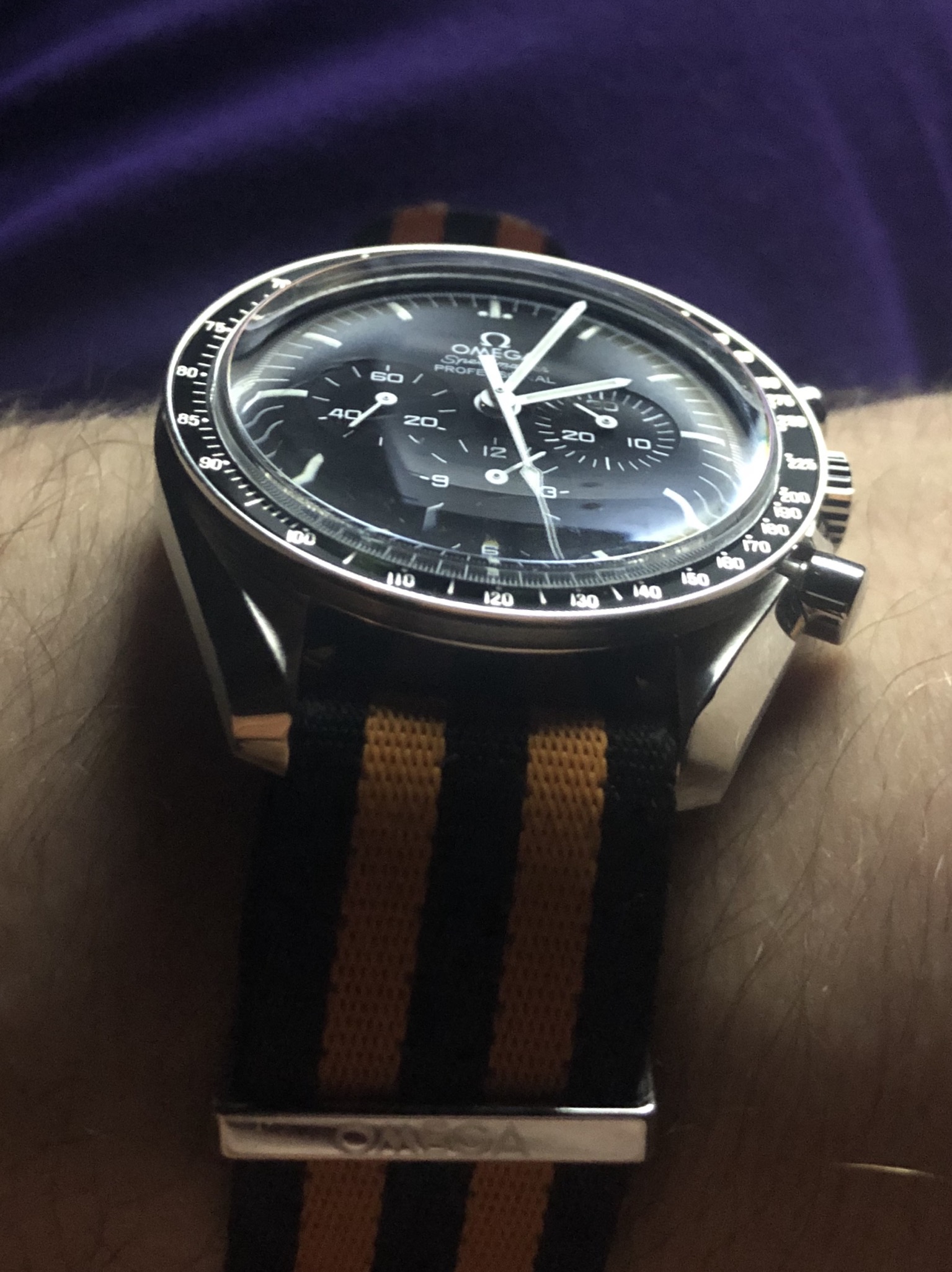 Congratulations! My Speedmaster was the first high end Omega I ever purchased. Still one of my favorite watches! Since you have impeccable taste, may I suggest spending a little more and obtaining a genuine Omega Nato strap. They are ridiculously expensive and perhaps, at least to some, a rip off. However, I think they are worth every cent. I almost exclusively were mine on one of my many genuine Omega Nato straps. Just a suggestion/recommendation.