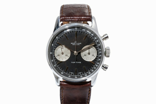 This watch appears to be a 1961 or 1962 Breitling Top Time chronograph.