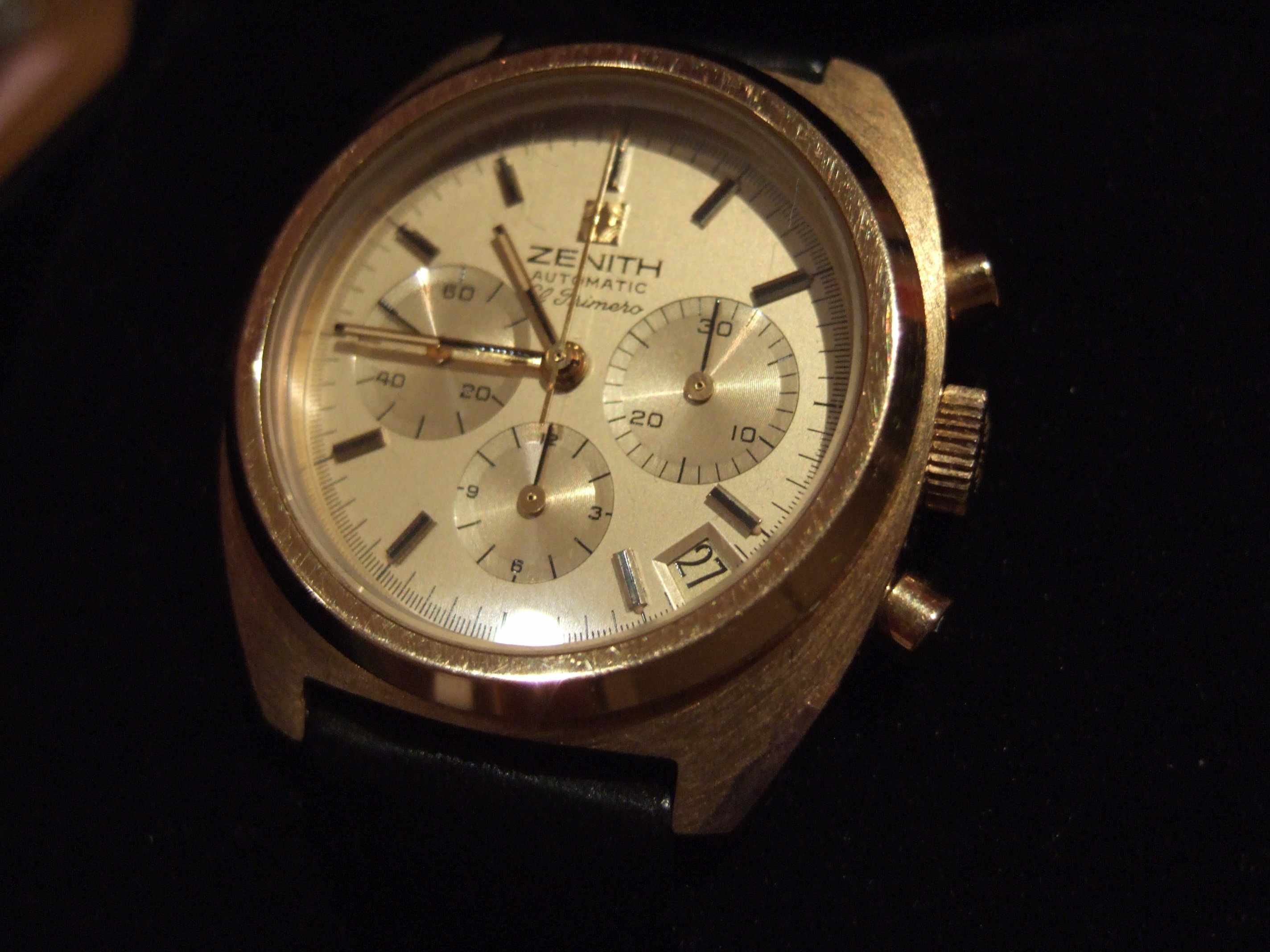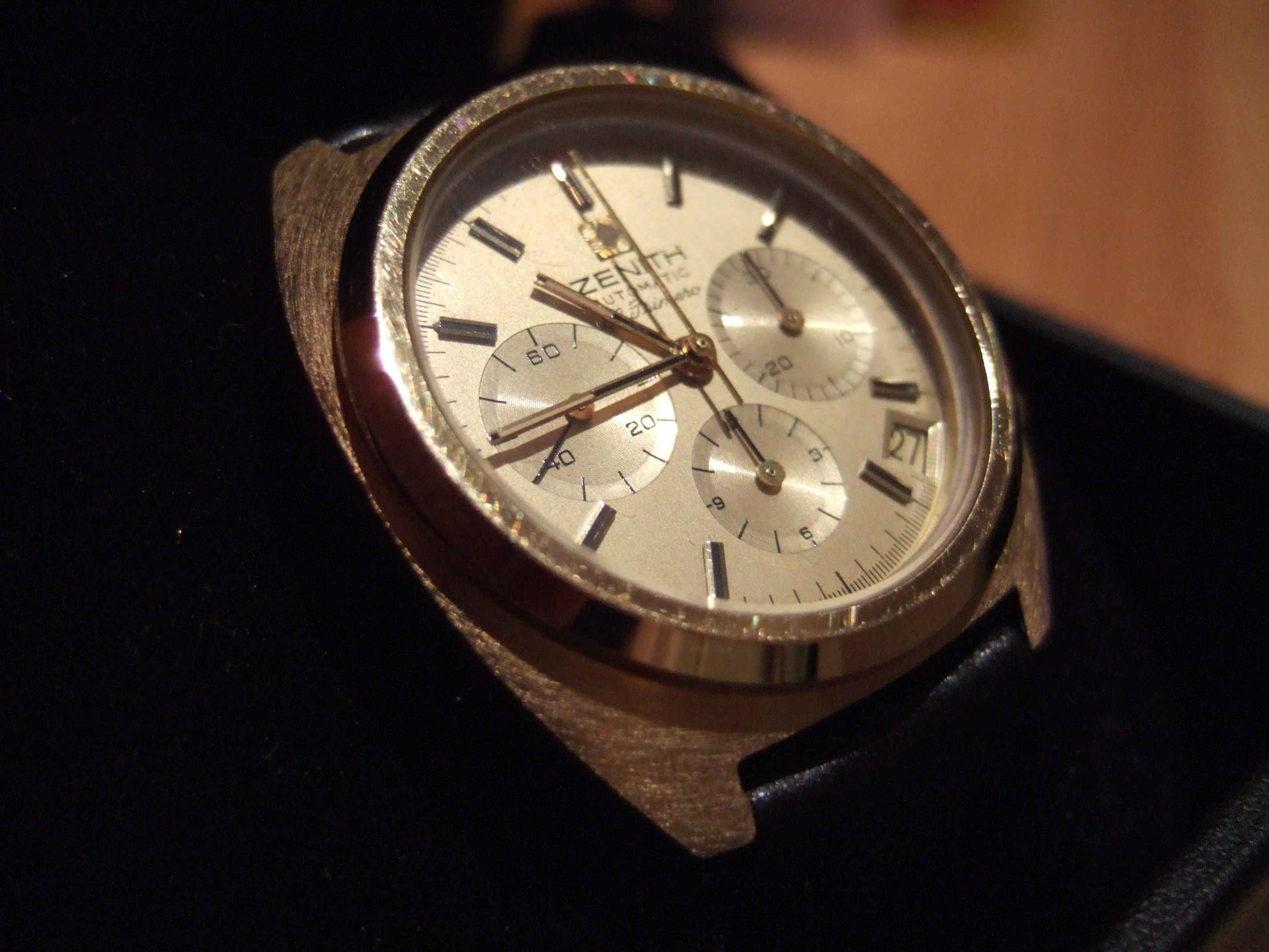 ·Hello all, I've been lurking for some time and have found the forum an invaluable help in educating myself about vintage Zenith watches. I have a copy of Rossler and had hoped to start off my Zenith collection with something a little more iconic than a C cased El Primero but I was unable to pass up this opportunity; A NOS 20.0210.415. I believe that the strap may be original too as it seems to match the photos of LouS's NOS example of the same model. I apologise for the harshness of the lighting in the photos but until I get some daylight, artificial point source will have to do!
