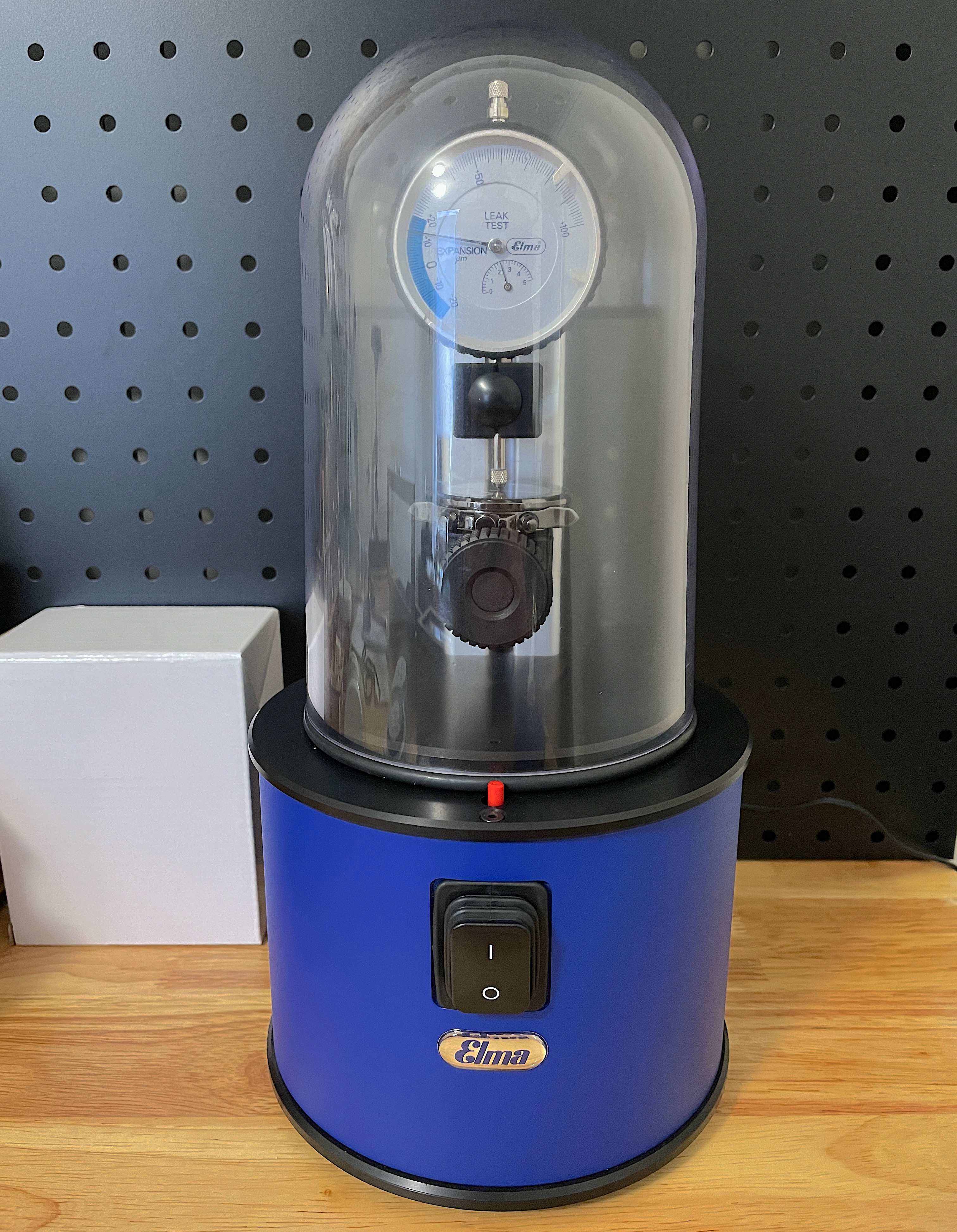 The watch is placed on a platform under a dial indicator and the probe is placed on the crystal and the dial gauge set to zero. The cover is put on and the vacuum pump is run for about a minute. If the watch leaks like a sieve, the needle will not move.