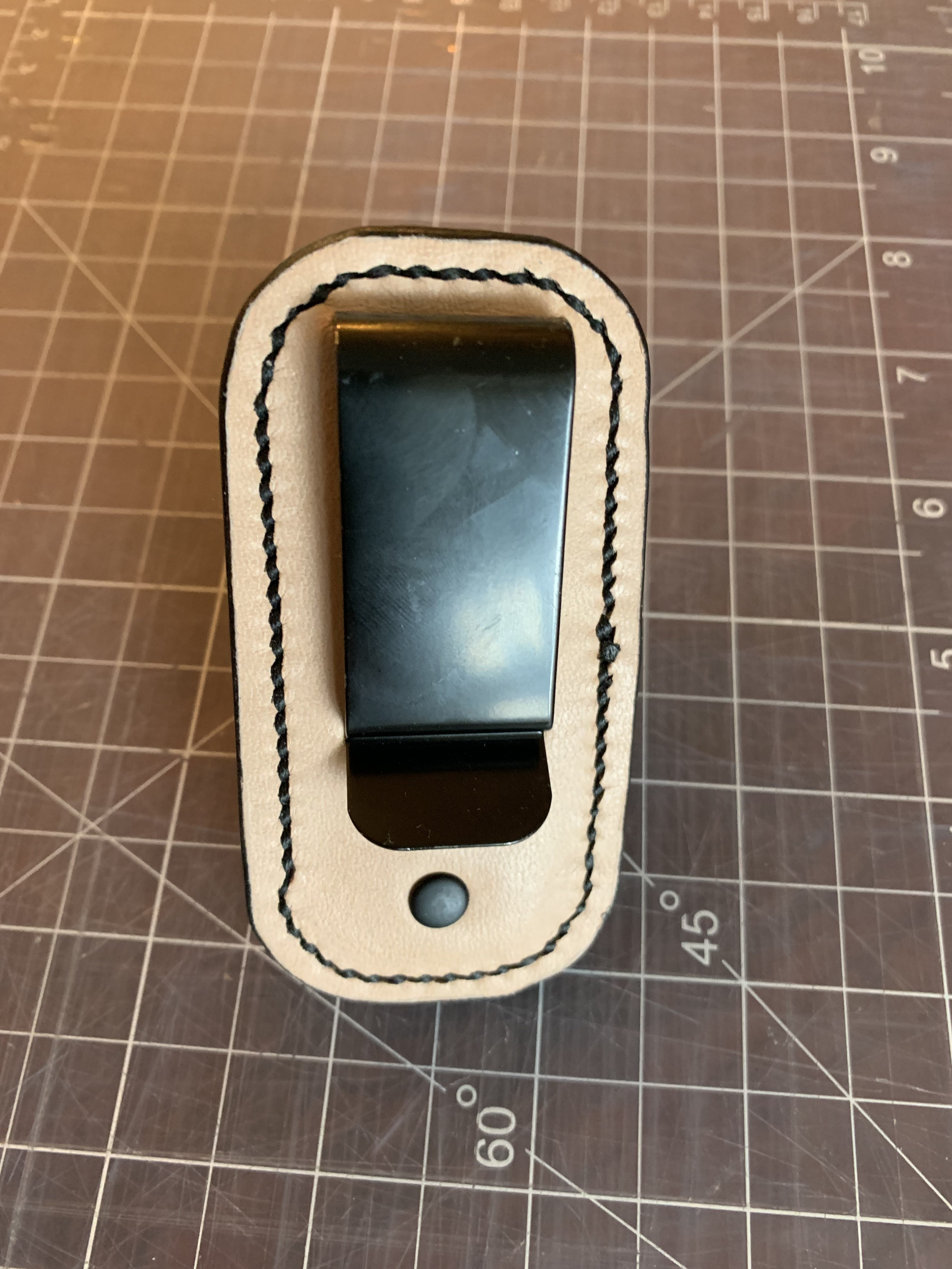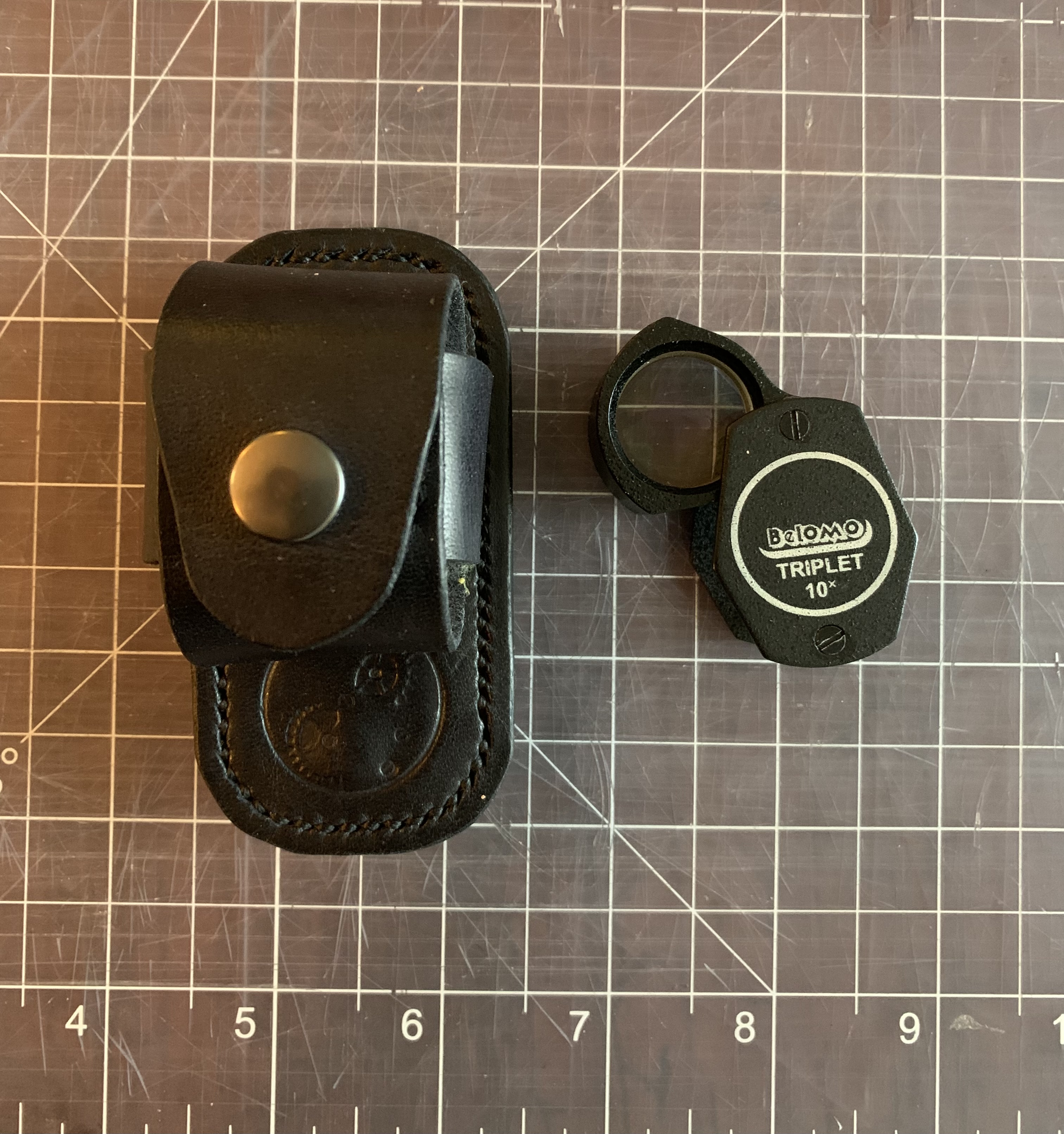 My thinking behind this was “where the heck is a good place to keep your loupe when out at a flea market or antiquing?”. This holster, I believe, is the answer. The only thing I can think to do differently next time is to use a less aggressive belt clip, this one is stiff enough to hold a cannon on your hip during a triathlon. Any feedback, pro or con, is encouraged. The holster holds a standard loupe, as shown.