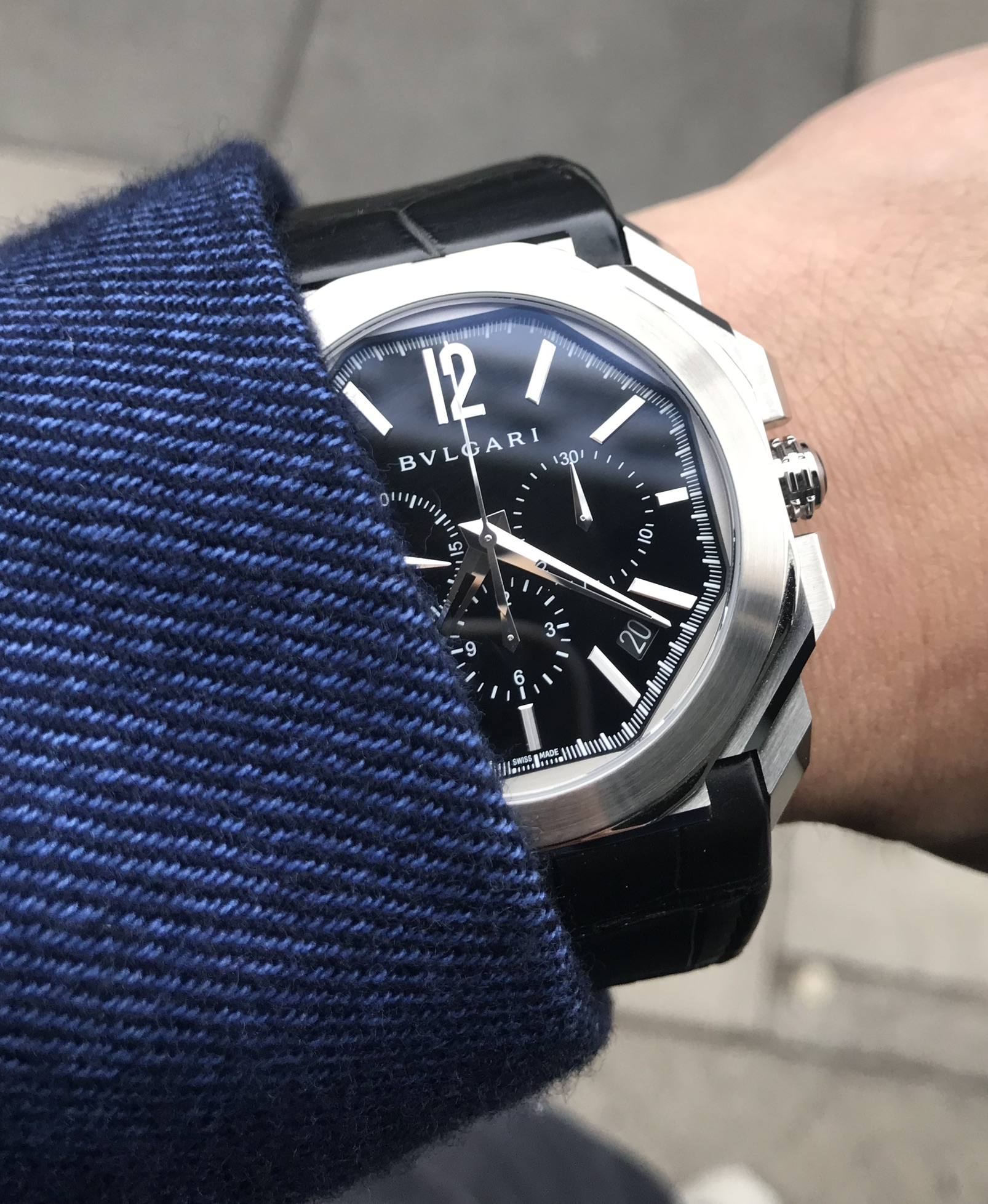It is quite rare that I visit dealers to see a watch in person because I tend to feel completely out of place in the luxury environment, but for this watch I made an (unfortunate) exception. I visited a Bvlgari boutique who's staff is unfortunately not very knowledgeable and try too hard to make a sale. On the occasion I visited they only had one Octo Finissimo in their display, and I was surprised to see that the black cabochon/onyx on the crown had fallen off (leaving only a spot of glue). I pointed it out to the salesperson that the watch for sale is faulty, but they pretty much shrugged and didn't seem that bothered. Despite this experience, I am still very enthusiastic about the watch itself (less so about the sales staff).