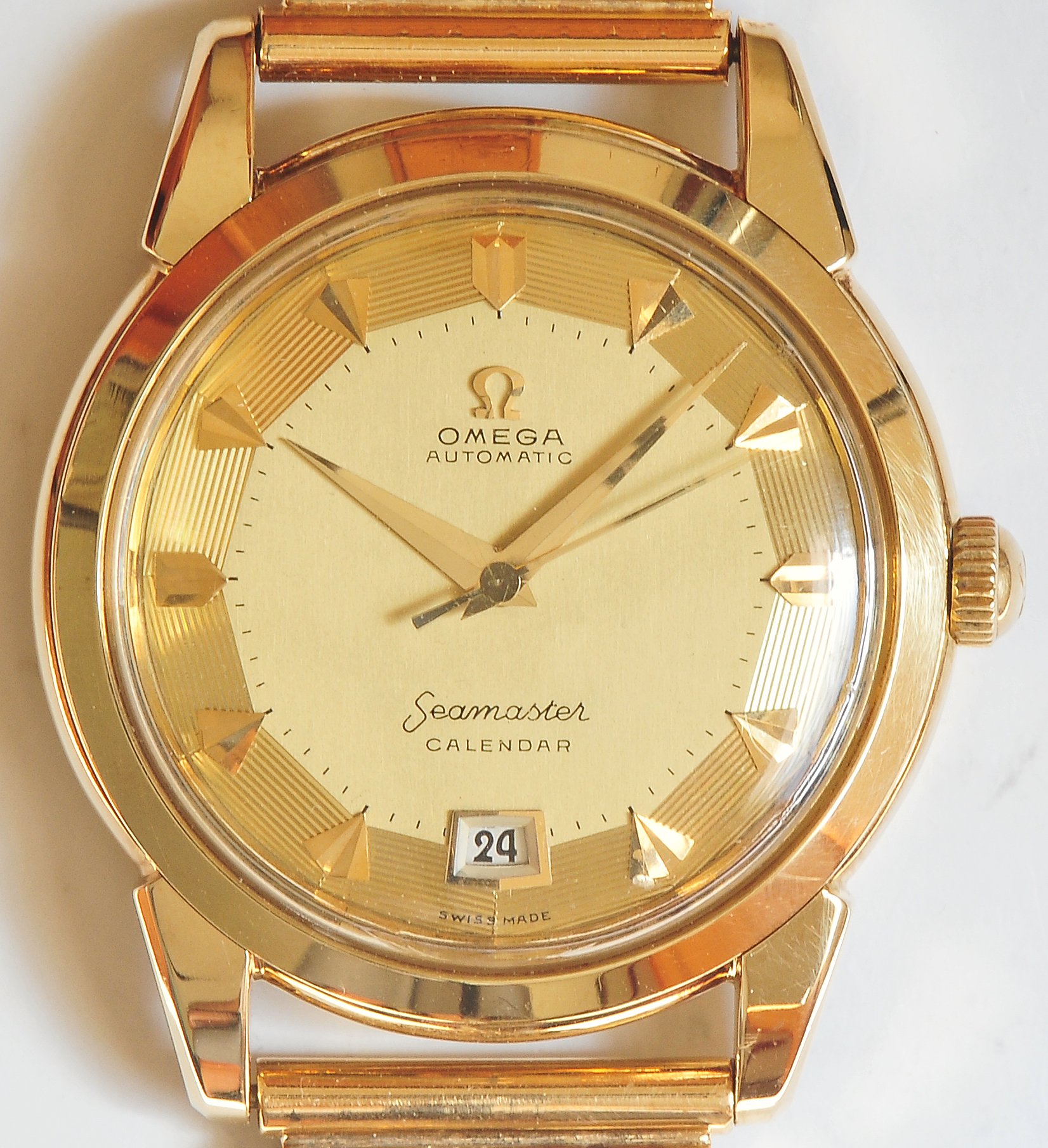 Powered by the Calibre 353 bumper automatic movement, only a tiny number were produced with few clean examples surviving. This example has been kept quite original with the second hand being the only replacement part. Several variants of Seamaster Deluxe Pie-pan exist, with the stepped date at six being the most uncommon, with the majority of watches being originally delivered to Mexico in the 1950's.