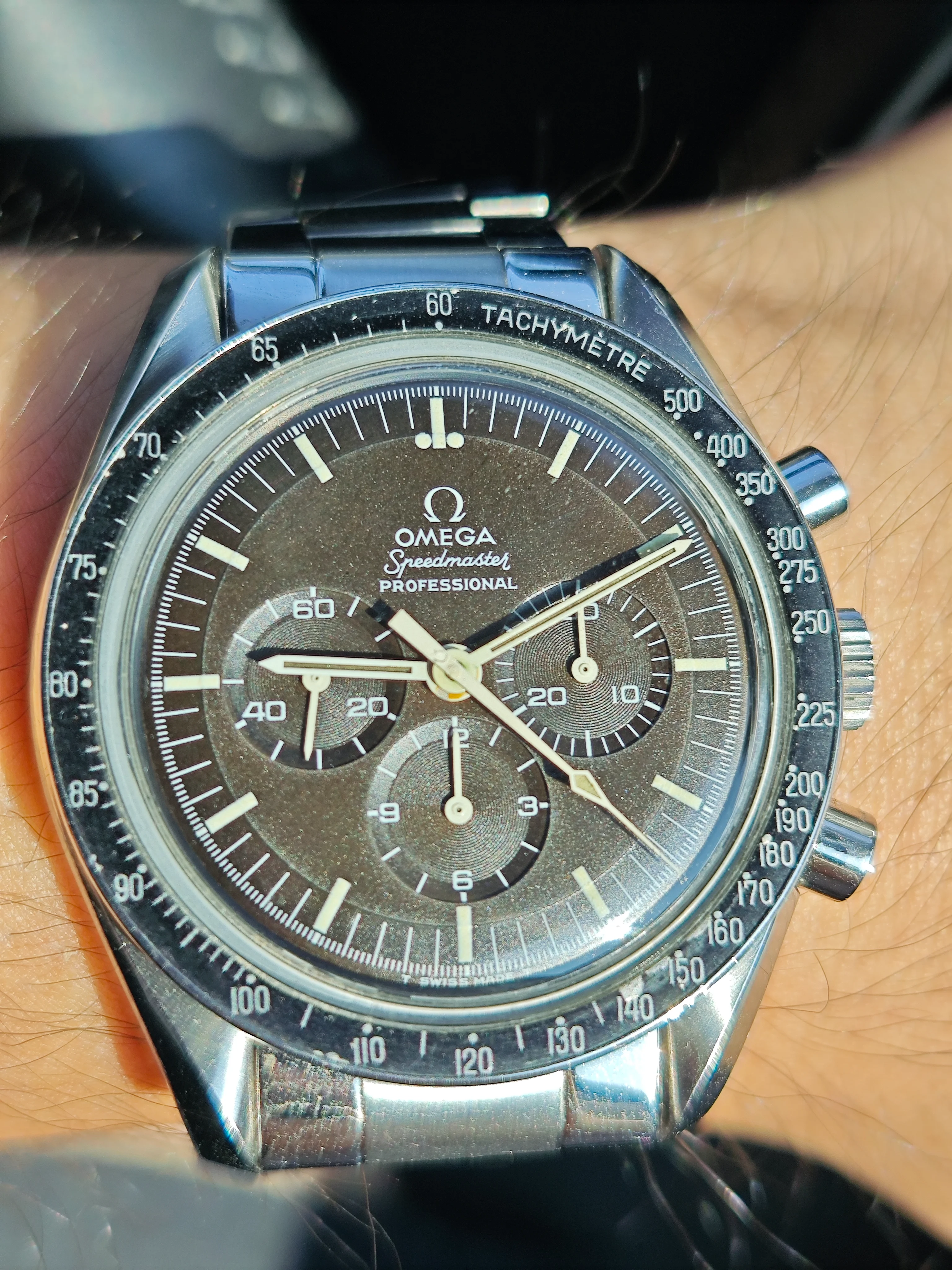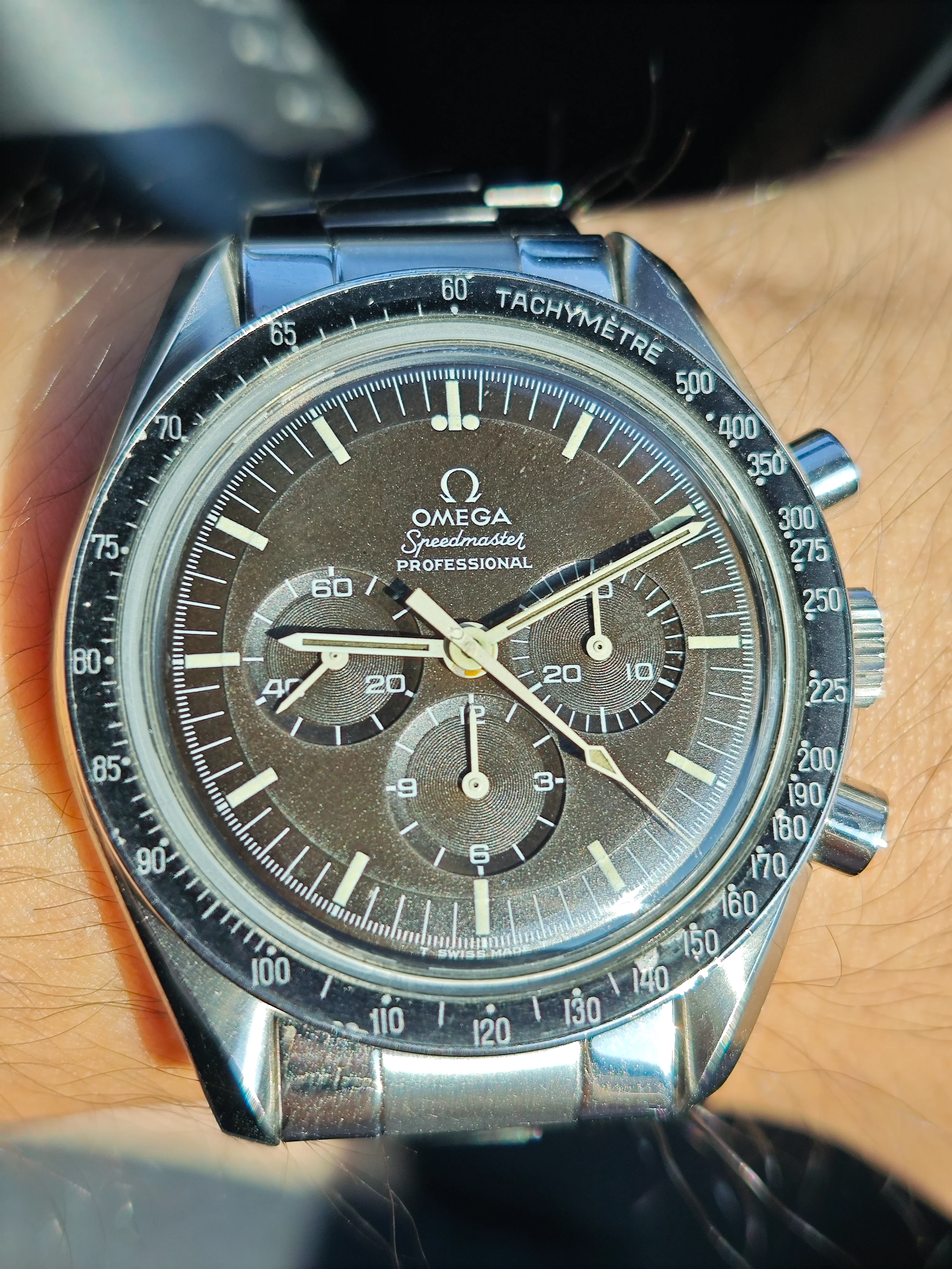 The glossy grainy dial is in perfect condition, showing a brown hue. The lume looks original to me. They are regular, flat and clean. Although different colors of lume on dial and hands, this is pretty common on a 145.022-69.