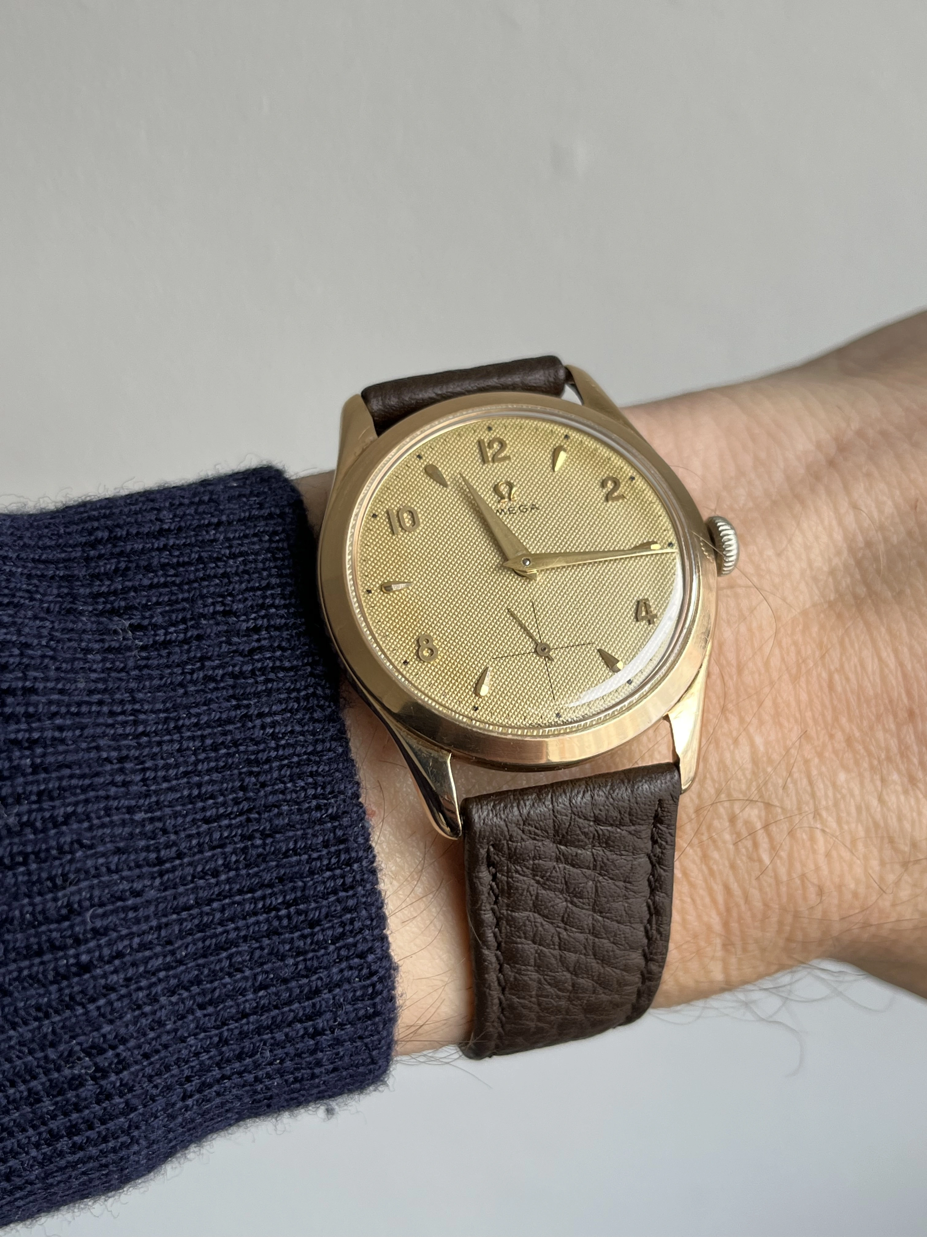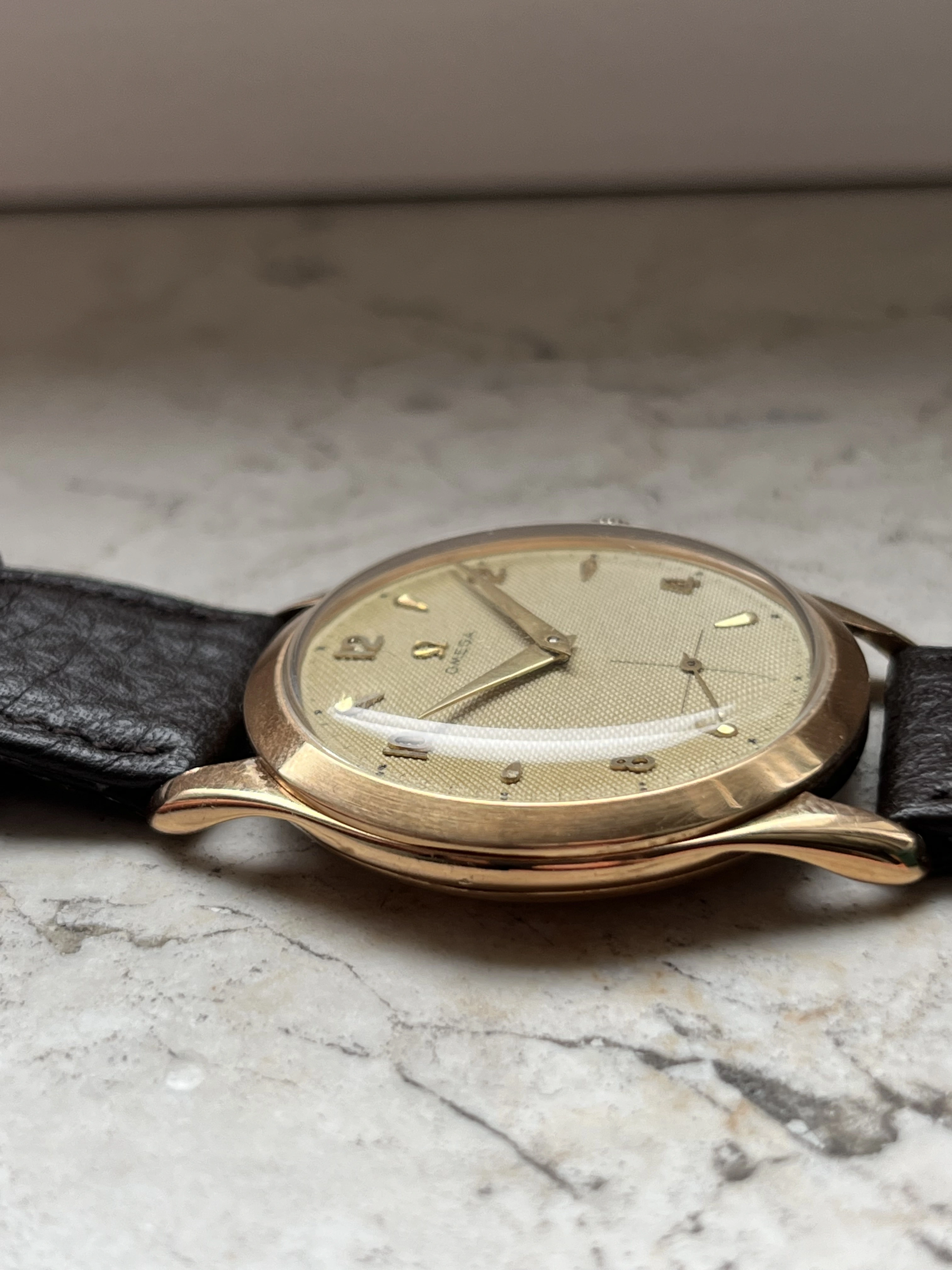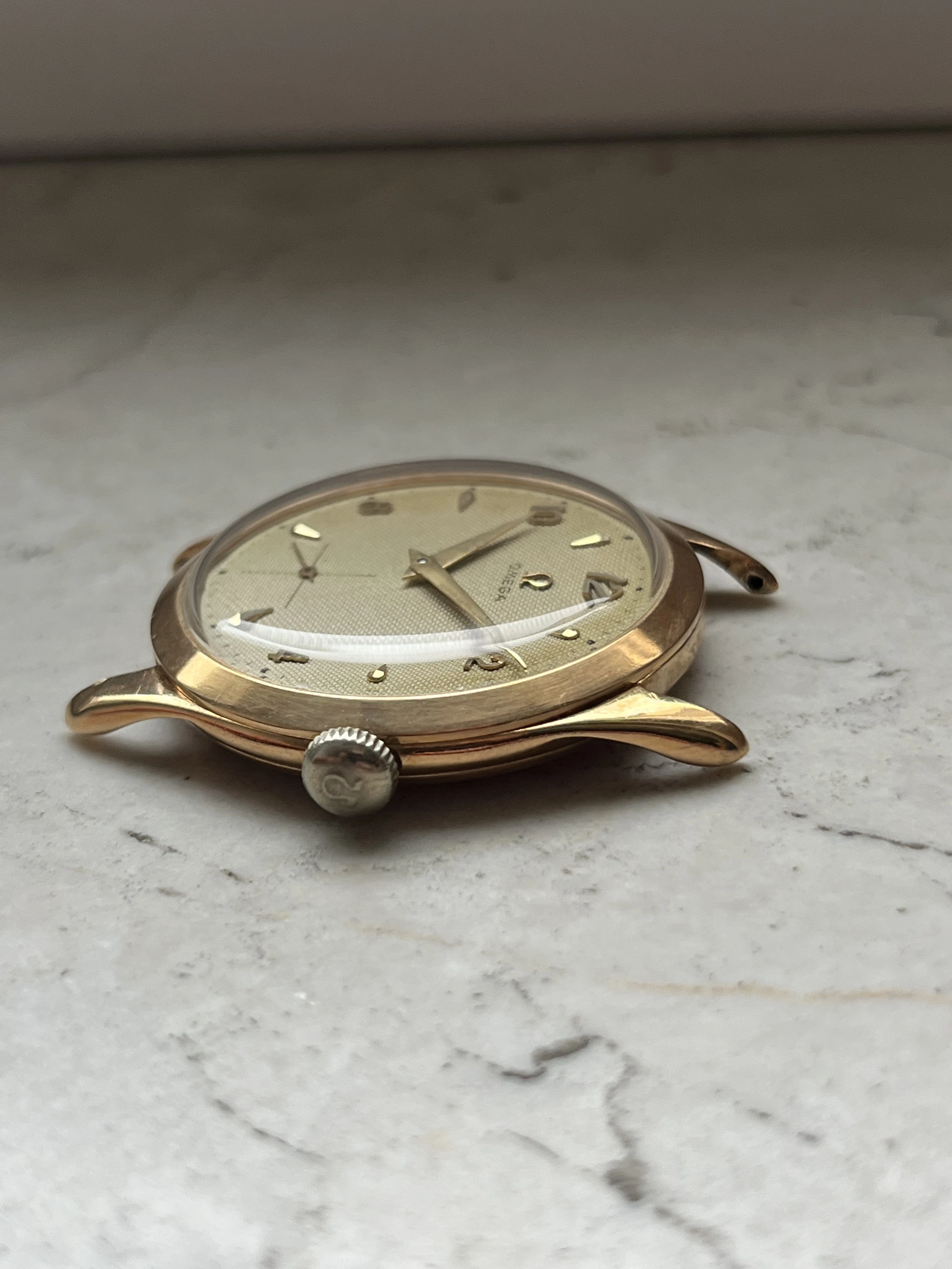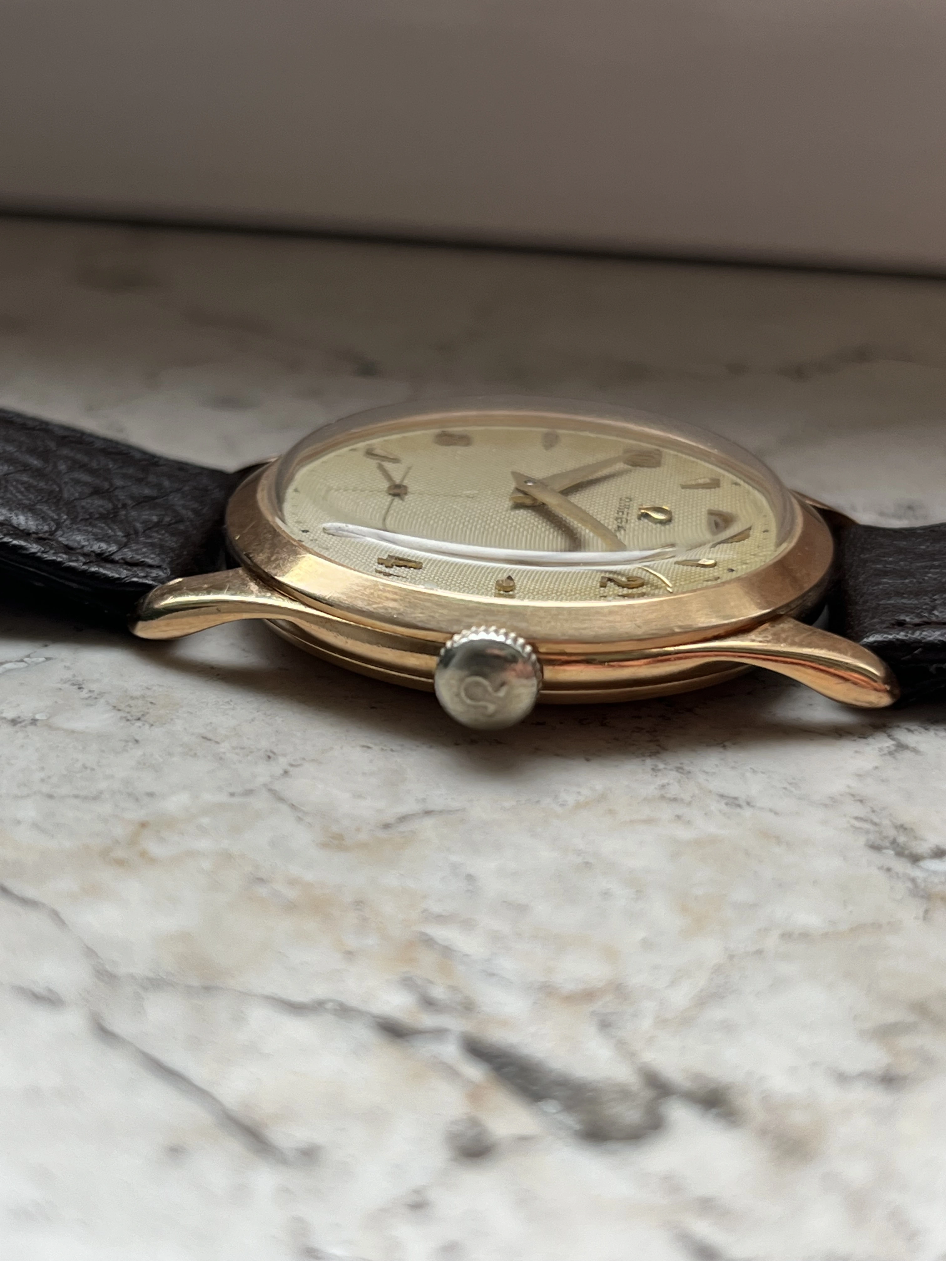 Case: The watch is with its 36mm 14k gold case quite large for its age and will fit many wrists very well.The case is in very good condition without any significant damages. The crystal is original with the Omega stamp in the middle. The crown is original but has lost a bit of its colour as visible in the pictures.