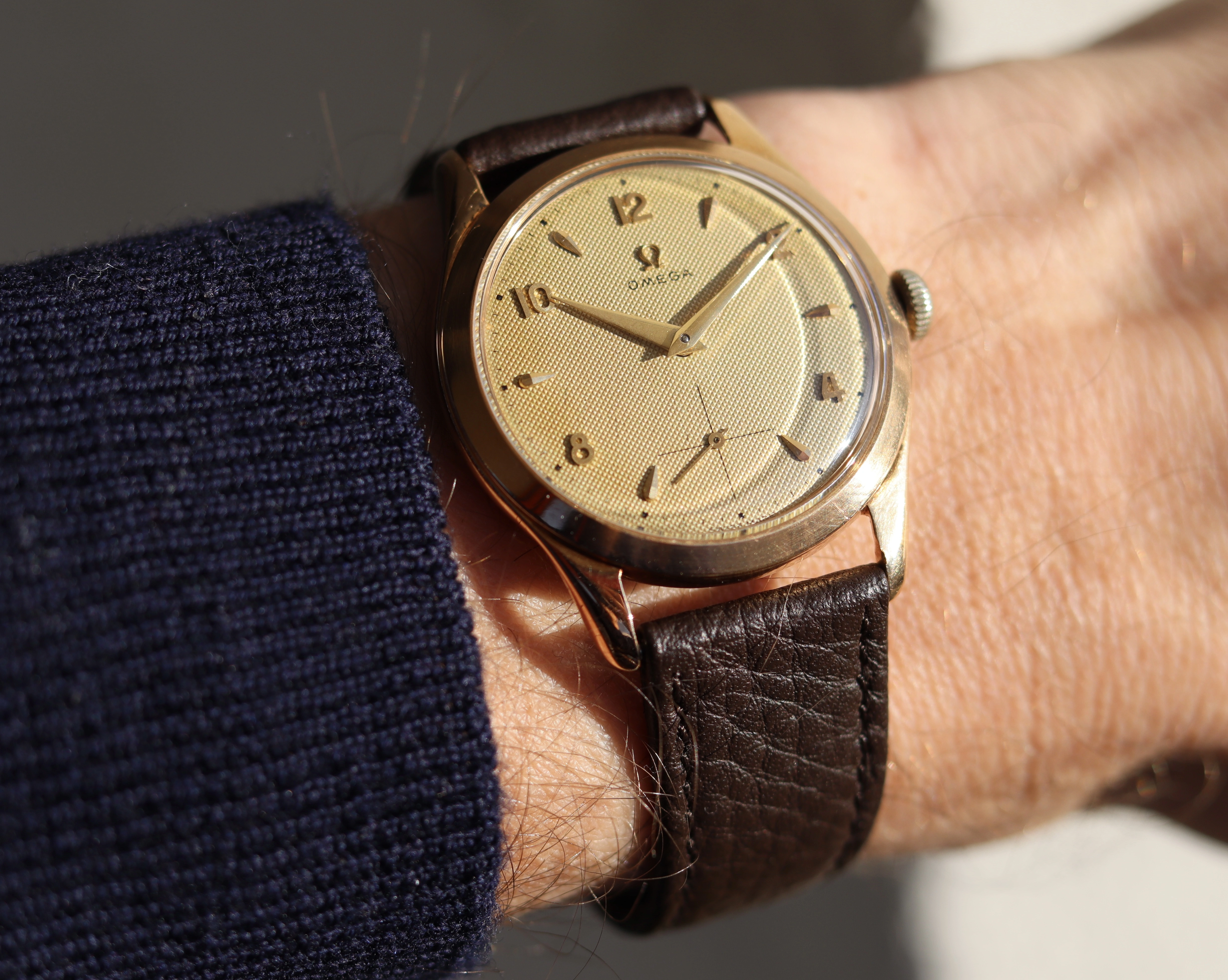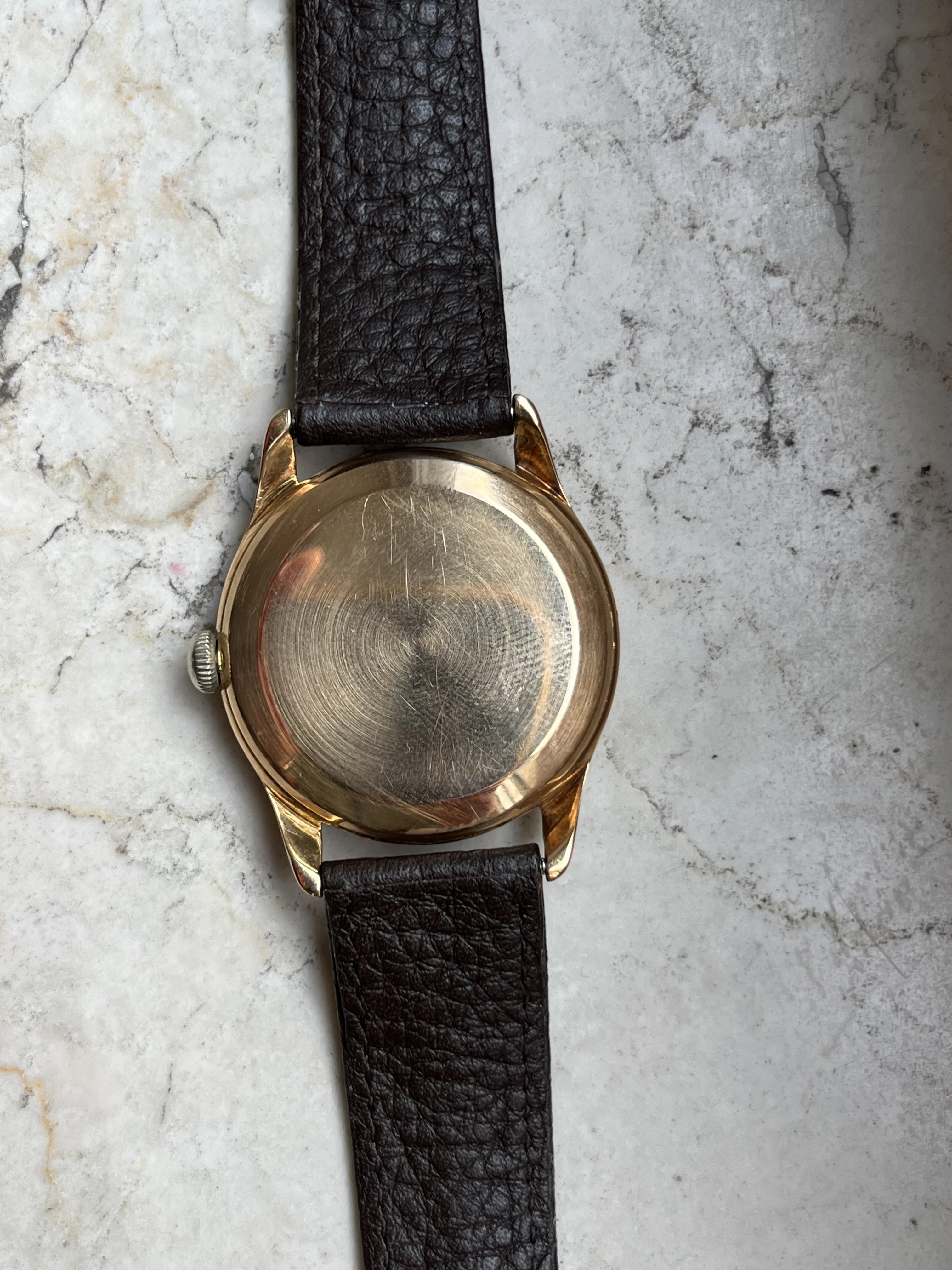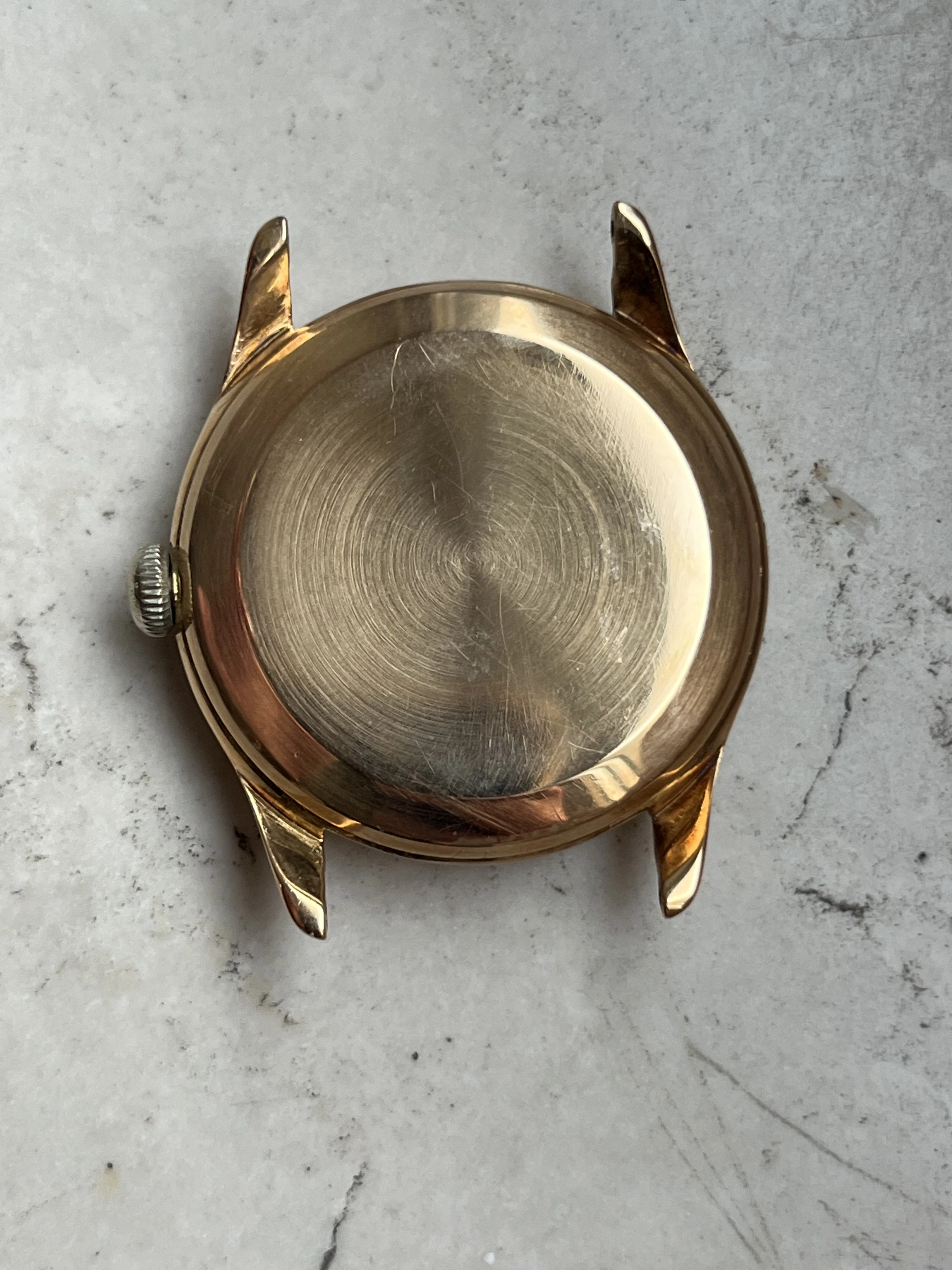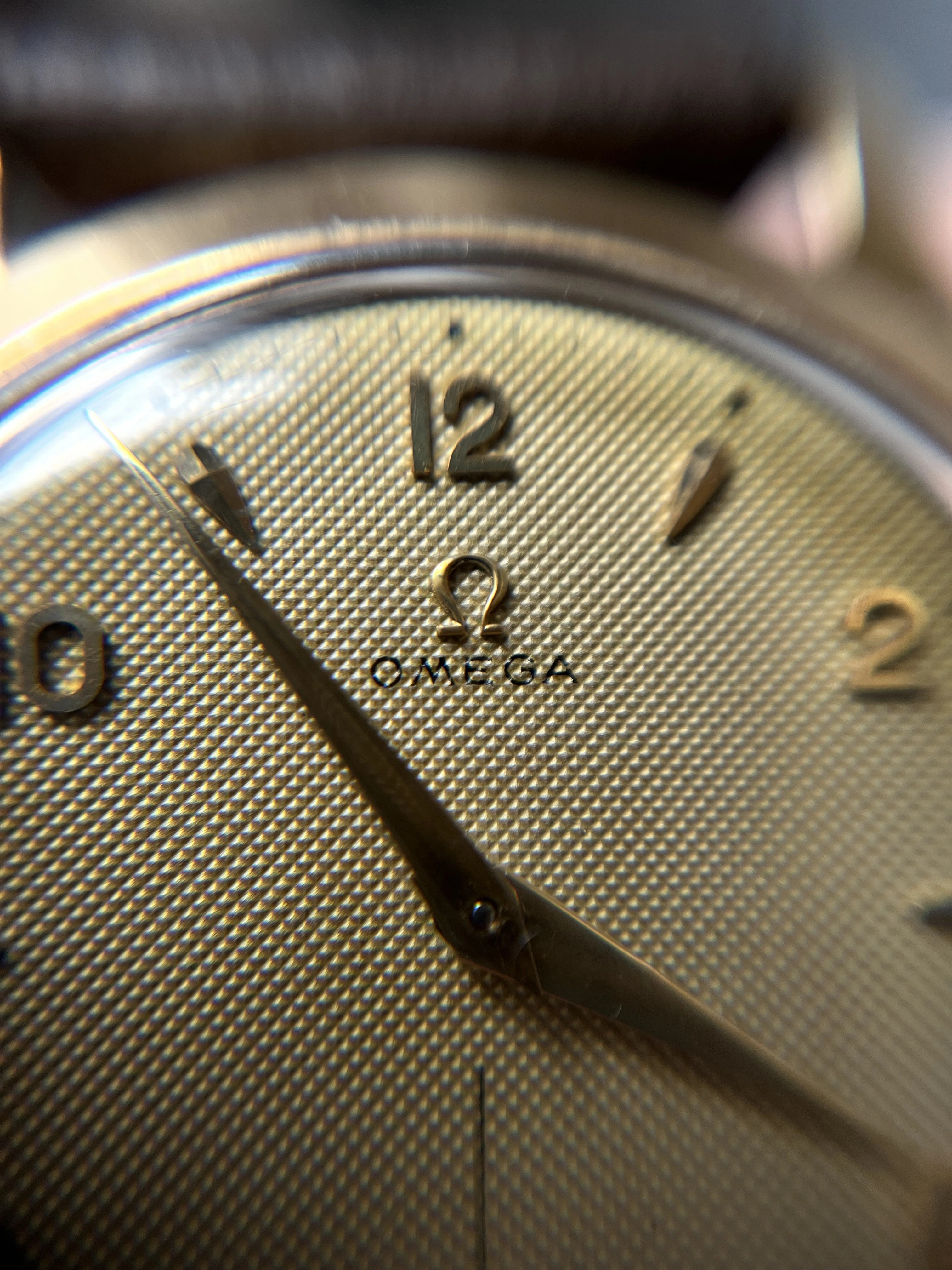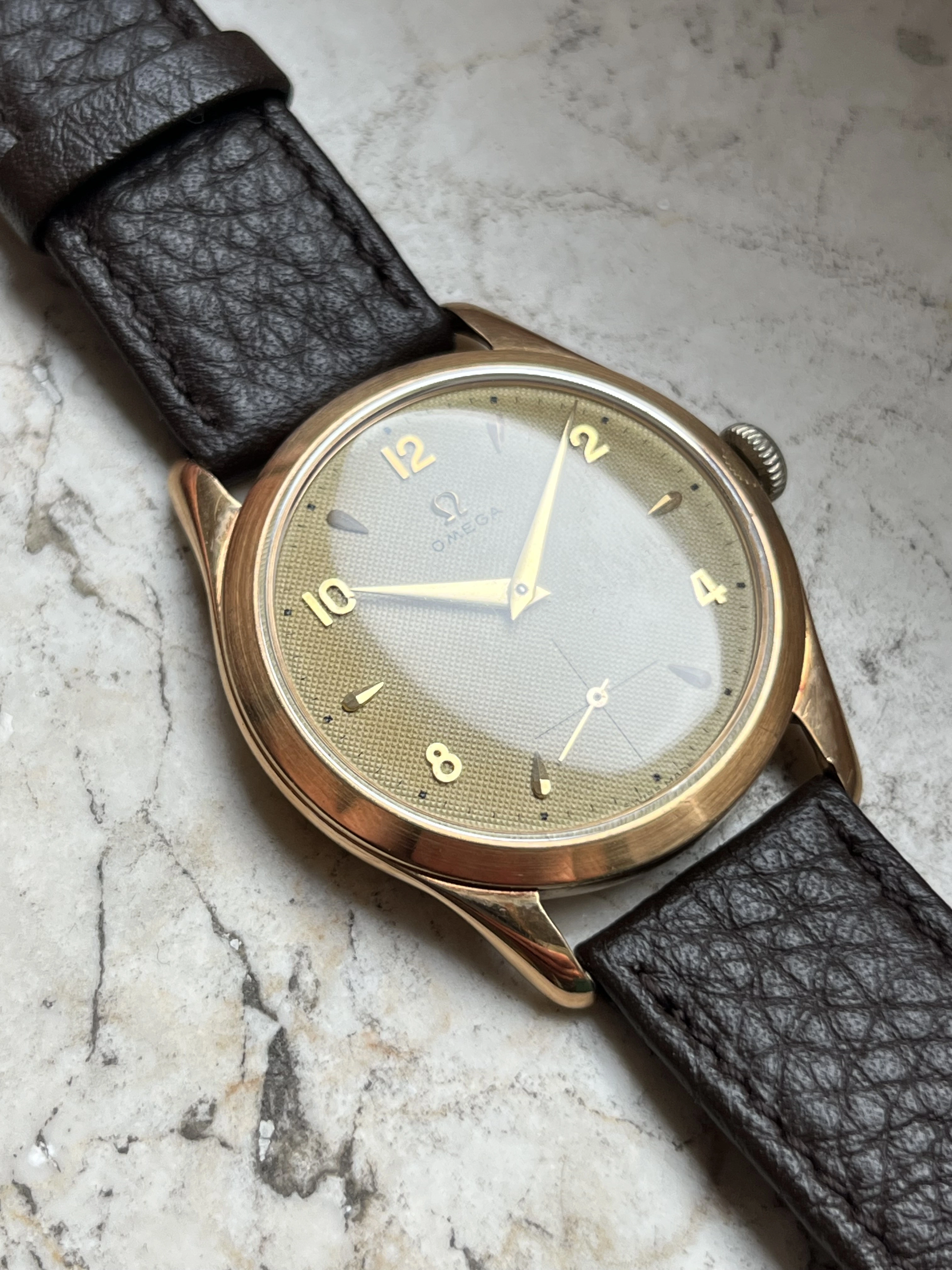 Case: The watch is with its 36mm 14k gold case quite large for its age and will fit many wrists very well.The case is in very good condition without any significant damages. The crystal is original with the Omega stamp in the middle. The crown is original but has lost a bit of its colour as visible in the pictures.