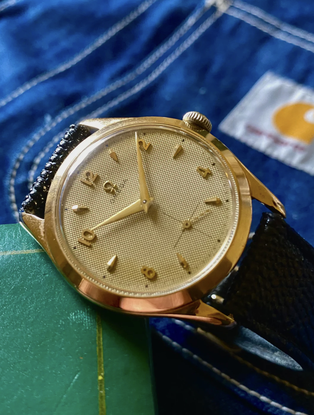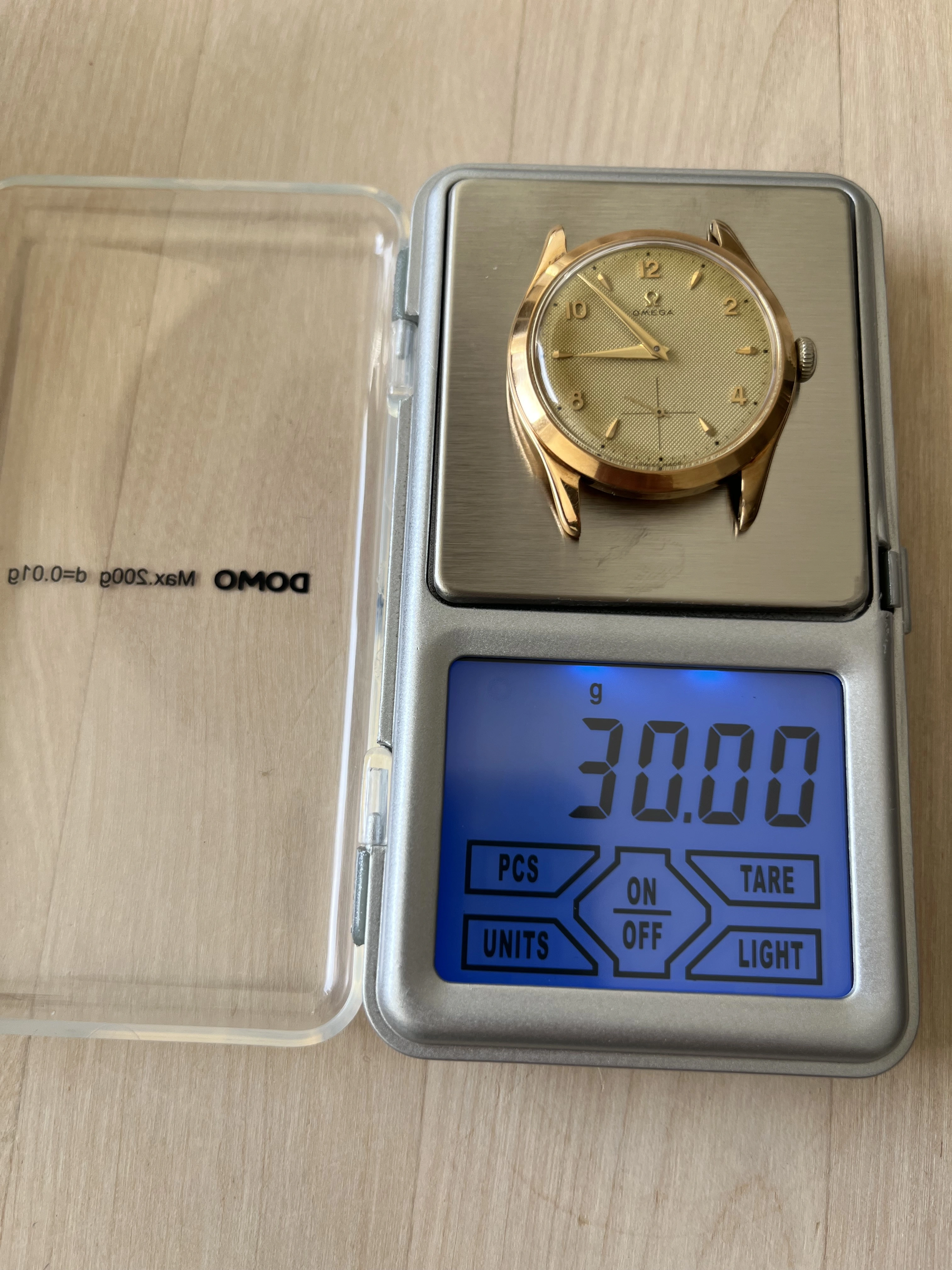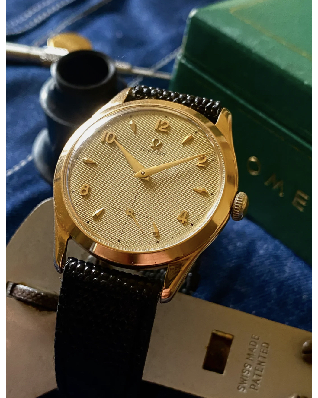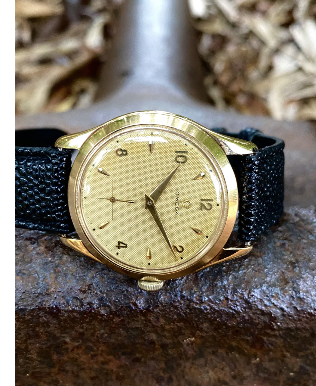 Case: The watch is with its 36mm 14k gold case quite large for its age and will fit many wrists very well.The case is in very good condition without any significant damages. The crystal is original with the Omega stamp in the middle. The crown is original but has lost a bit of its colour as visible in the pictures.