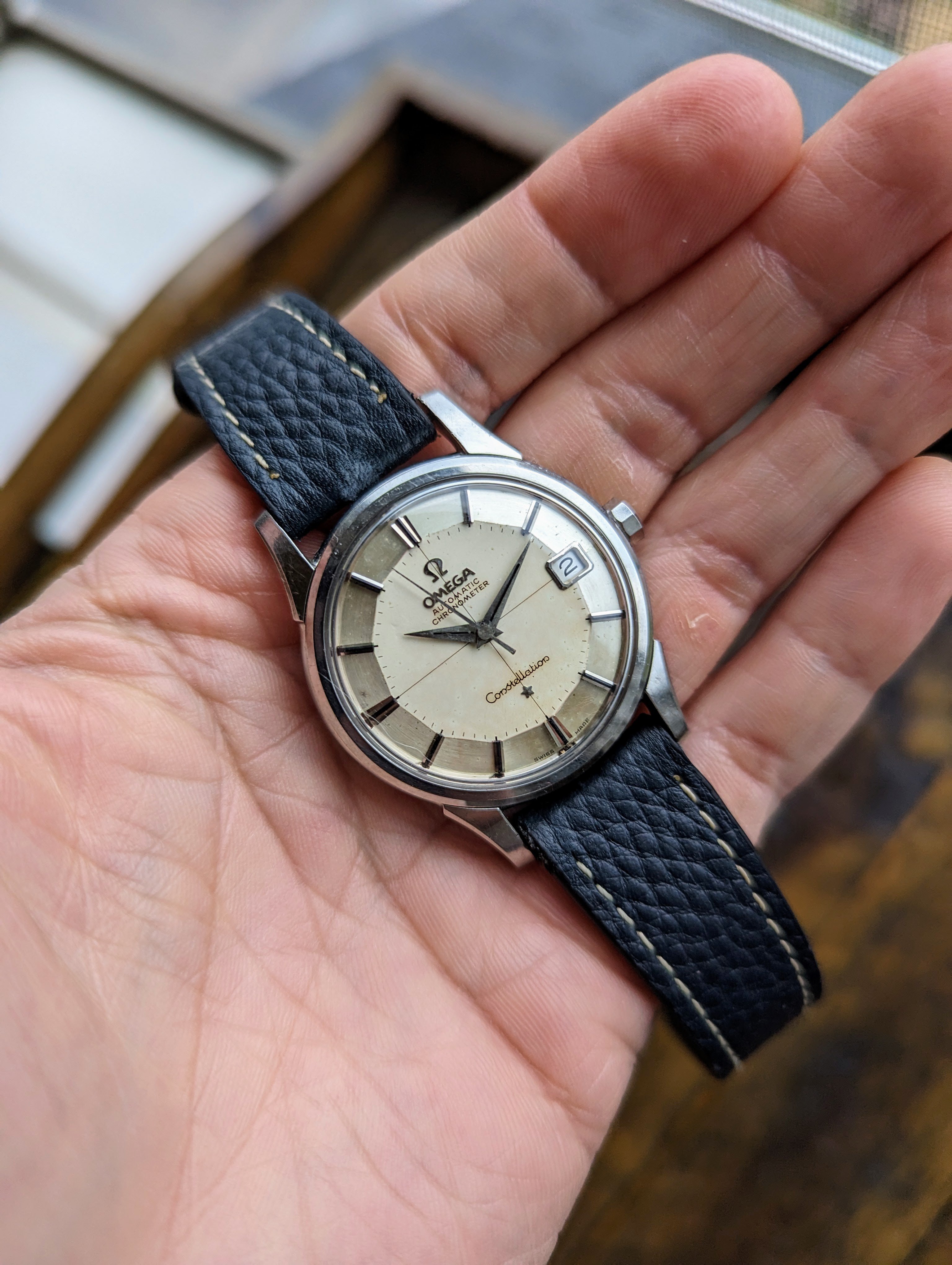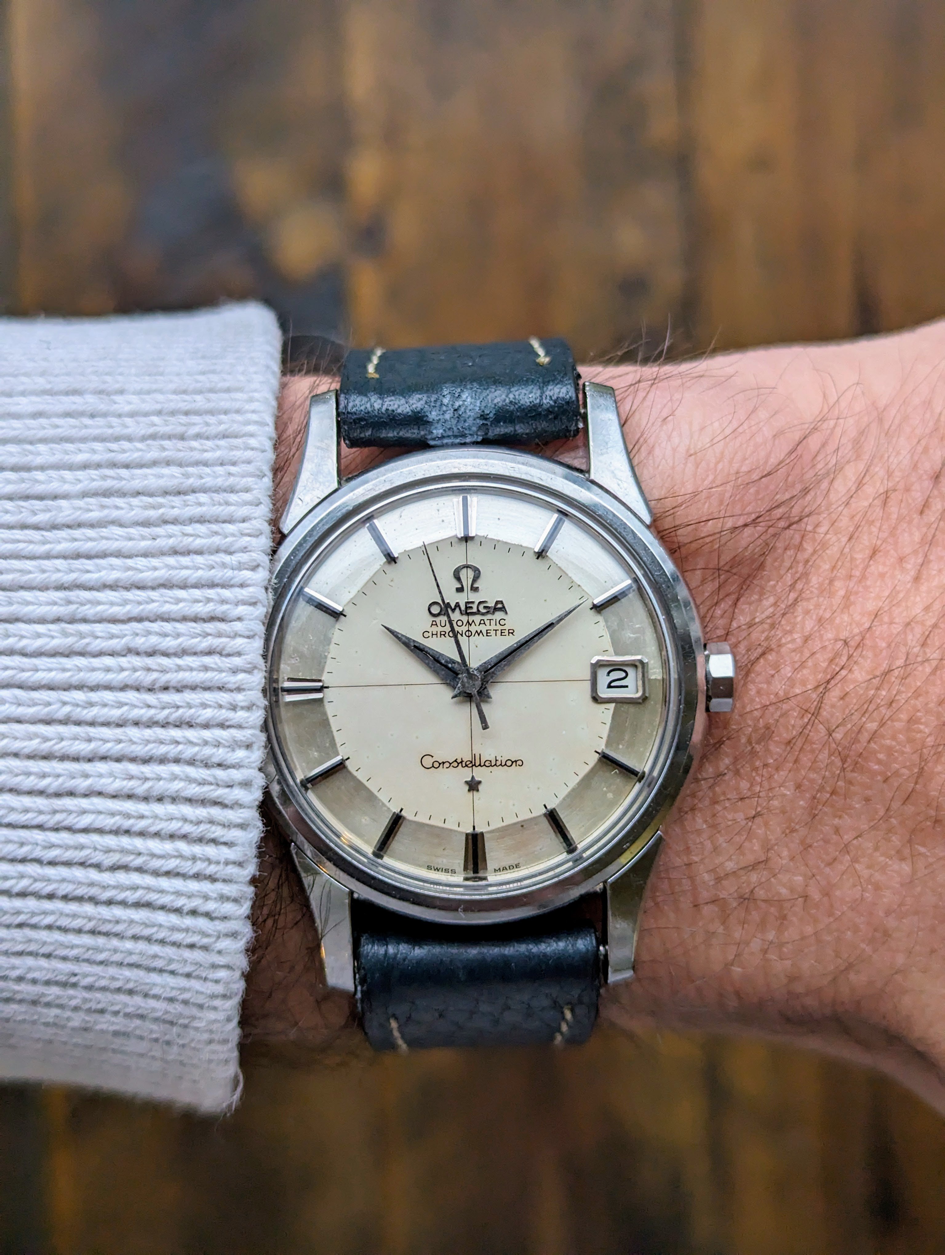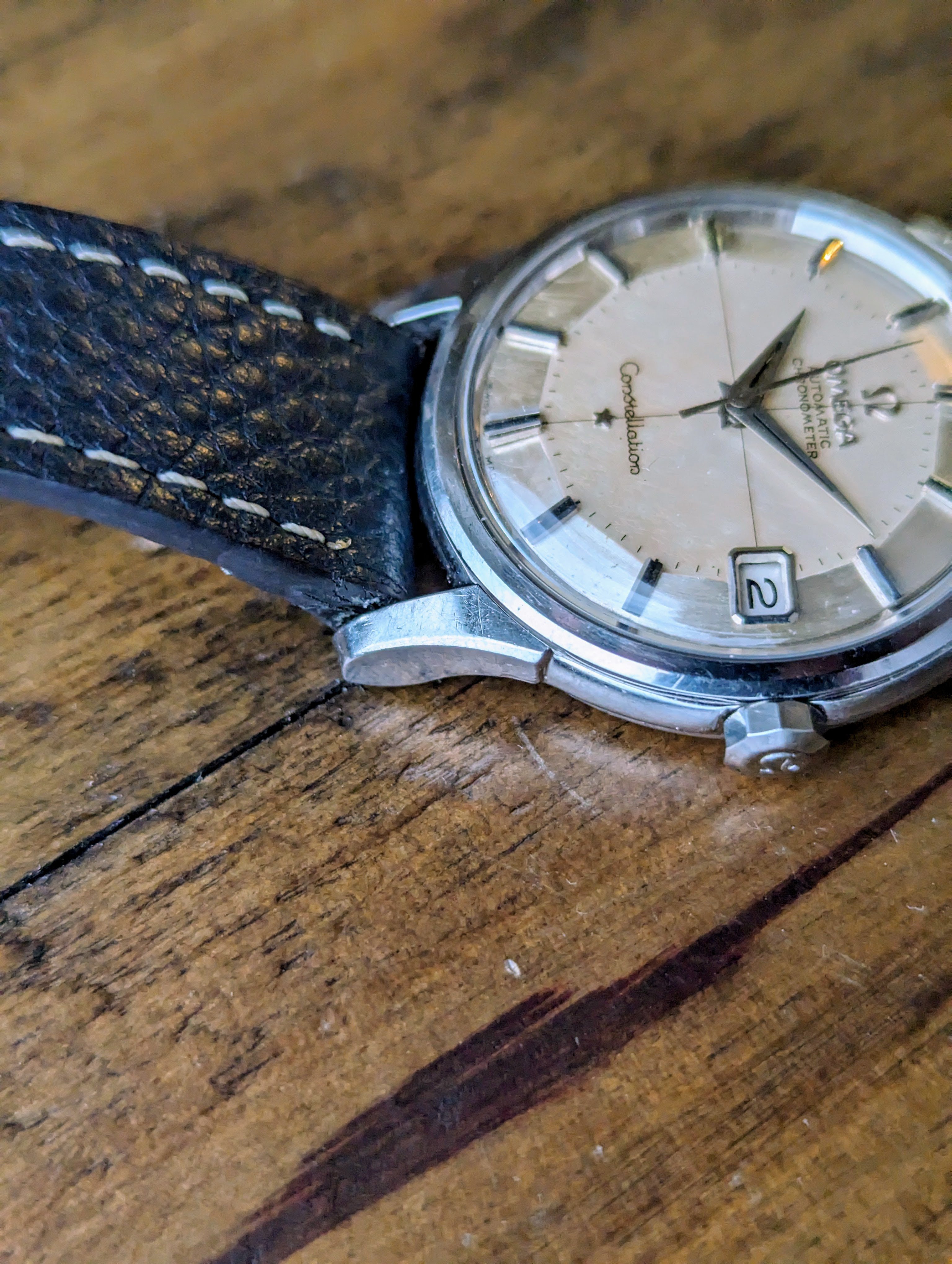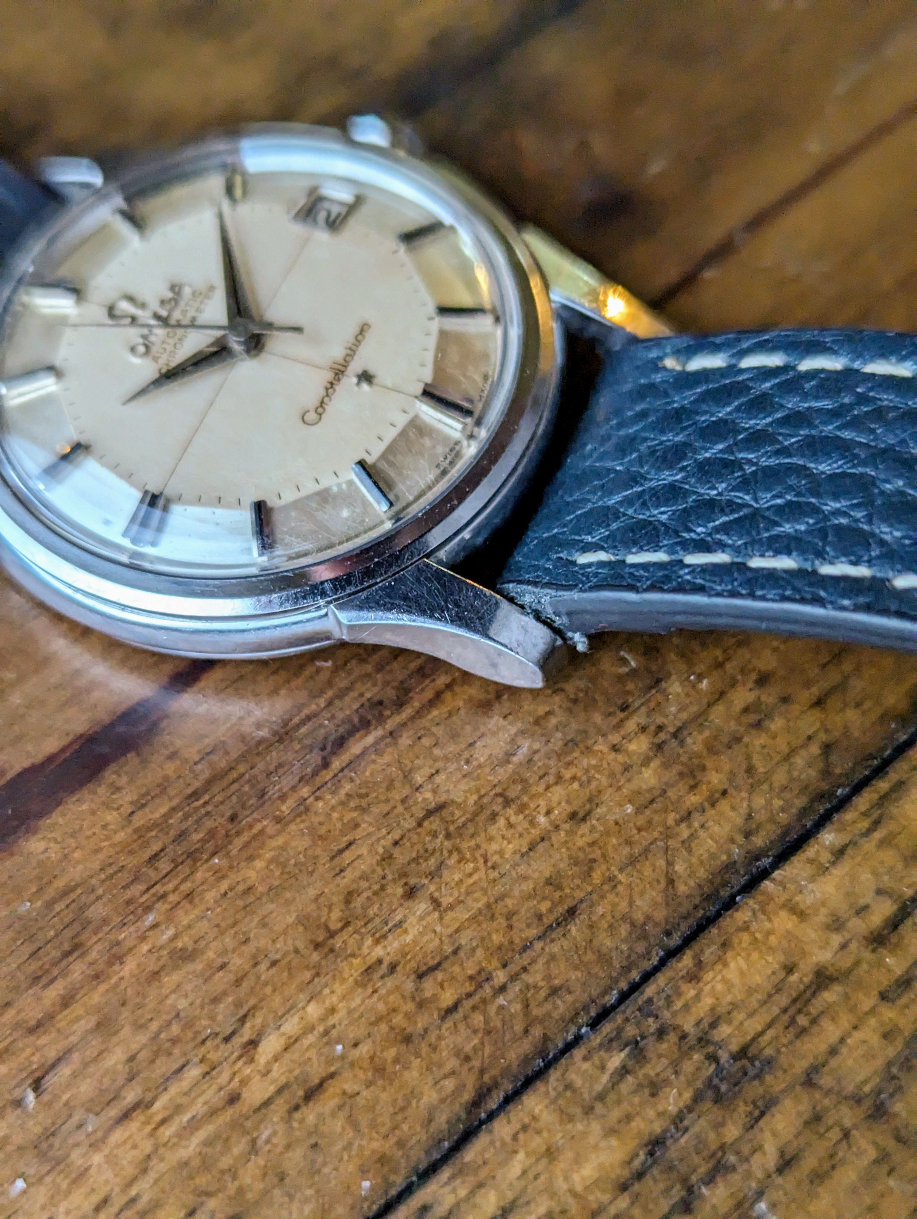 CASE: The previously polished 34mm stainless steel case is strong. All four lugs retain their factory beveled edges with good lines. The case presents with light to moderate wear. The yellow gold observatory medallion is also in good condition. The observatory and all 8 stars are clearly visible and distinct. The crystal and crown was replaced sometime in the past.