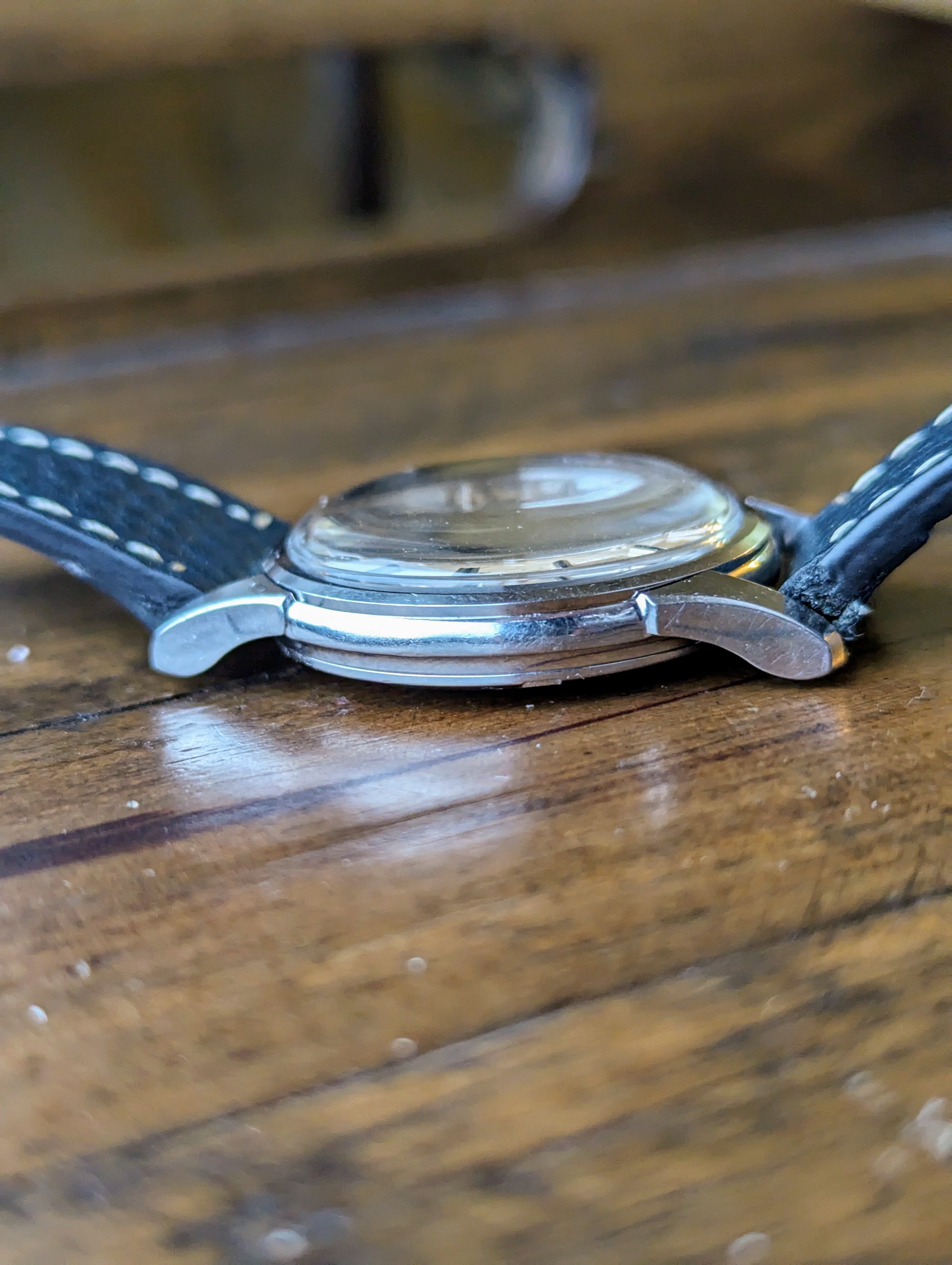 DIAL: We have a charming, original, pie pan dial. The dial presents with even spotting throughout that is more or less visible depending on the lighting. We have attempted to photograph the dial as accurately as possible. The dial features baton style hour indices and dauphine hands.