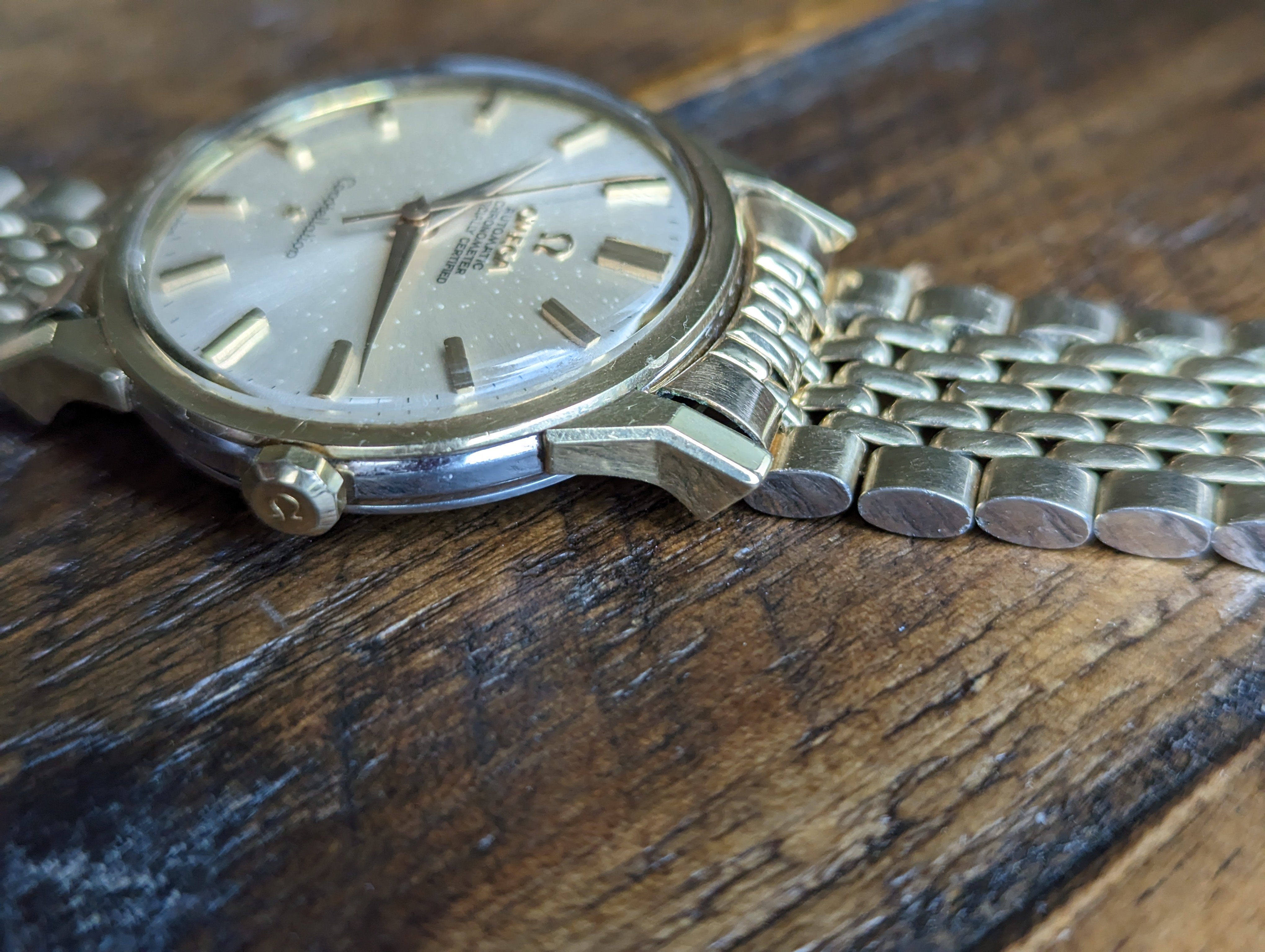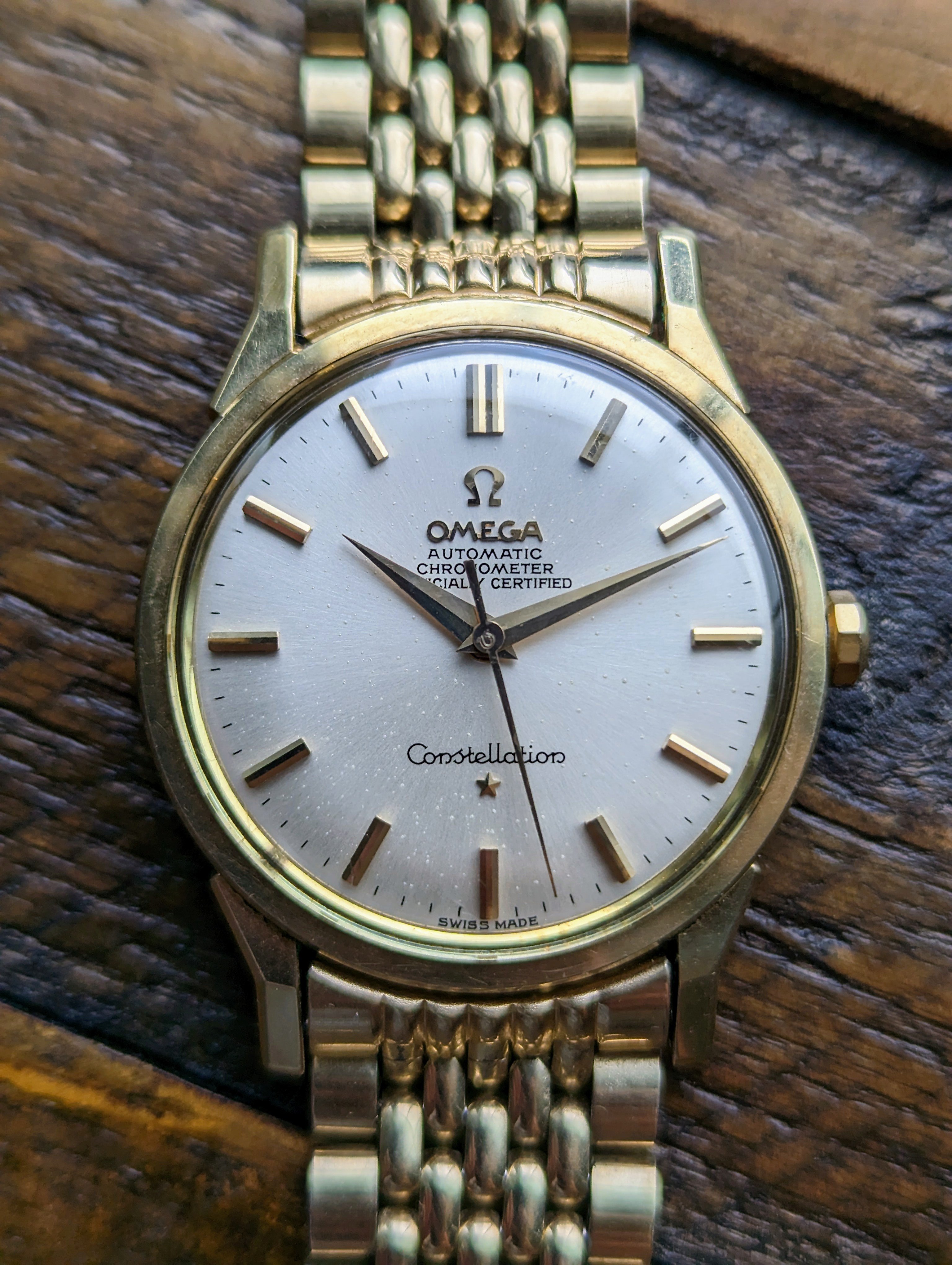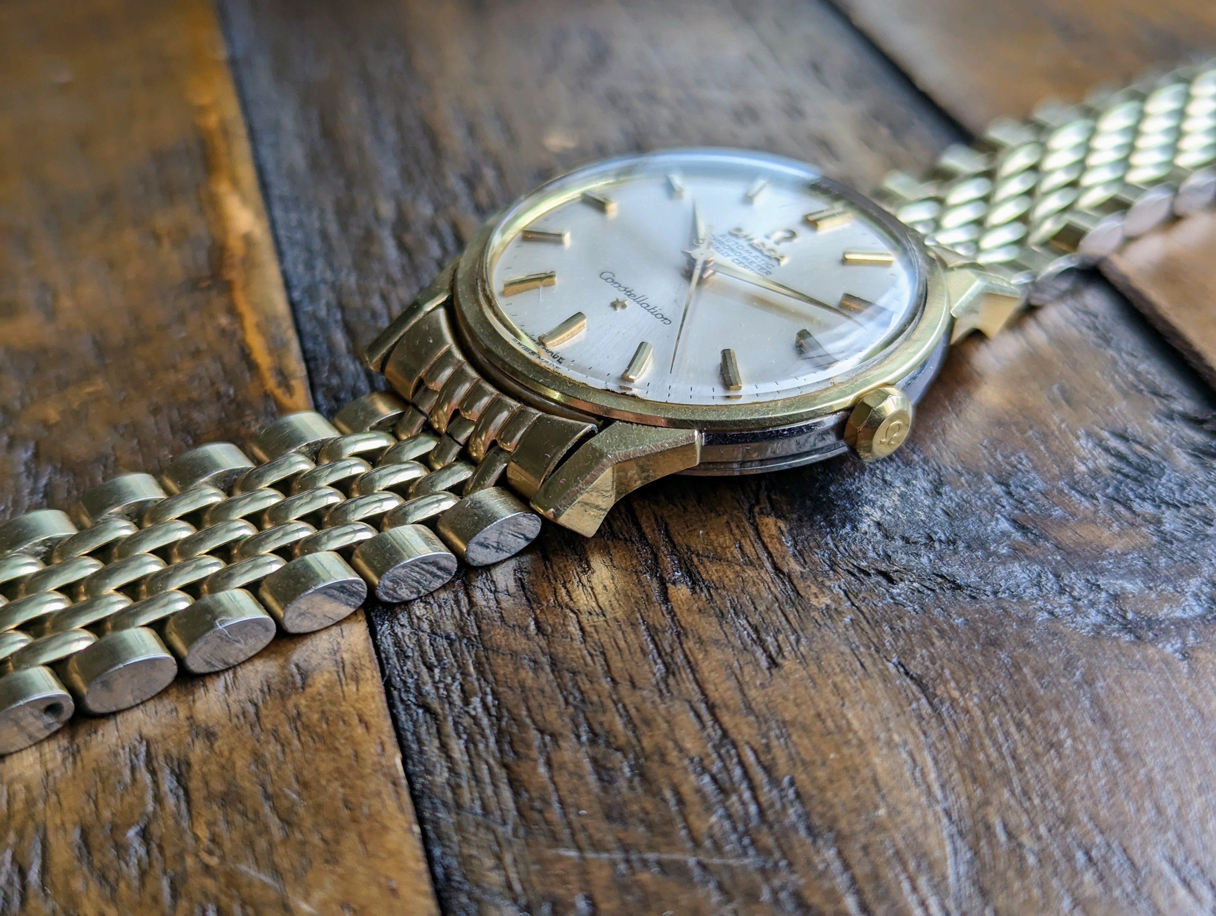 CASE: The 34mm yellow gold capped over stainless steel case. I believe the case to be unpolished. All four lugs retain their factory original facets and beveled edges. The case features its original, thin decagonal crown. The screw down caseback has some very faint wear throughout but no scratches from wrench marks at all. The yellow gold medallion has a crisp observatory and all 8 stars are present with a matte, grainy backdrop. The case is completed by the watches original, Omega signed crystal.