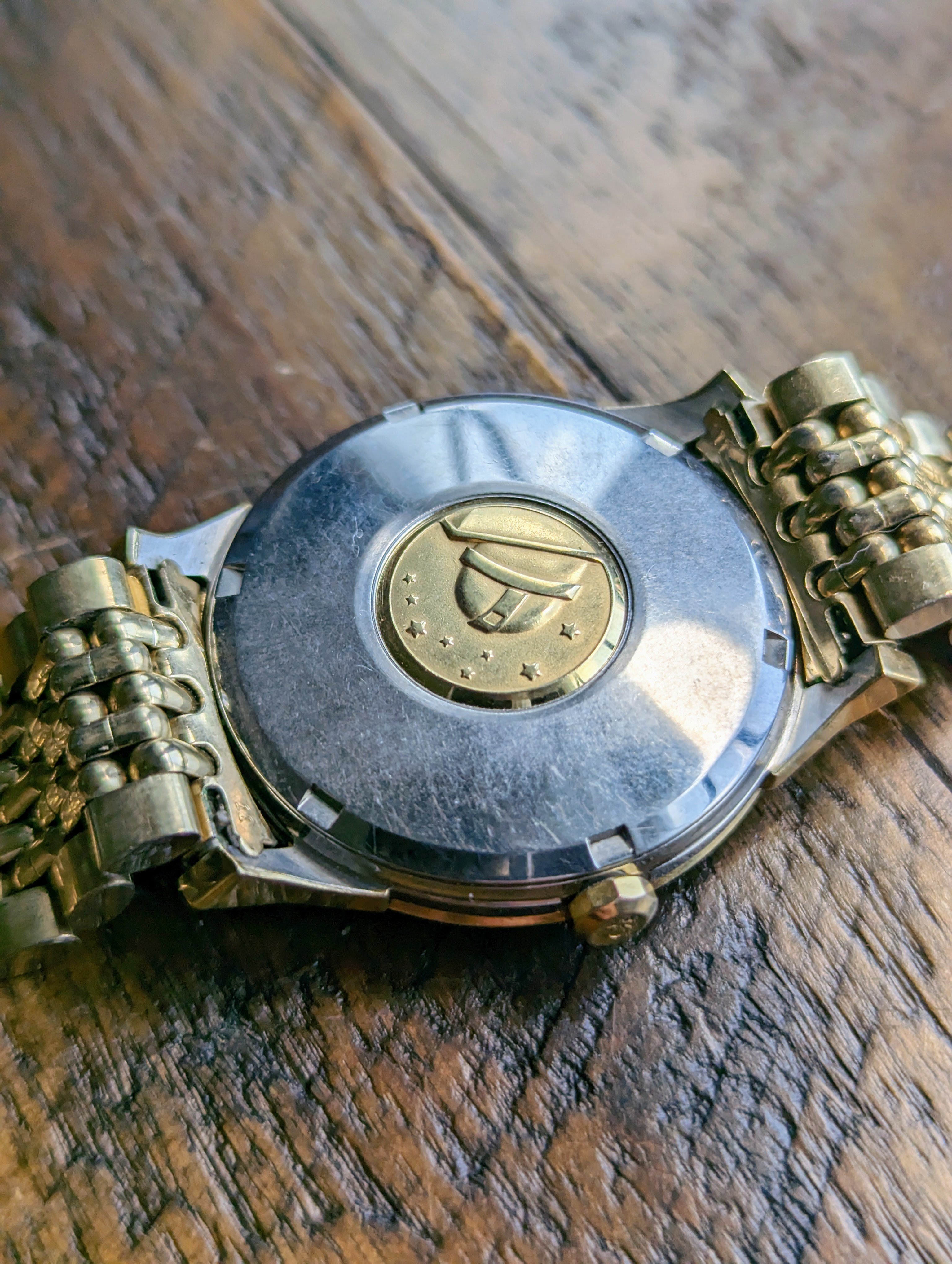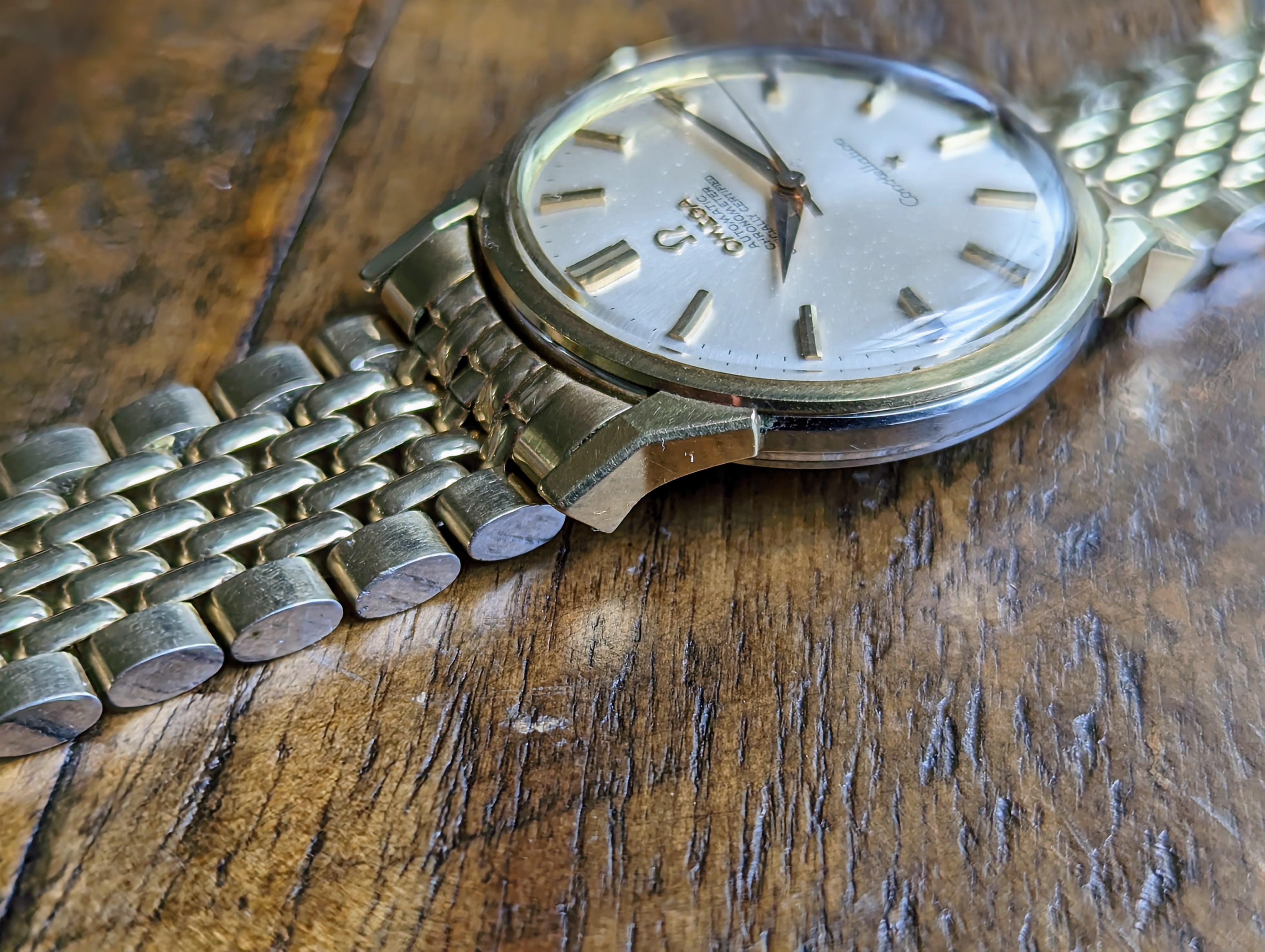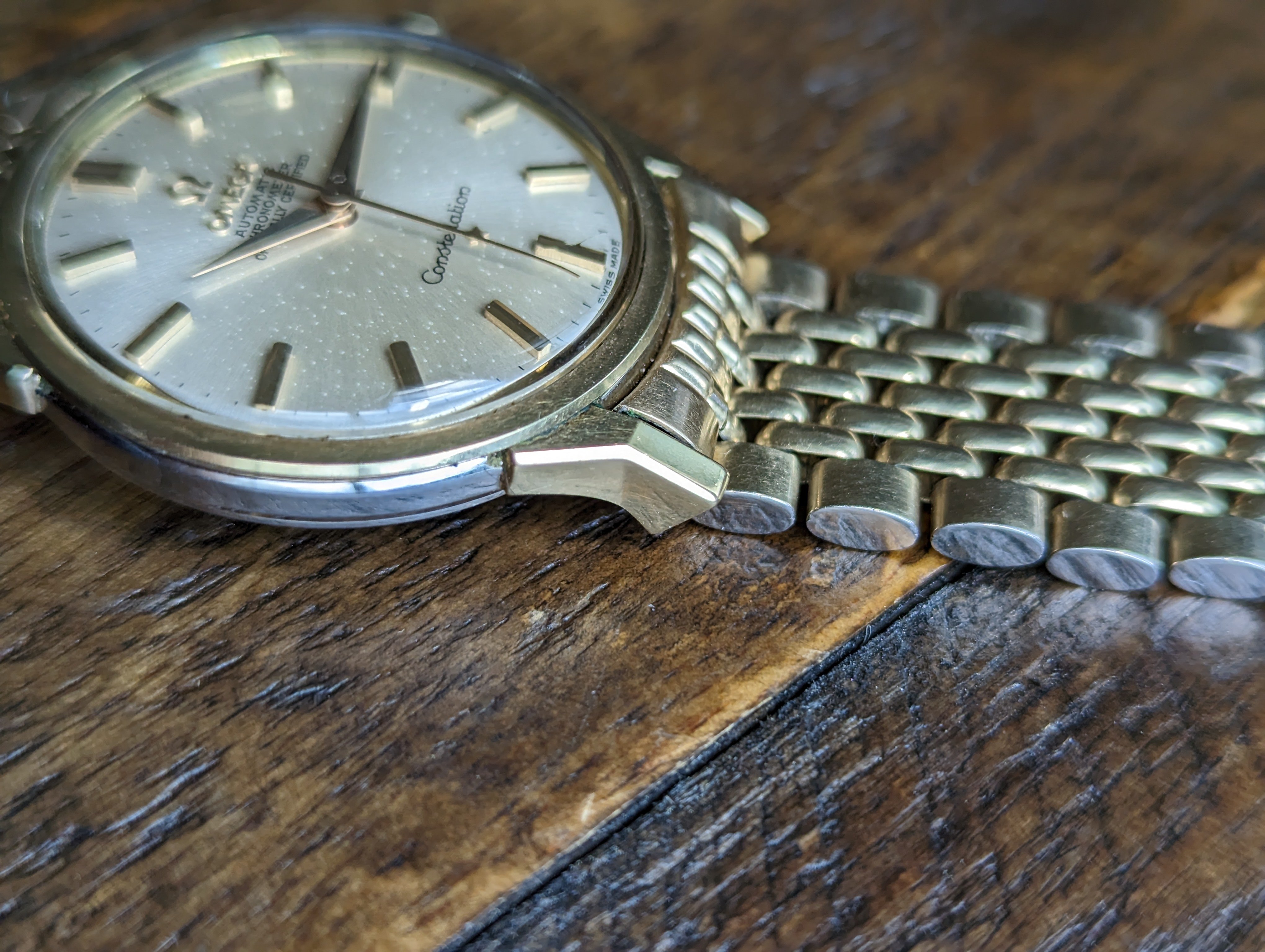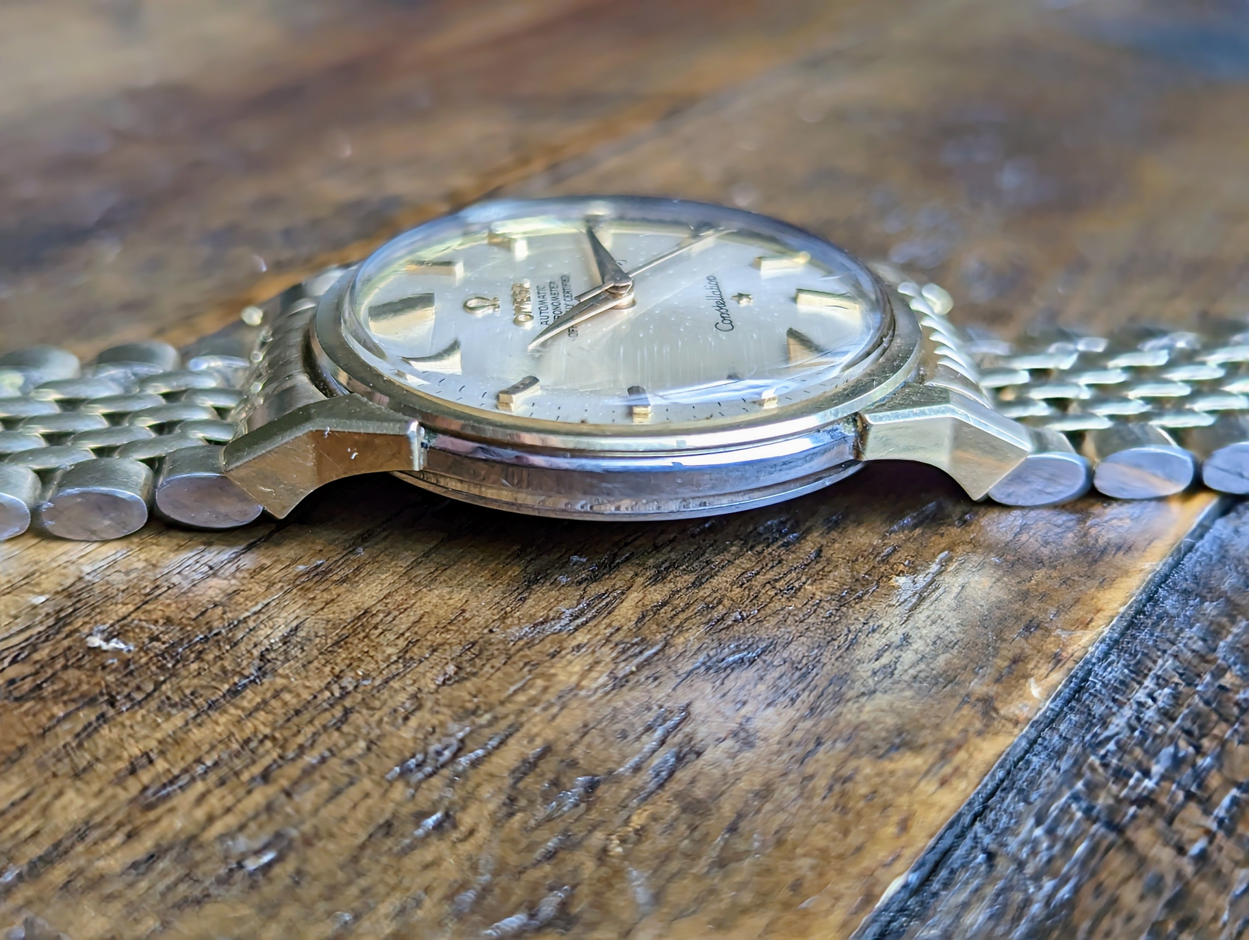 CASE: The 34mm yellow gold capped over stainless steel case. I believe the case to be unpolished. All four lugs retain their factory original facets and beveled edges. The case features its original, thin decagonal crown. The screw down caseback has some very faint wear throughout but no scratches from wrench marks at all. The yellow gold medallion has a crisp observatory and all 8 stars are present with a matte, grainy backdrop. The case is completed by the watches original, Omega signed crystal.