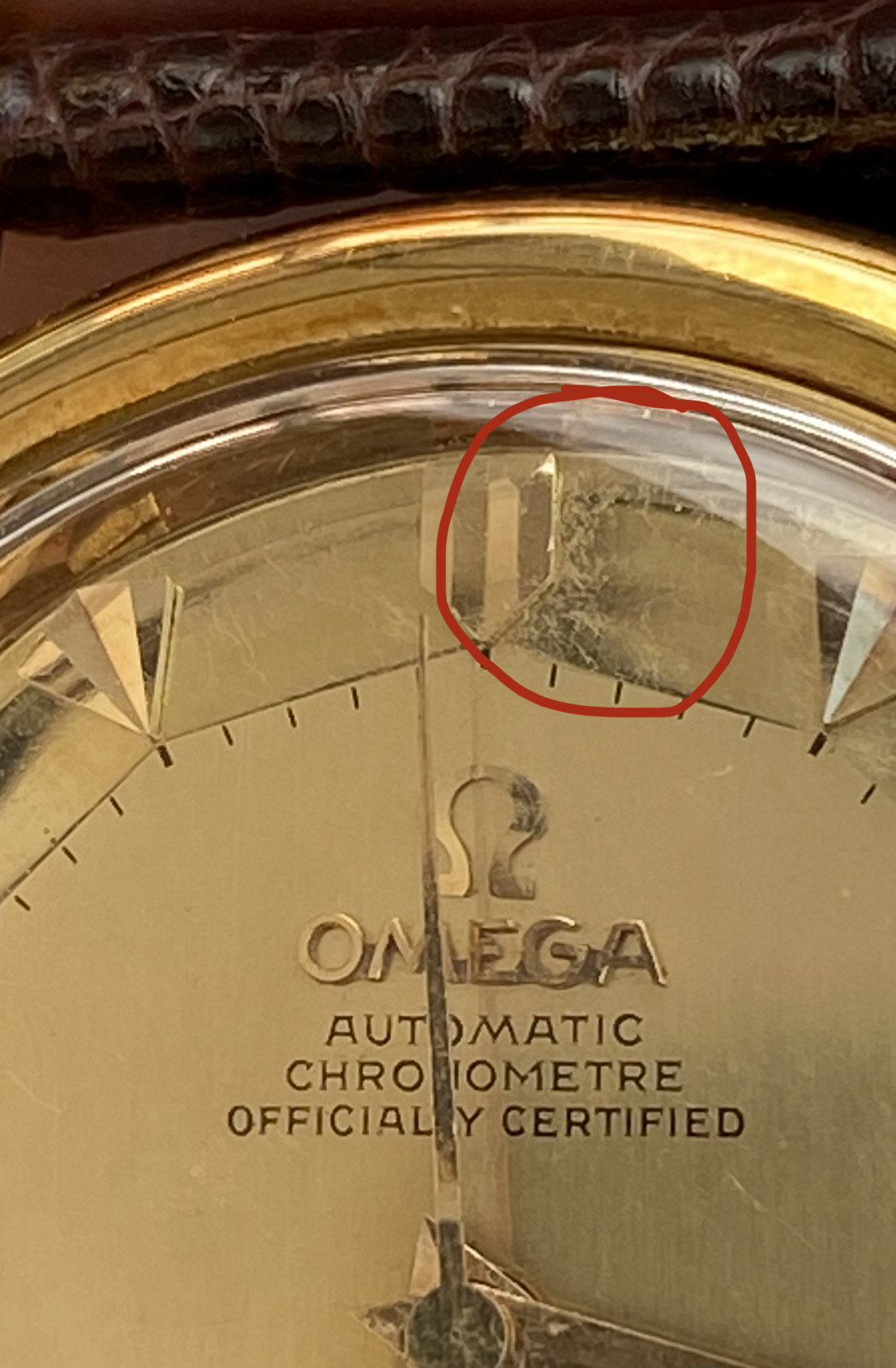 The 18k solid gold pie pan deluxe dial has a beautiful combination of a brushed center and polished facets. It is in excellent shape, although there are microscopic scratches around the markers not visible unless closely inspected. Please see close up circled in red.