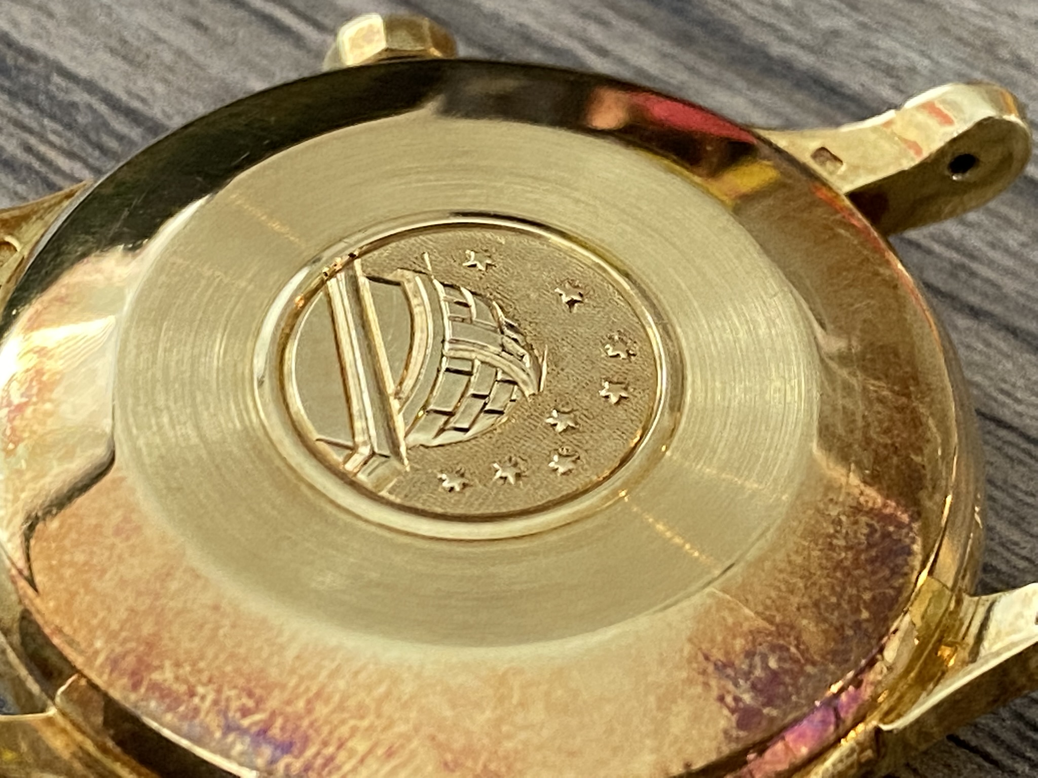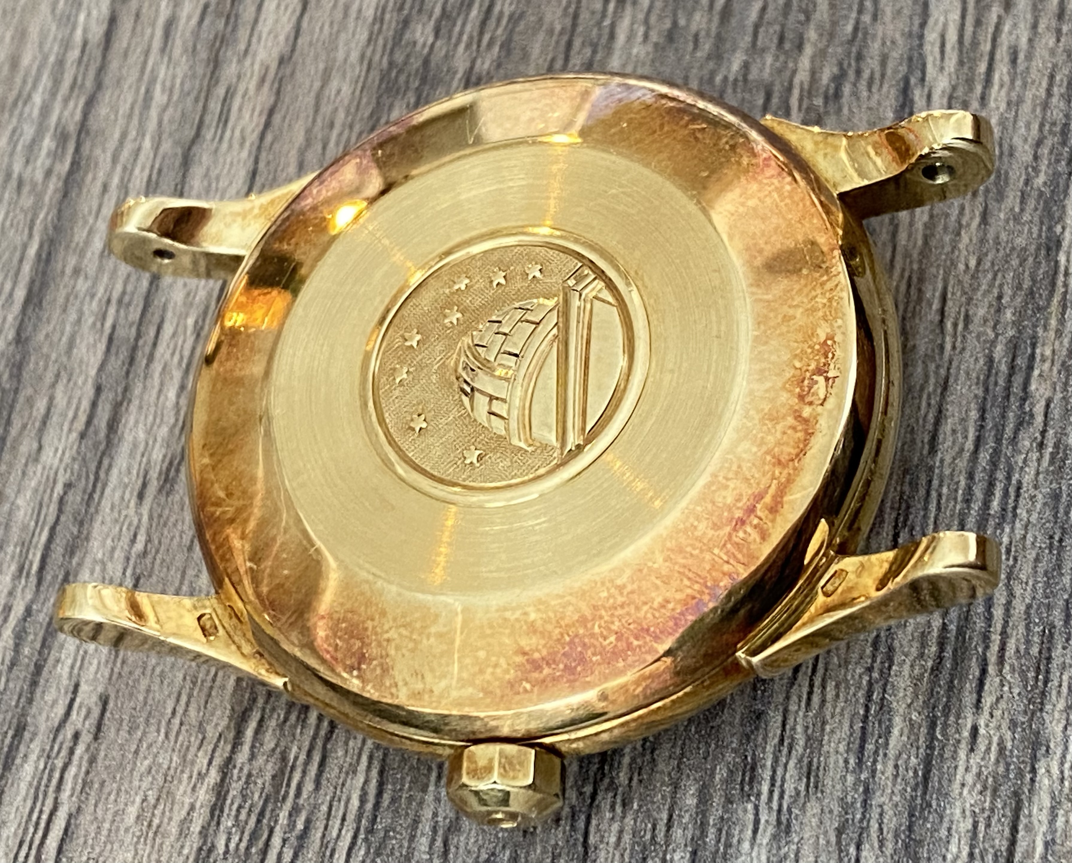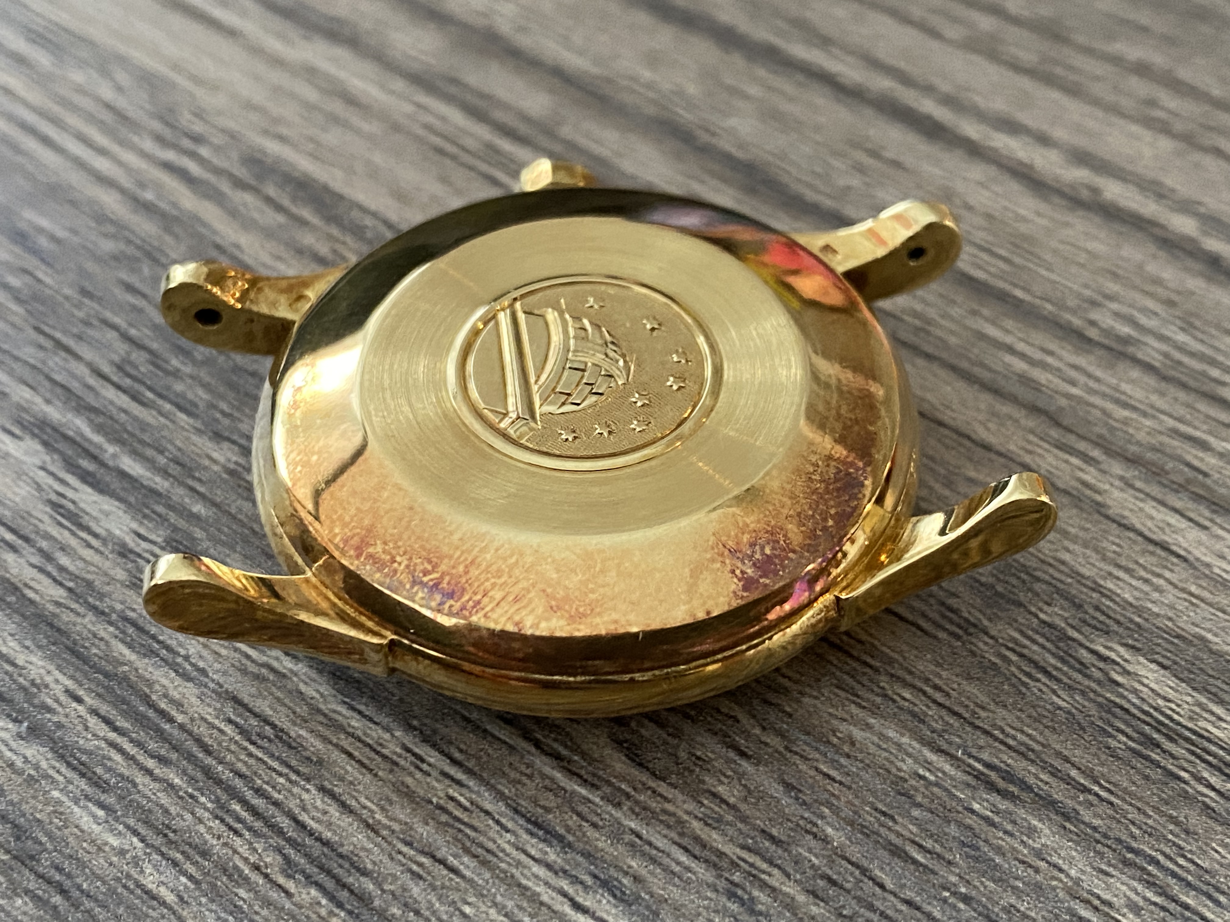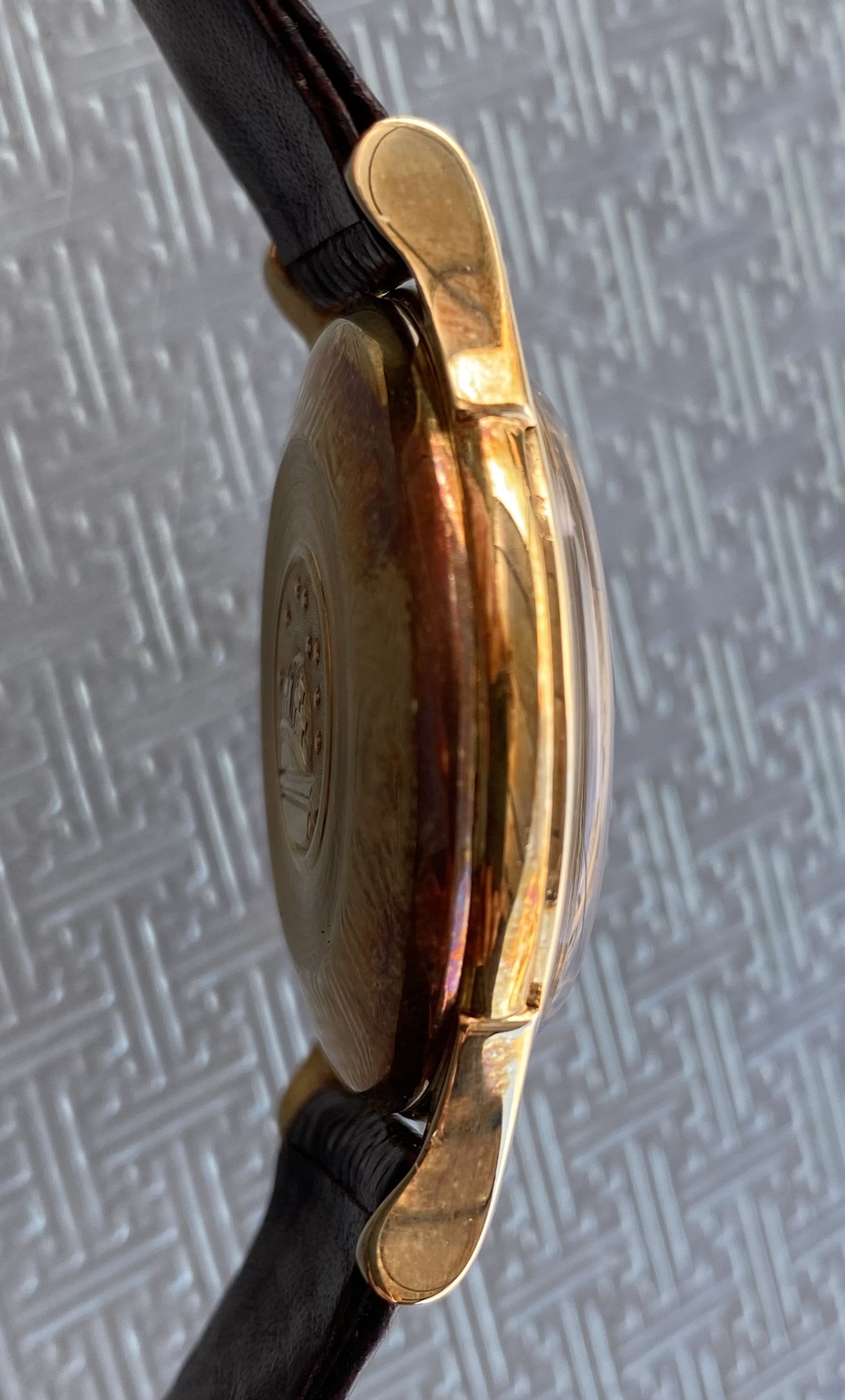 The 18k solid cold case is in nice shape but has definitely met the polishing wheel, still it looks very nice and retains the original shape. The same can be said of the bezel which is now a bit rounded, and the caseback seems to have been refinished probably to remove some tool marks but its just on the chamfered edge, the central portion seems to be untouched and the medallion is the crispiest one I have seen. The dark yellow gold case has developed a nice tarnish which I find atractive, although it could easily be removed if desired.