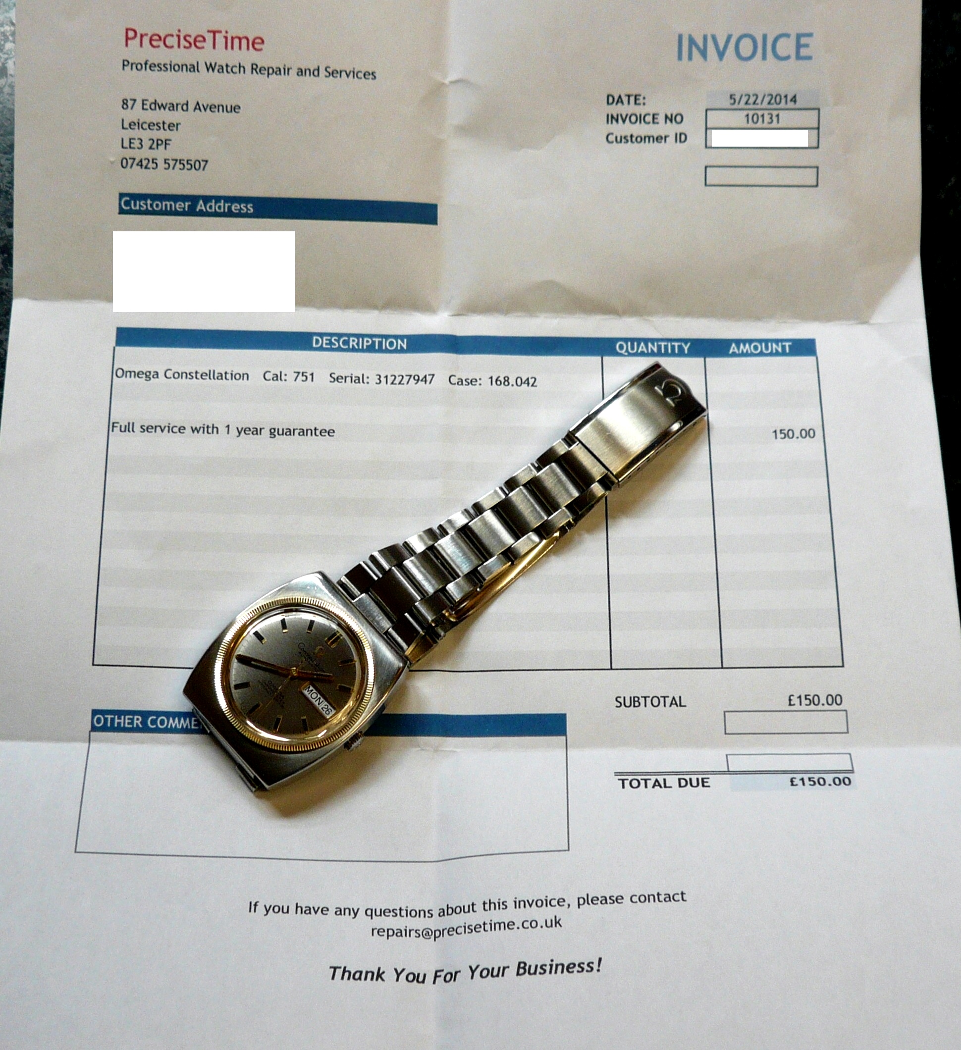 The watch has been serviced on 22/5/2014 which costs £150. I will send a Invoice along with the watch to the winning bidder.