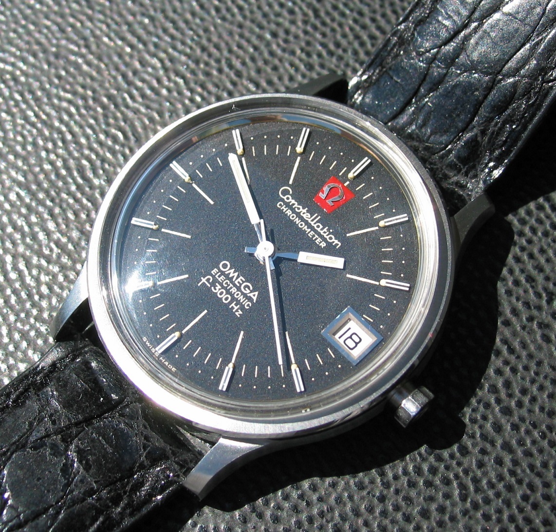 ·Very uncommon model with black dial in perfect condition. This watch is a special find, complete with box and papers. The box has the original Omega sticker on the side listing the model number. Black dial versions are rare, especially in perfect condition. This watch is truly New Old Stock (NOS). I had a full service performed on the movement and it is running perfectly. The original strap had aged a bit during storage so I put a NOS Omega black crocodile strap on it. Also comes with the original Omega silver color buckle.