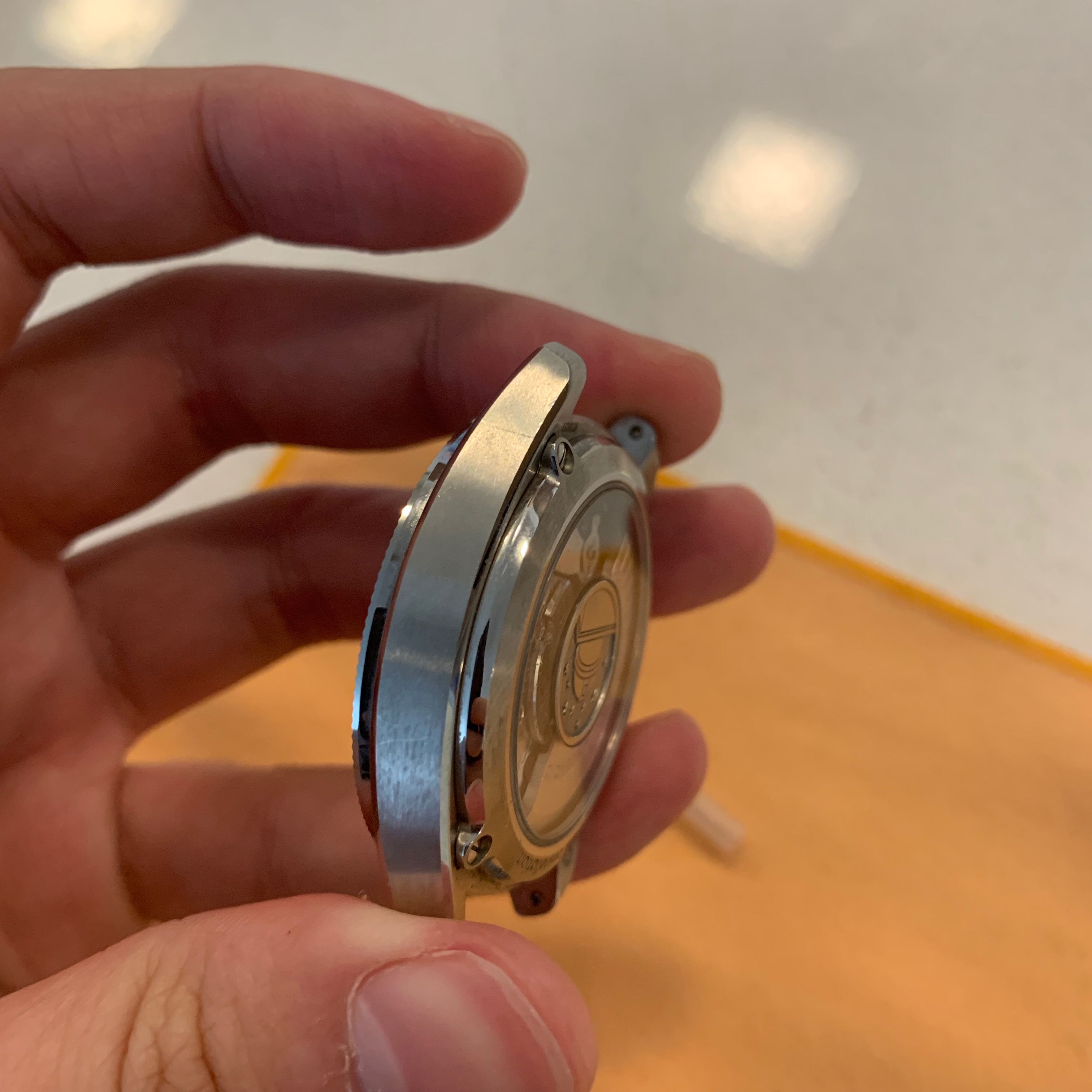 The watch has been loved this past year and has some scratches on the top right, bottom right and left lug (but it’s hard to see because it is brushed steel - I have tried to capture this in the photos below). There are also some light scratch marks from changing between the bracelet to deployant on the back of the lugs. Lastly there is one scratch on the bottom left hand side and top right side, on the side of the watch. None of this is noticeable unless you look for it.