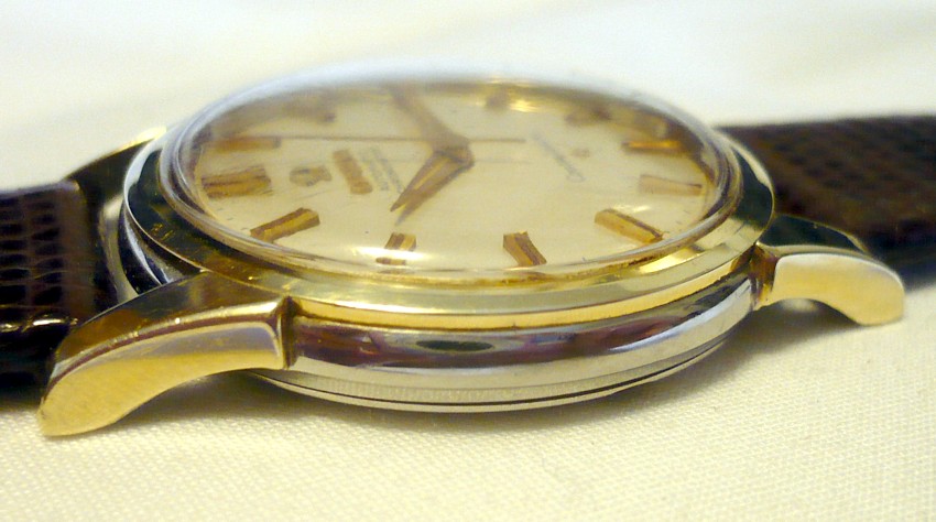 ·This is a lovely old watch in excellent condition. It’s an Omega Constellation Chronometer in a 35mm stainless steel case with a gold cap over the lugs and what I believe is a 14K gold bezel.
