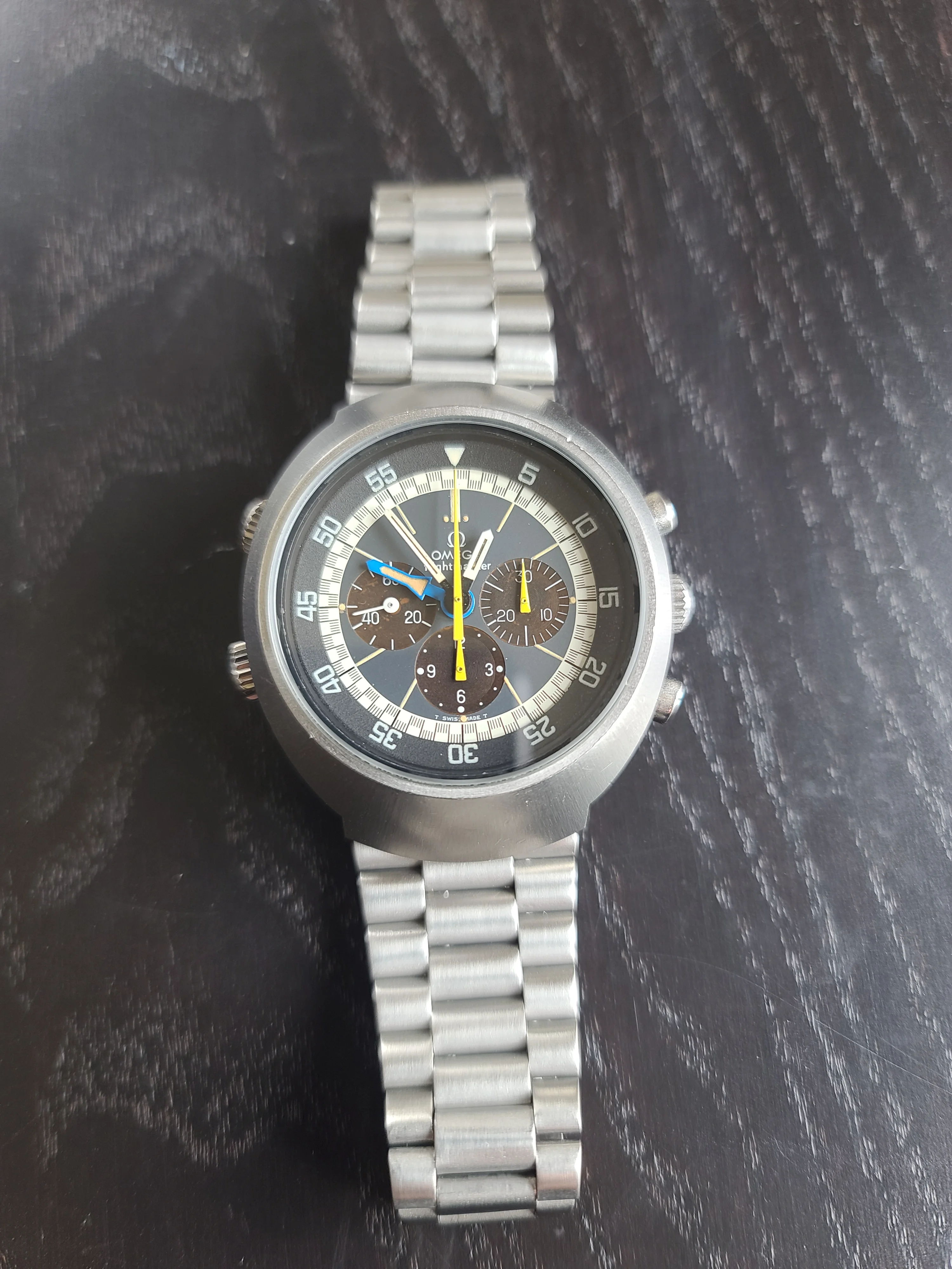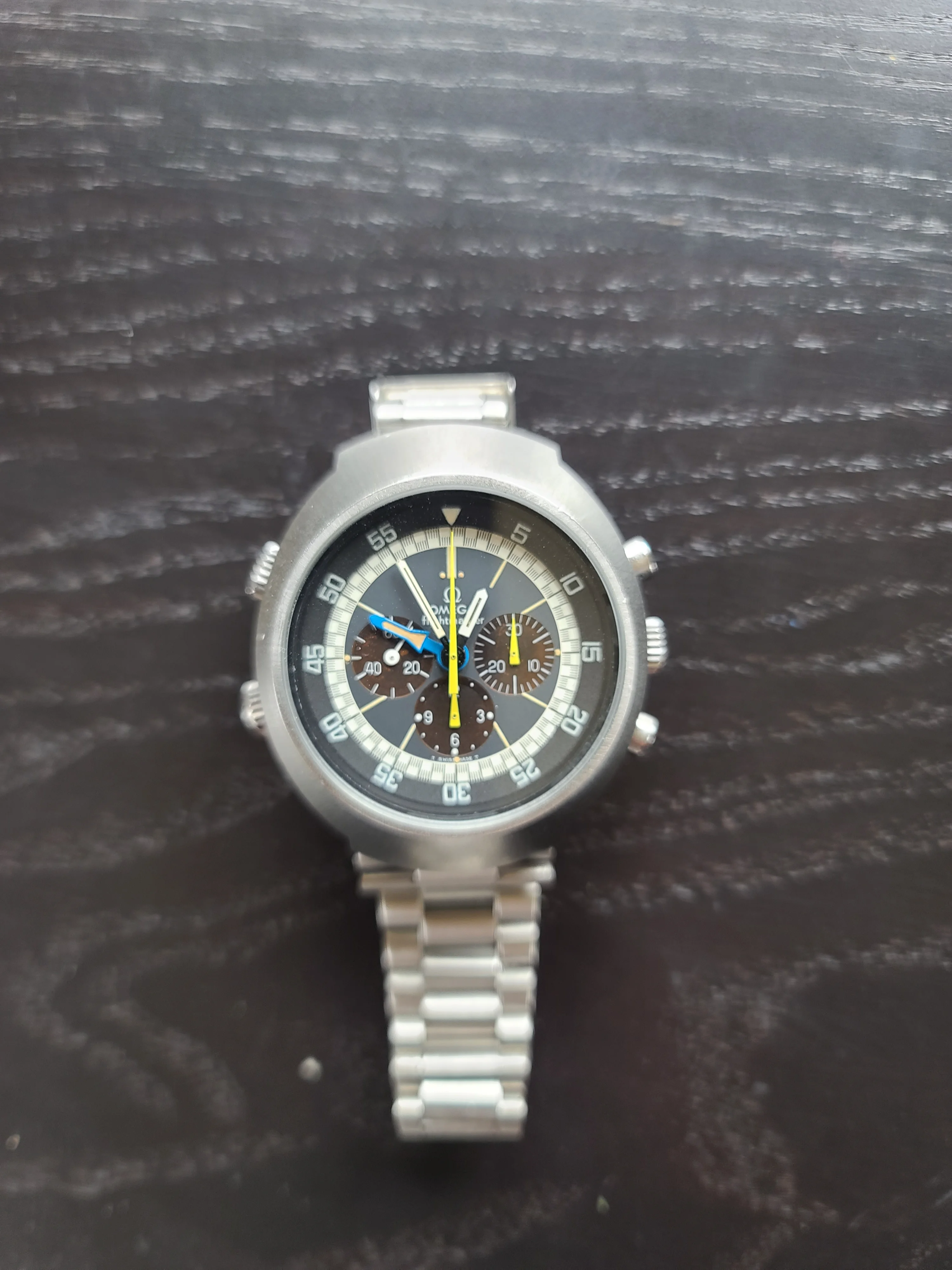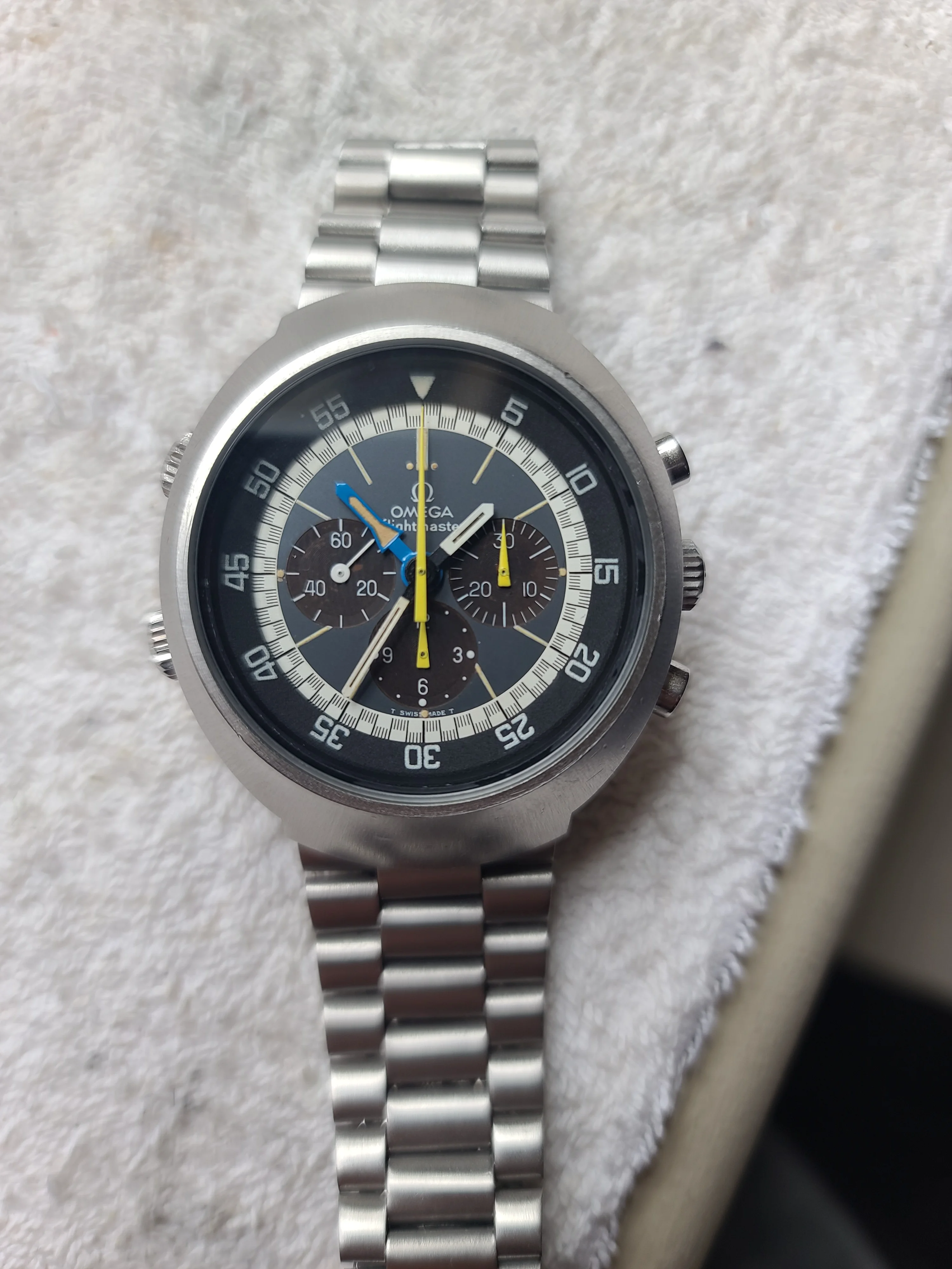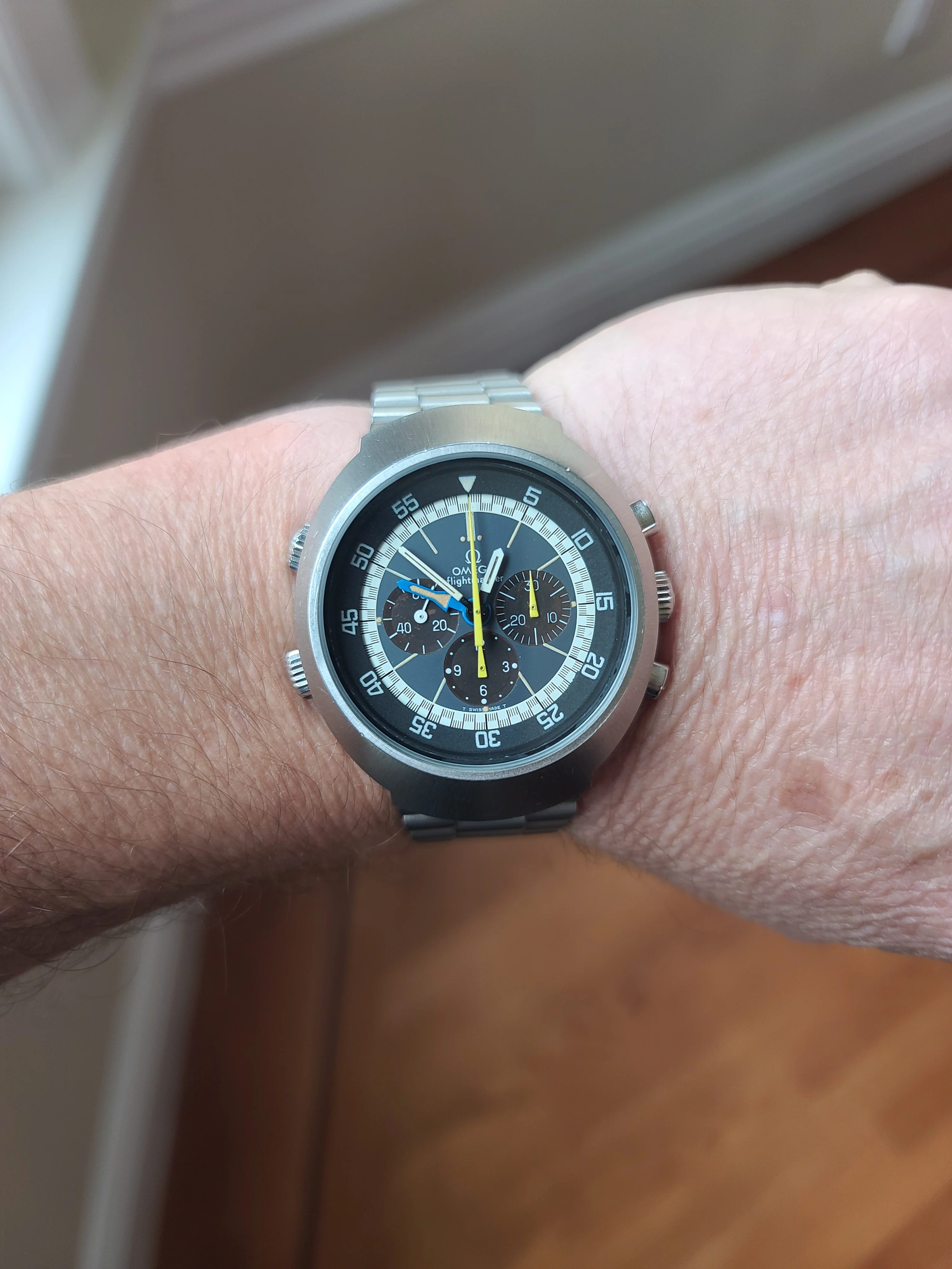 ·I just received this Omega Flightmaster 145.026 watch. It is in stellar condition and everything is original. It is from 1972 according to the serial number. The dial is outstanding and so is the rest. Case is sharp and has never been polished. Movement has just been serviced and looks really clean. I waited for a while to buy my first Flightmaster and it looks like the wait paid off.