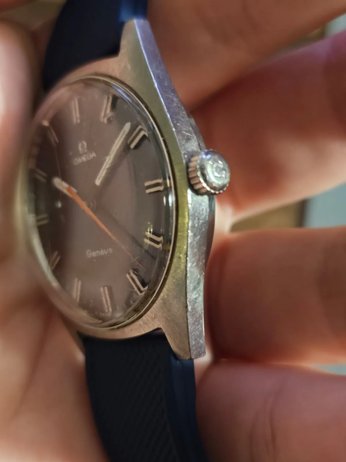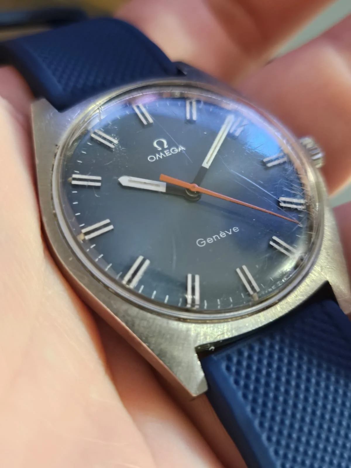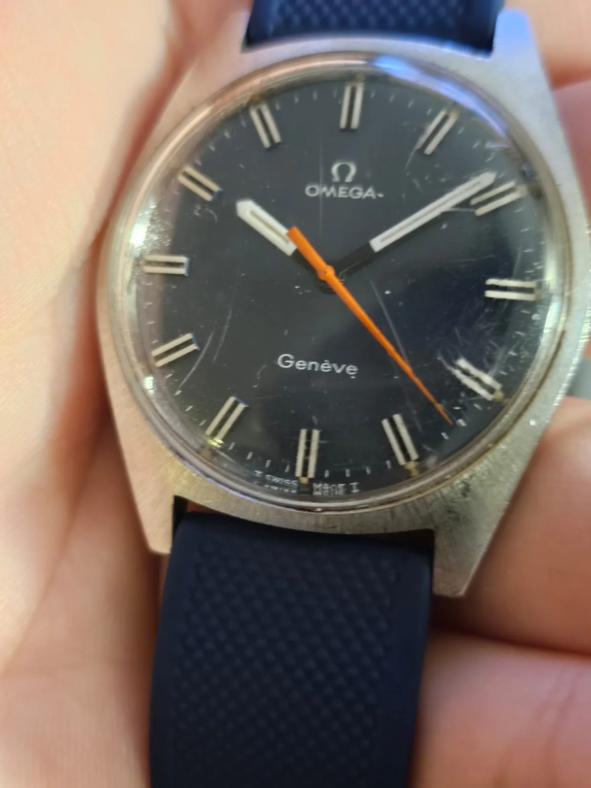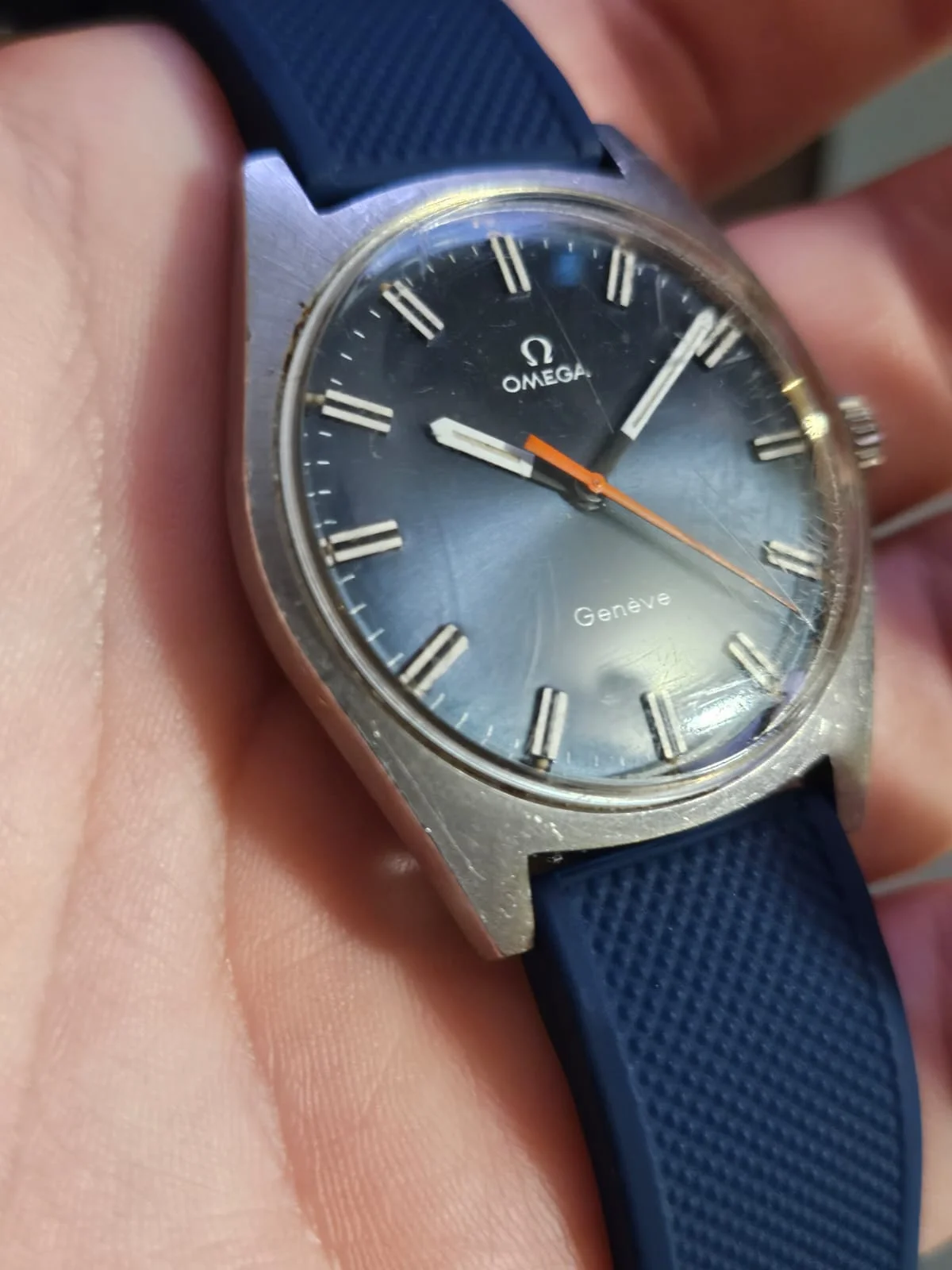·Up for sale is nice 135.041 Geneve with a blue sunburst dial and orange hand. Needs a little TLC (crystal polish/swap) but its in great overall condition.