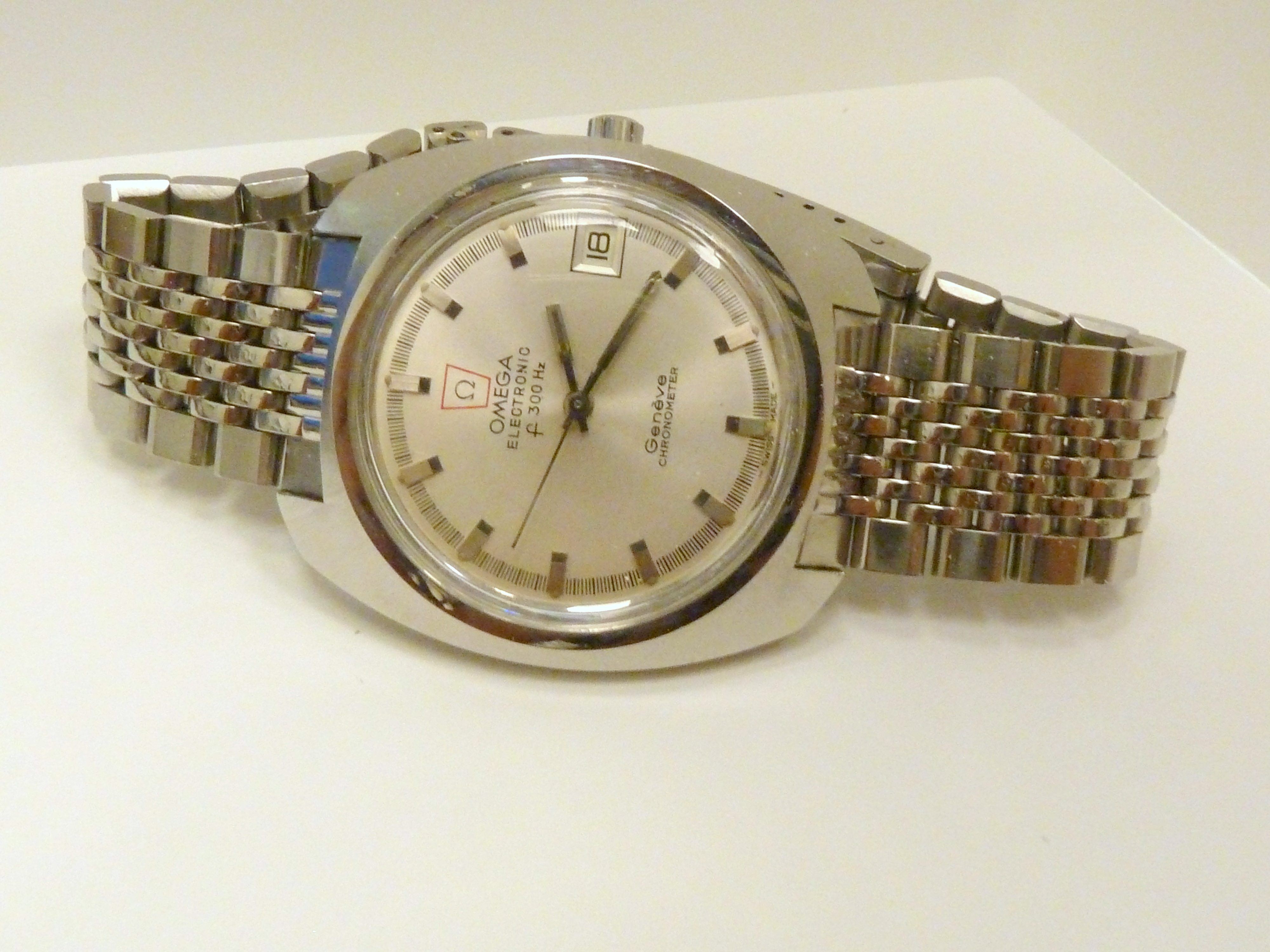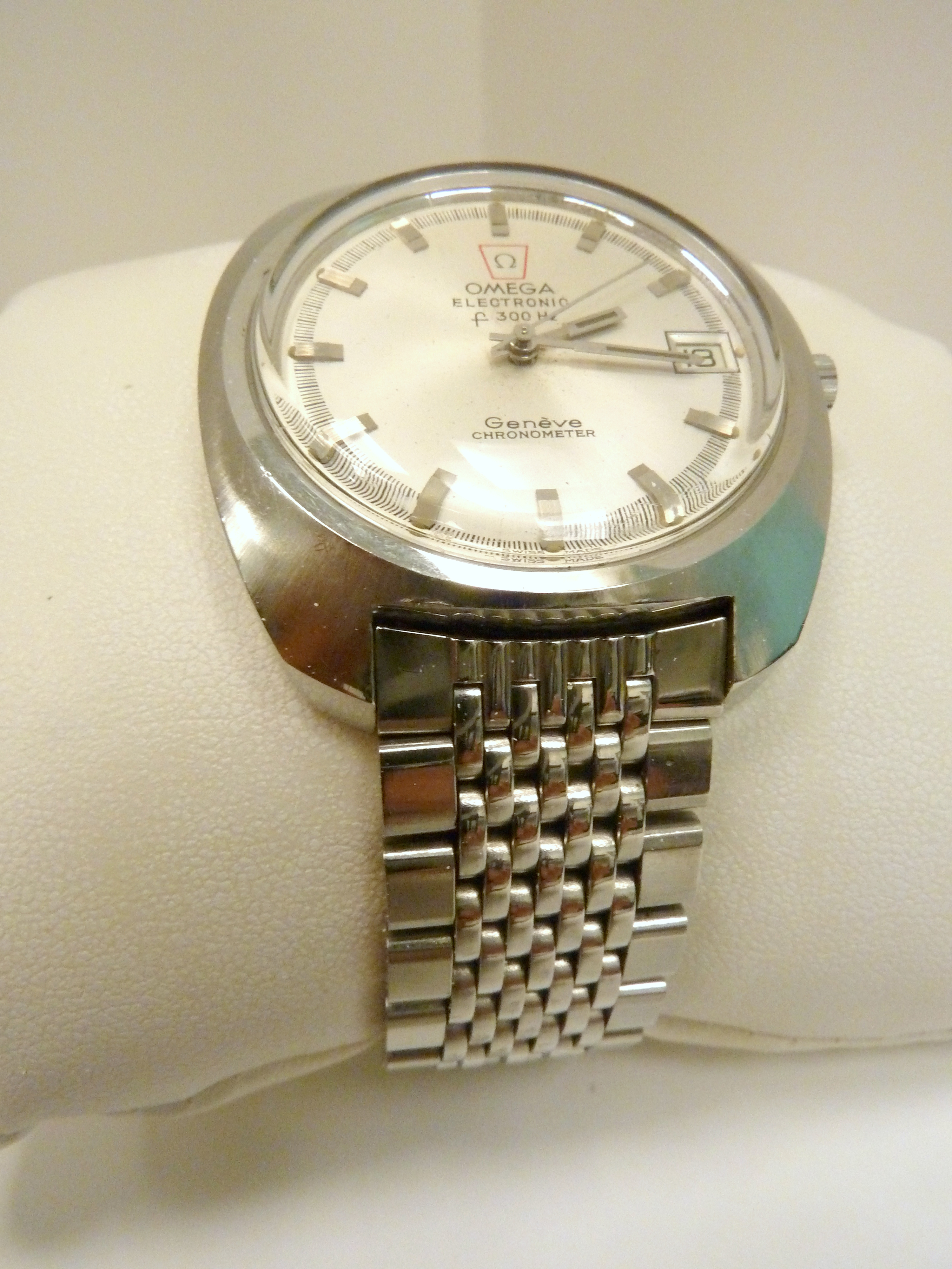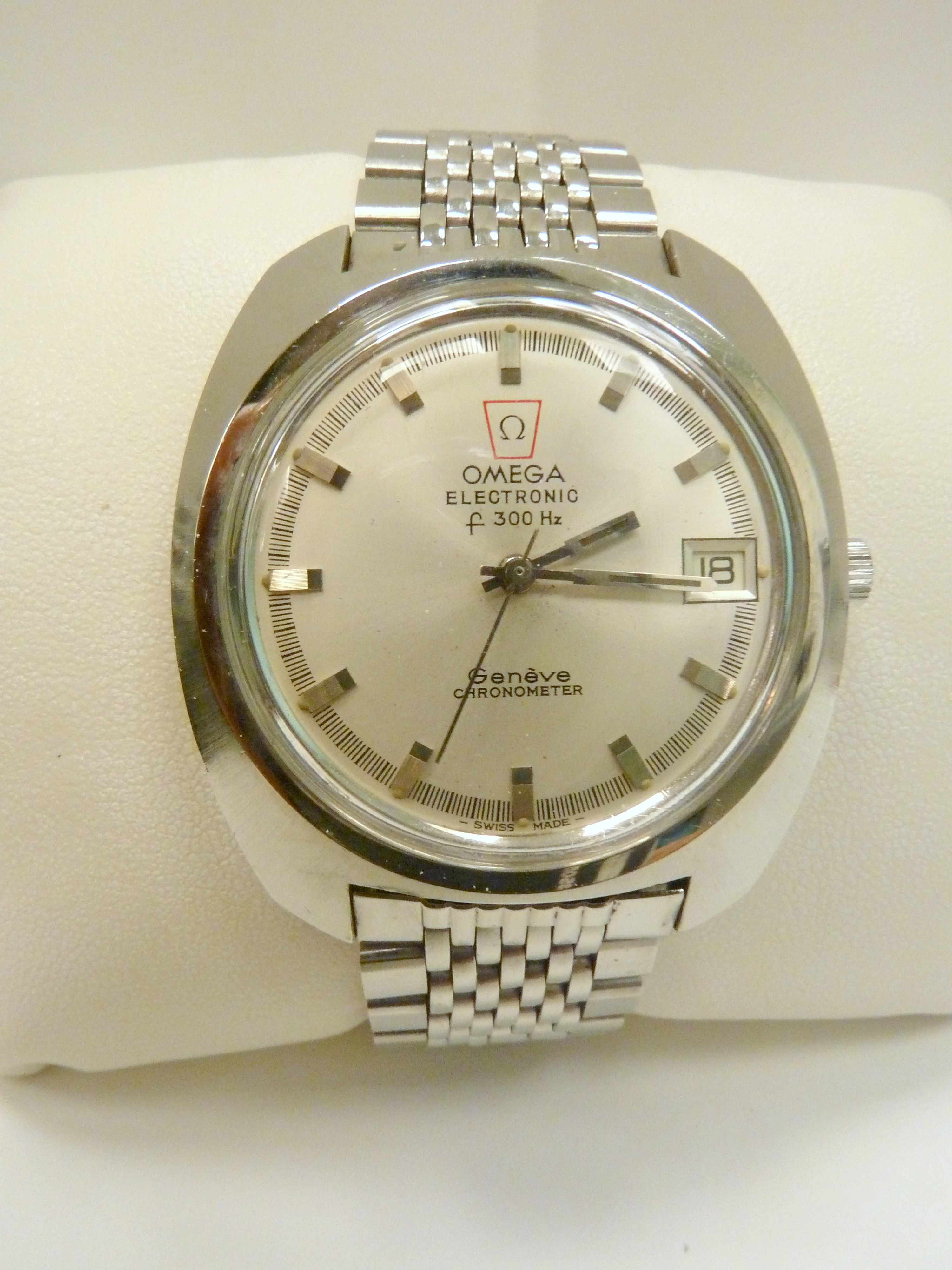 ยทFor sale is a beautiful Omega Geneve f300Hz Electronic Chronometer watch from 1977. The case is stainless steel and measures 37 mm across - it's in great condition with original crown and crystal! This watch has the original Omega band in immaculate condition that will fit a wrist up to 8." The watch works perfectly and keeps excellent time. There are no signs of rust inside and the gasket is intact.