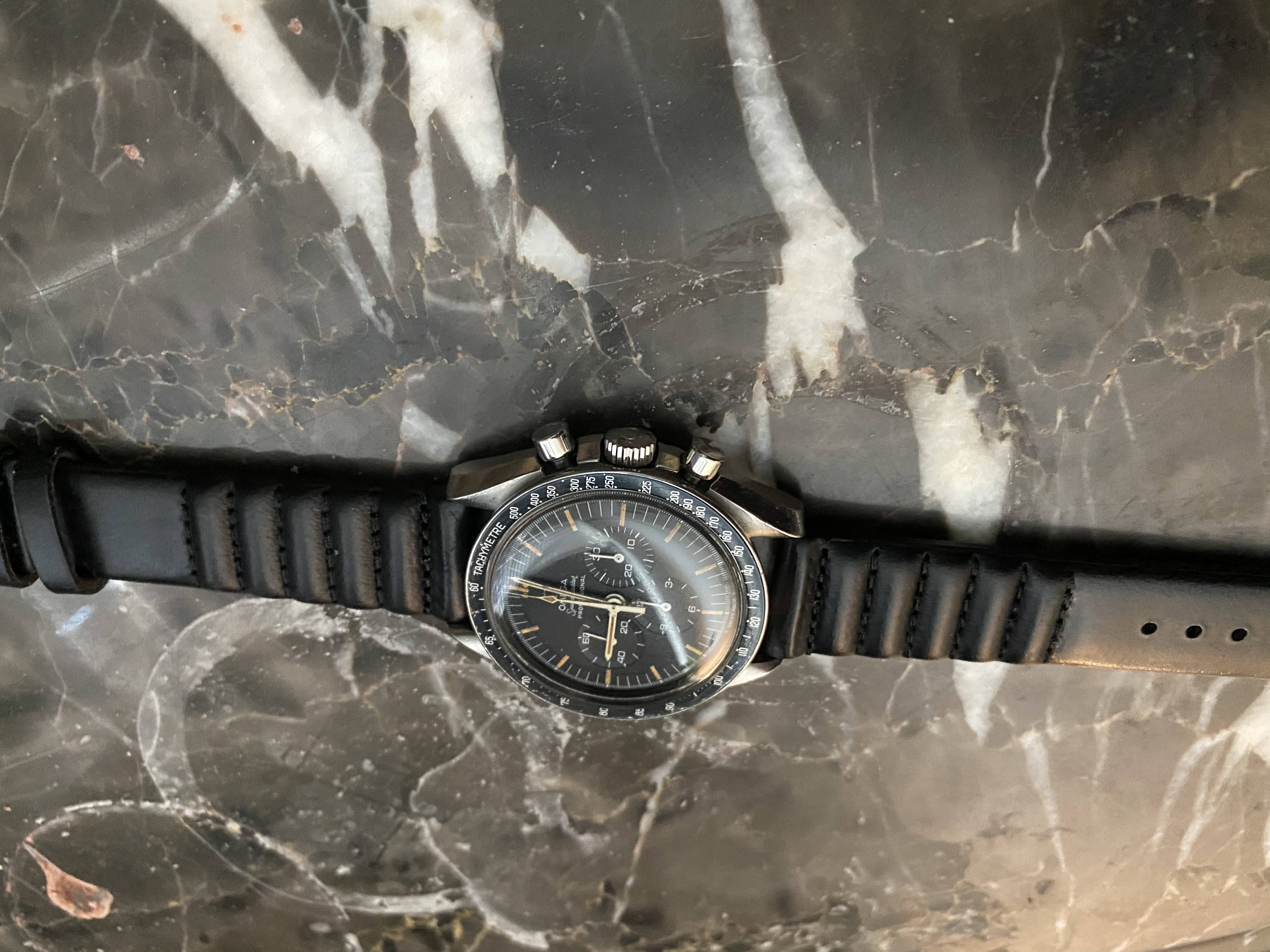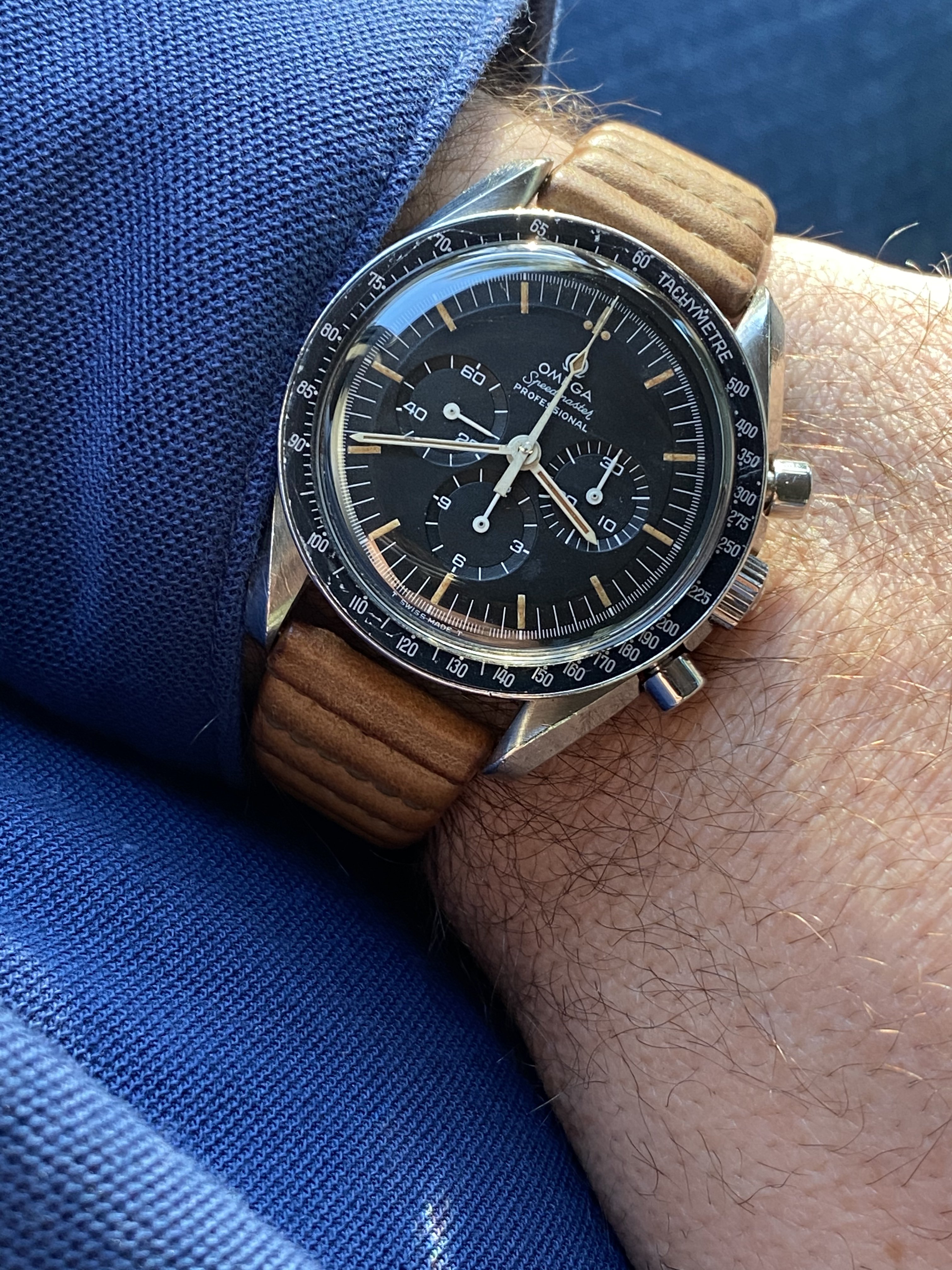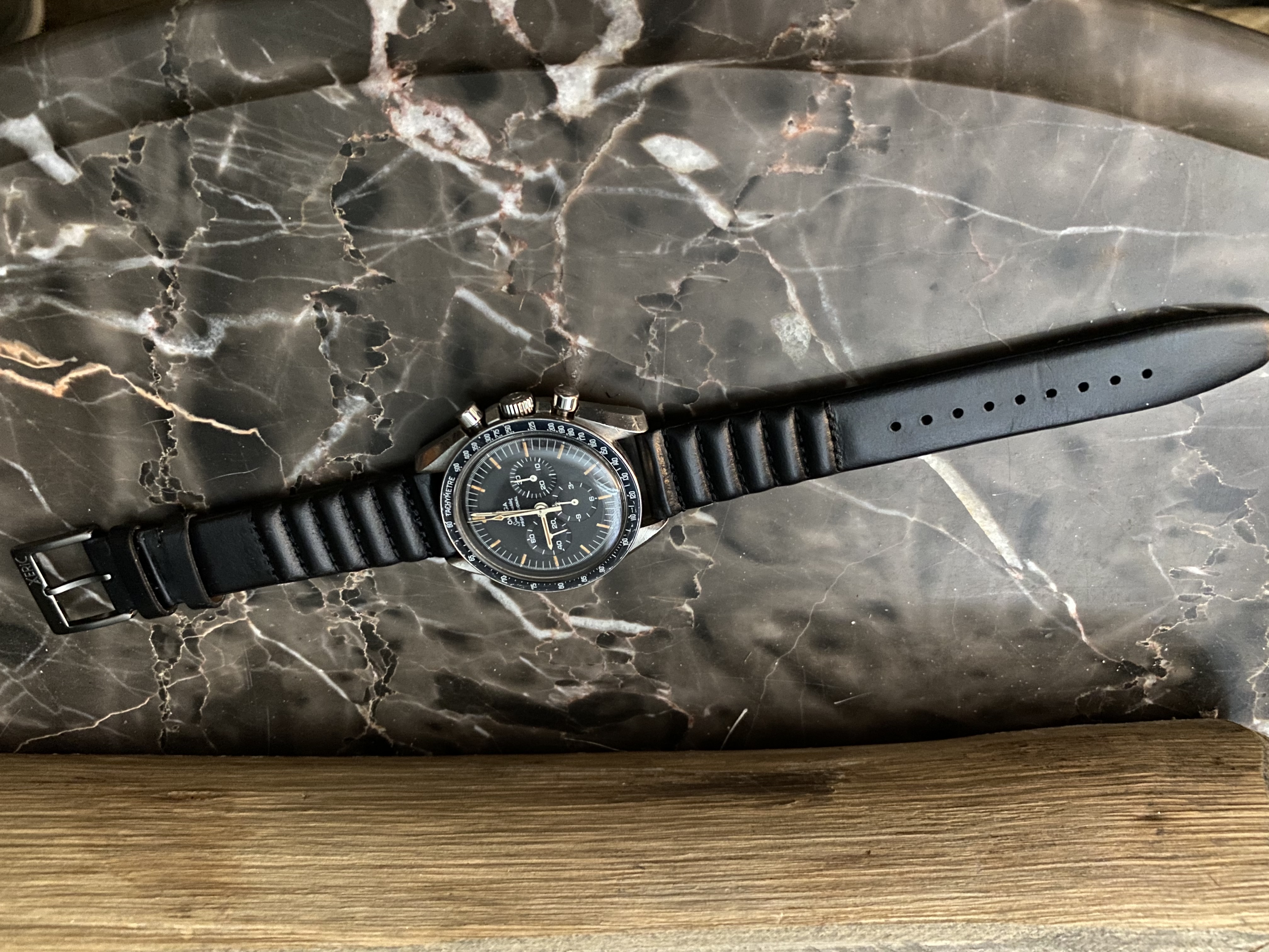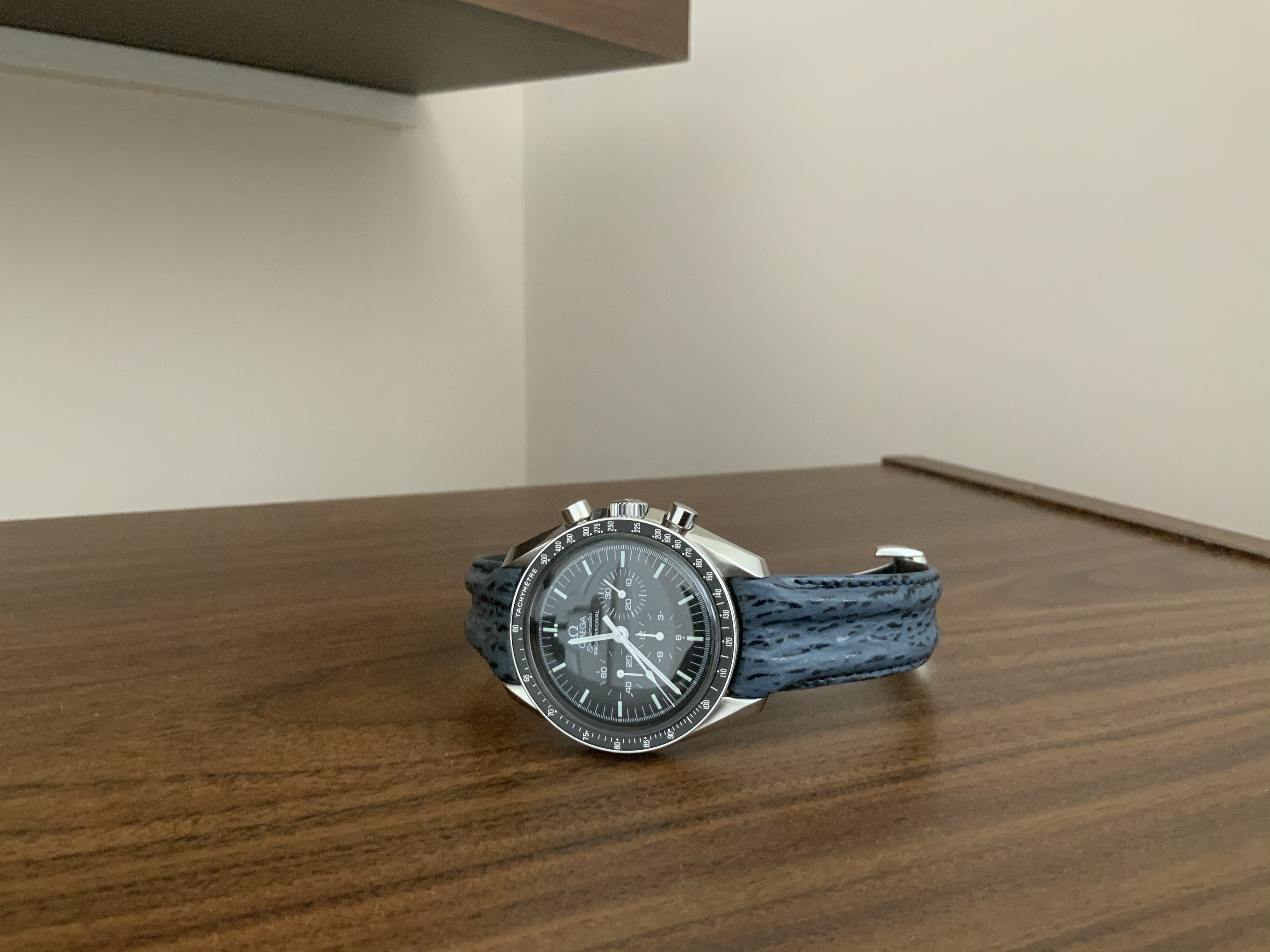 This is my first post here. I had my first Omega in 2012 and it has a sentimental value as it witnessed my kids birth and many key life events. Believe it or not it was stolen from me back in 2019 and I managed to get it back a few months later after constant search online and getting the police involved in recovering it. So I am attached to the watch, it simply tells too many stories, and that made me focus on buying interesting straps to change its look rather then buying new watches. I am amazed how the moonwatch style changes when you change straps. I will be sharing with you later six of my favorite straps, some of them are rare or difficult to find. Below is the rare double ridged blue sharkskin with the classic old style deployment clasp. I hope you enjoyed it.