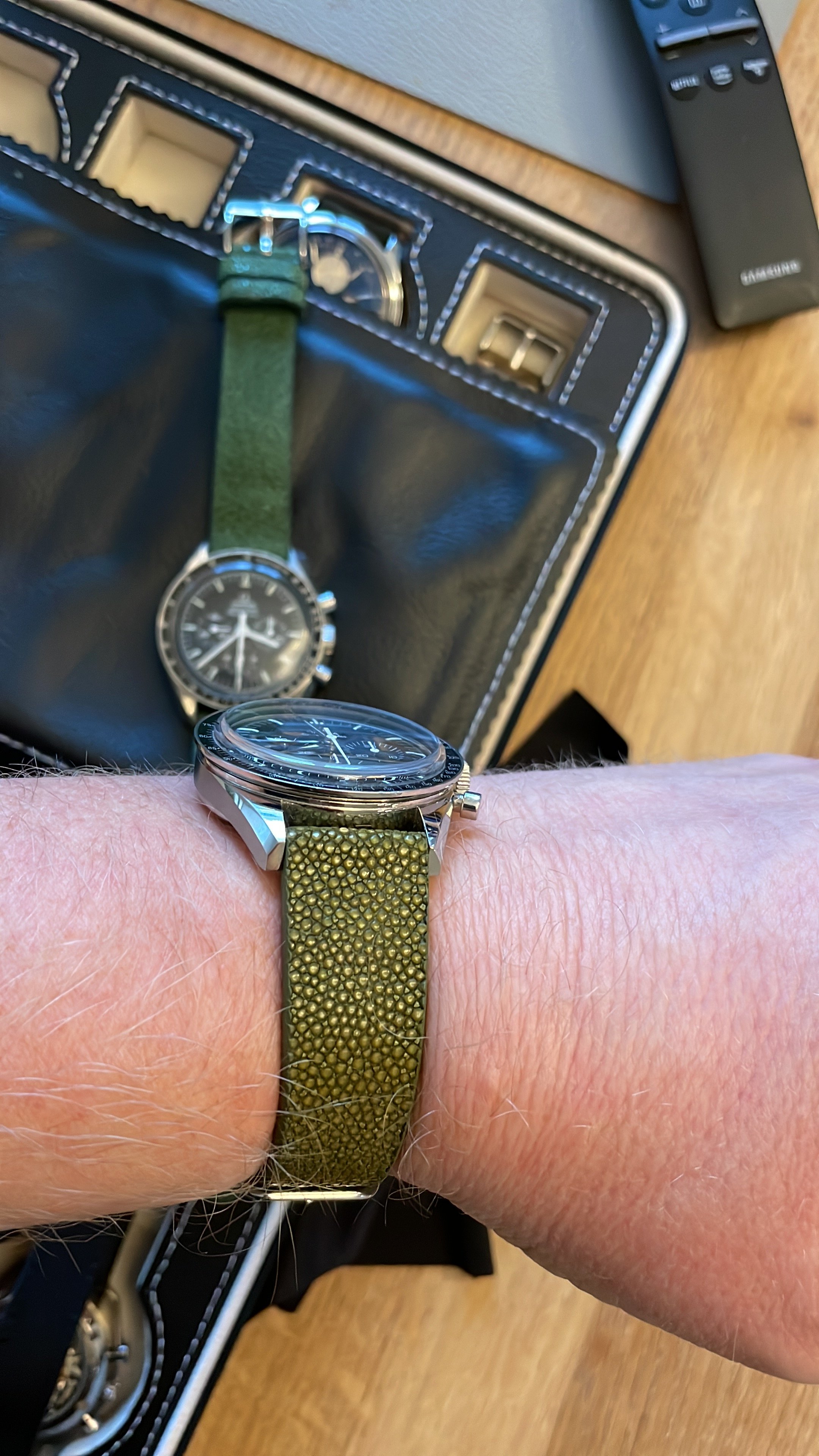 This is my first post here. I had my first Omega in 2012 and it has a sentimental value as it witnessed my kids birth and many key life events. Believe it or not it was stolen from me back in 2019 and I managed to get it back a few months later after constant search online and getting the police involved in recovering it. So I am attached to the watch, it simply tells too many stories, and that made me focus on buying interesting straps to change its look rather then buying new watches. I am amazed how the moonwatch style changes when you change straps. I will be sharing with you later six of my favorite straps, some of them are rare or difficult to find. Below is the rare double ridged blue sharkskin with the classic old style deployment clasp. I hope you enjoyed it.