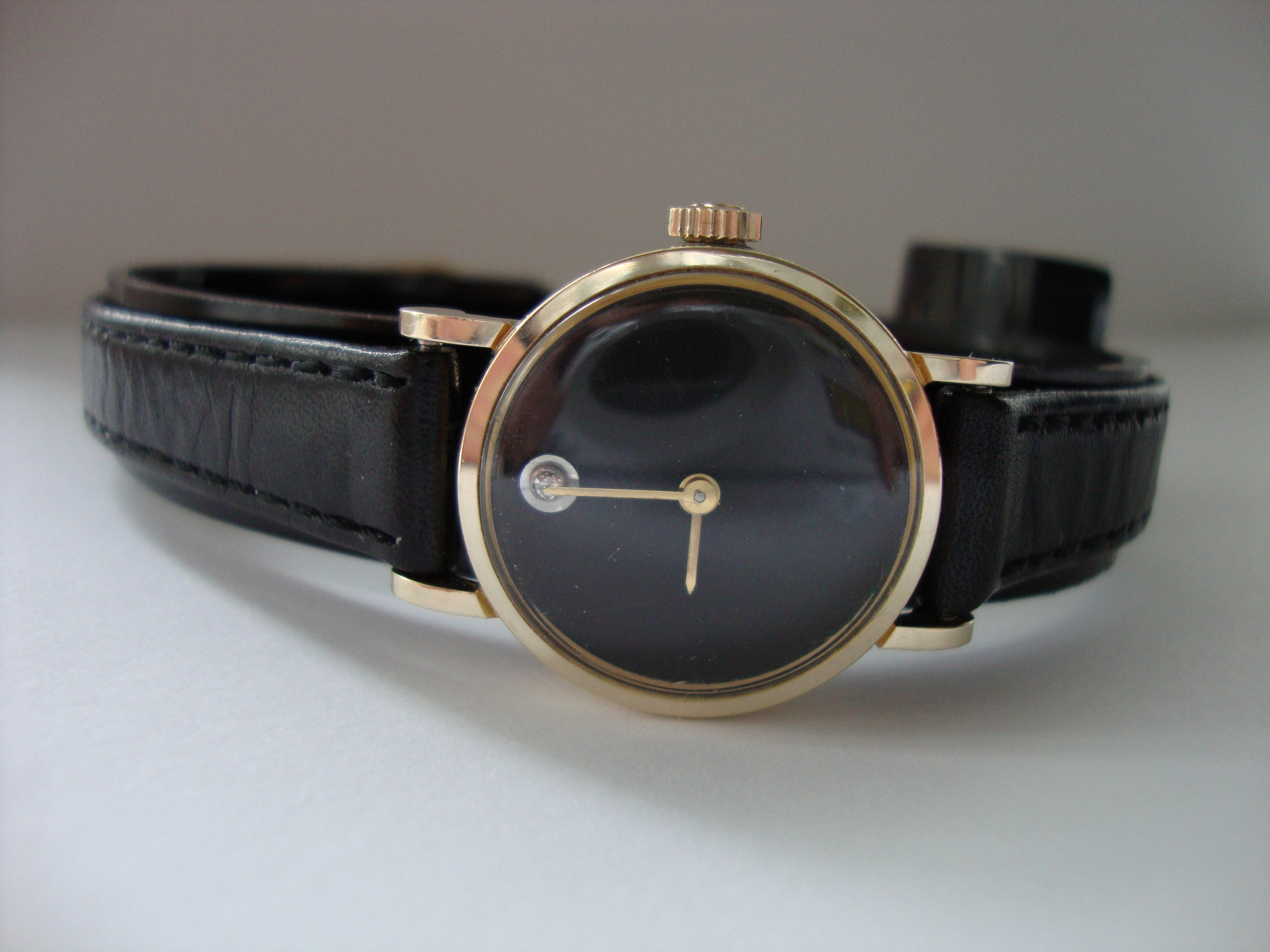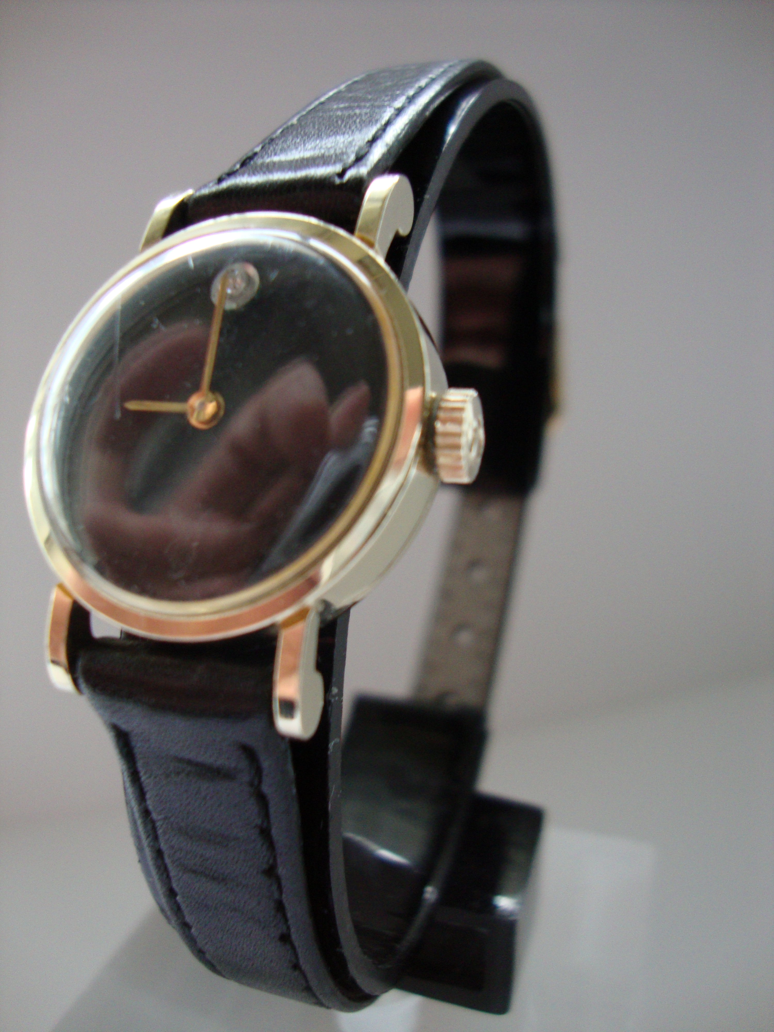 This watch is based on a 14k Gold Omega de VILLE with special black face and a diamond at 12 oclock position . Gone playboy bunny head is at 6 o'clock.