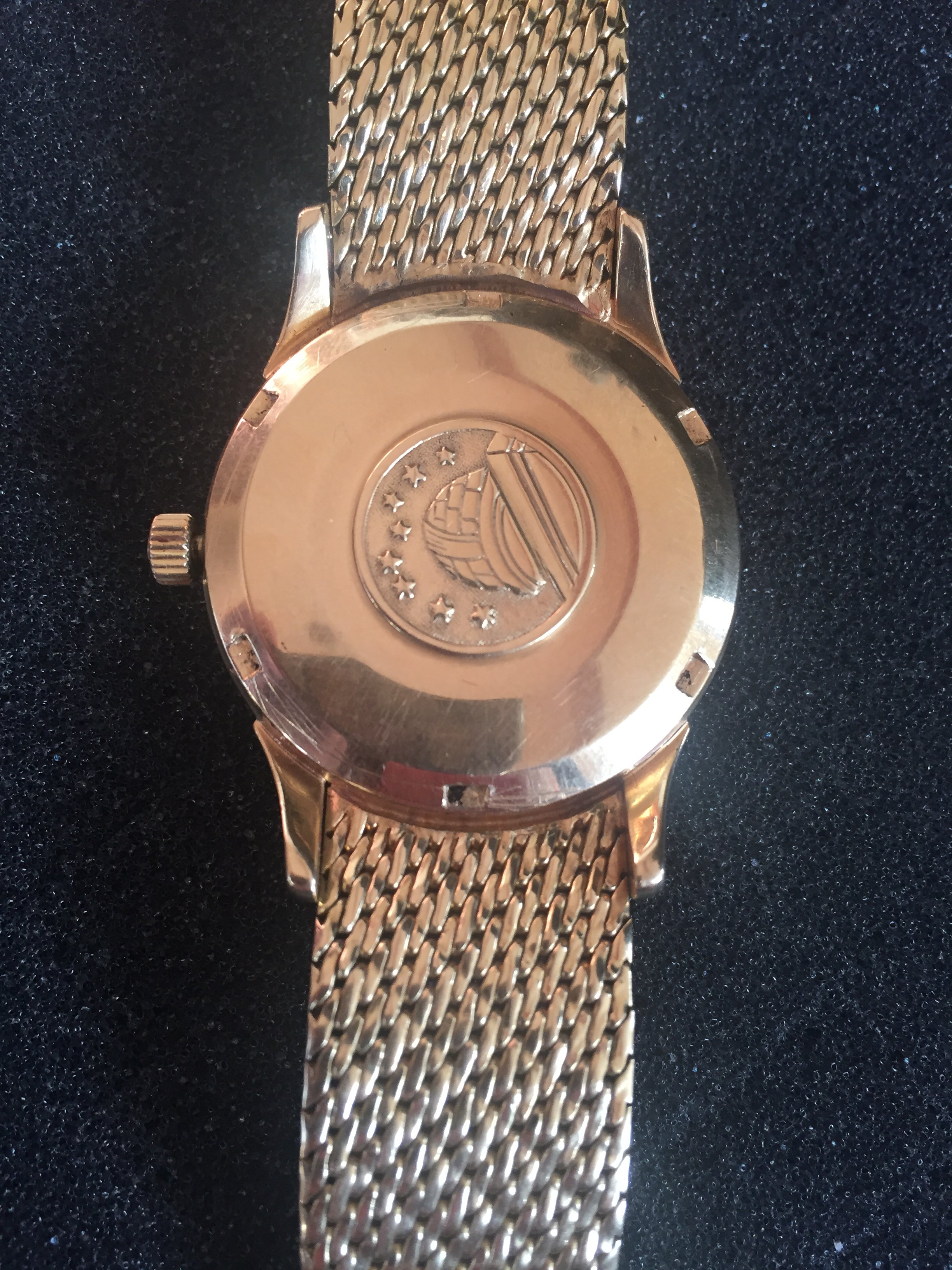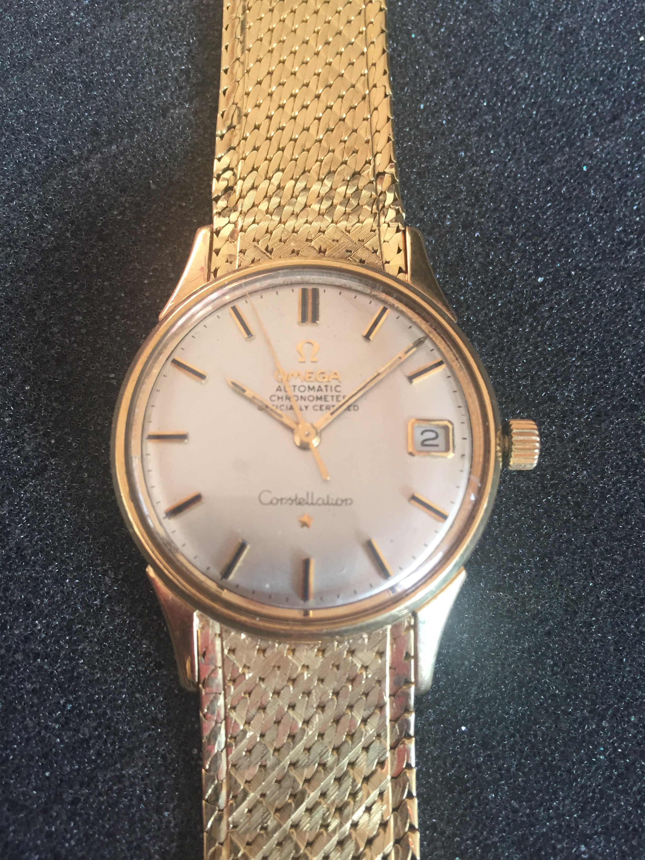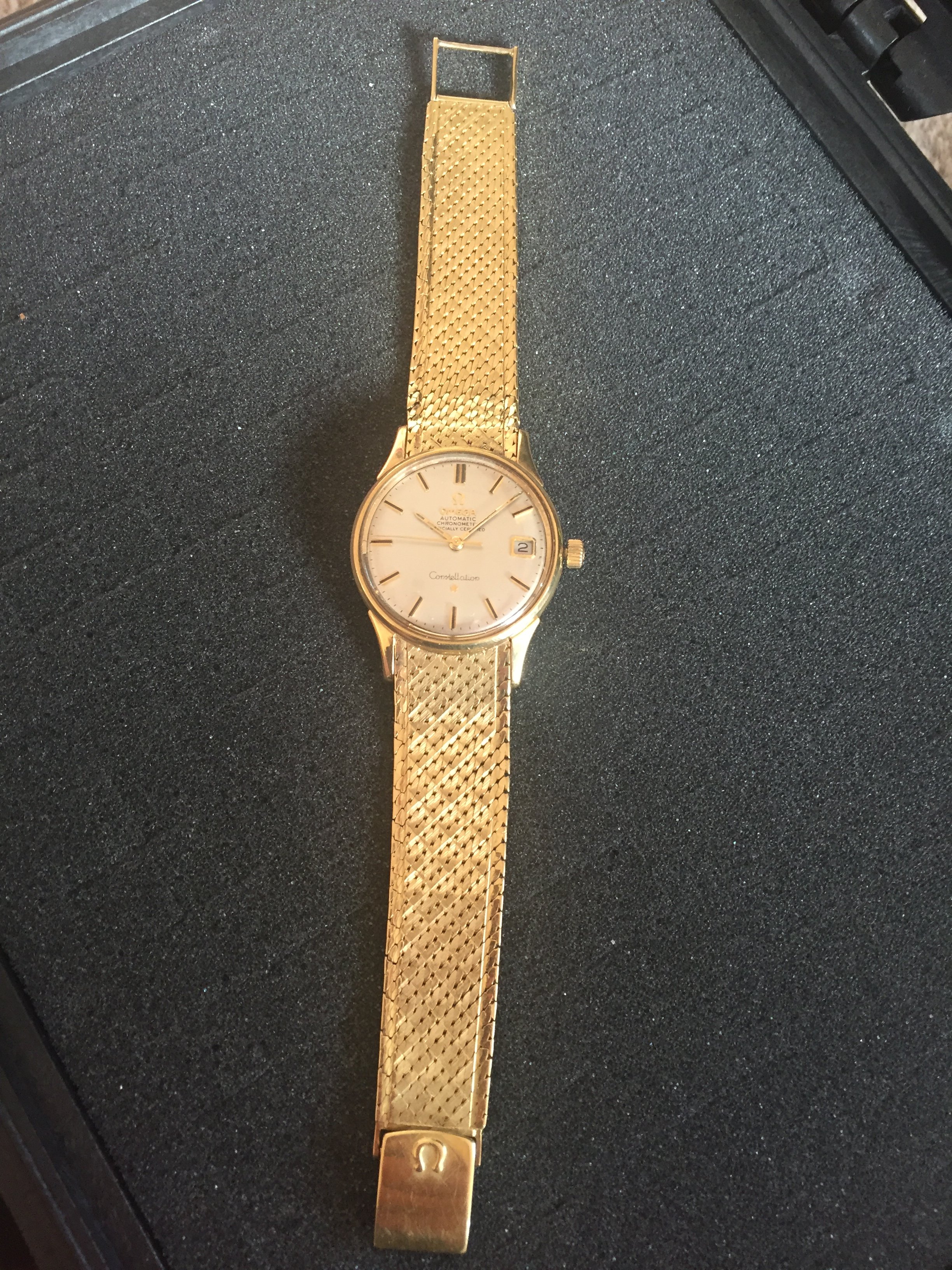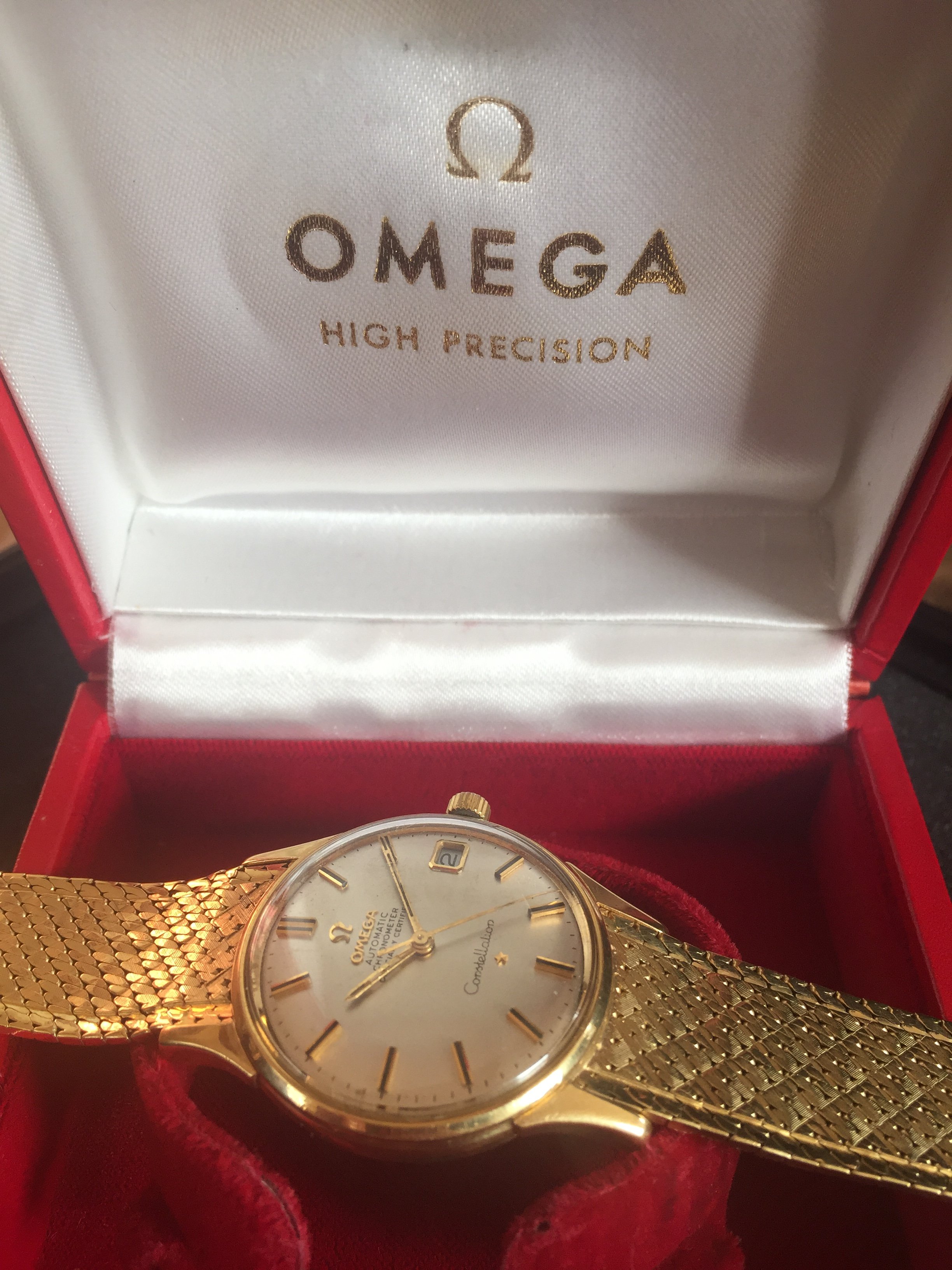It's an 18k solid gold Schackmann cased Omega Constellation with OWC (Omega Watch Co) and London assay mark (Leopard head)