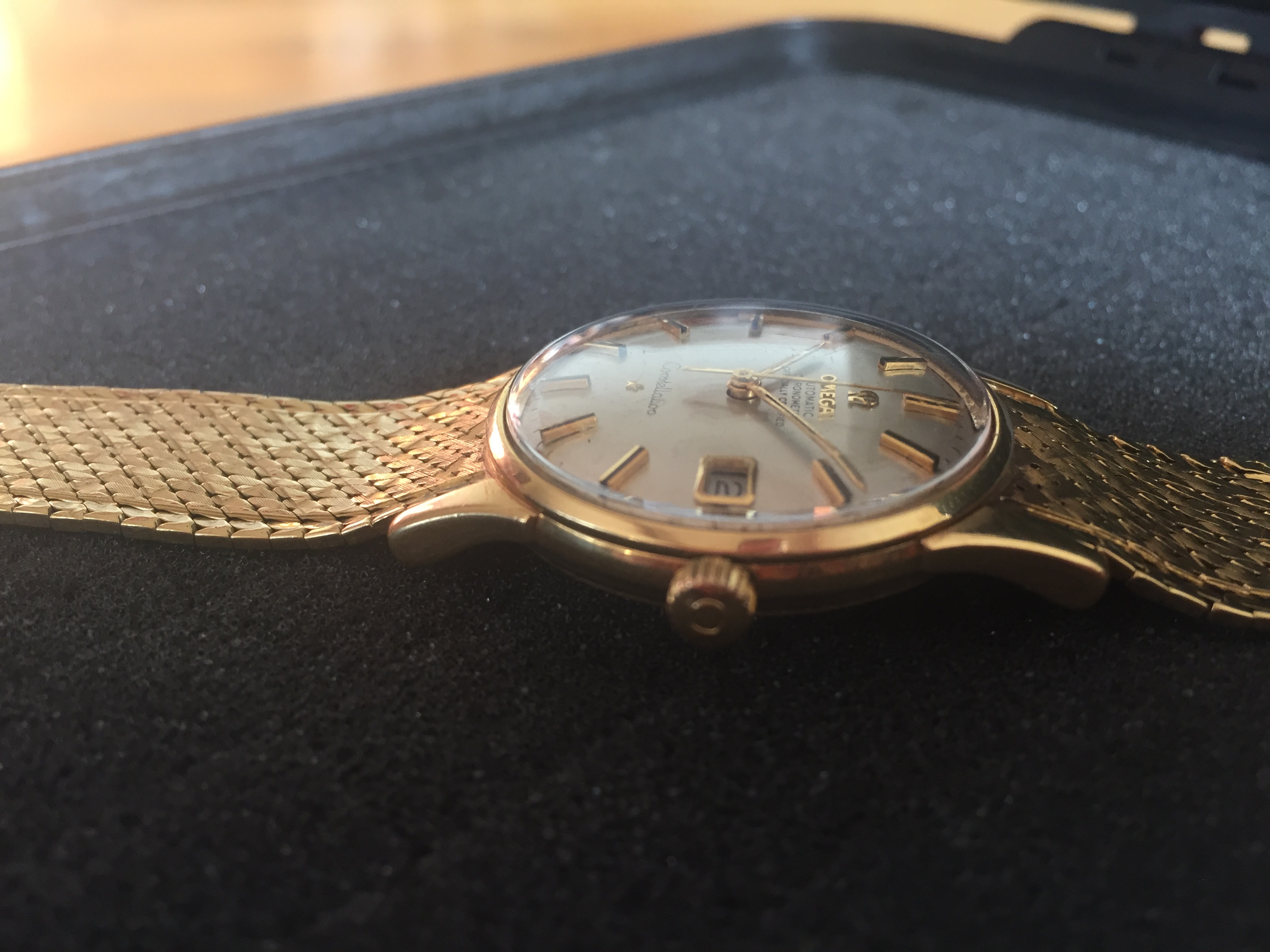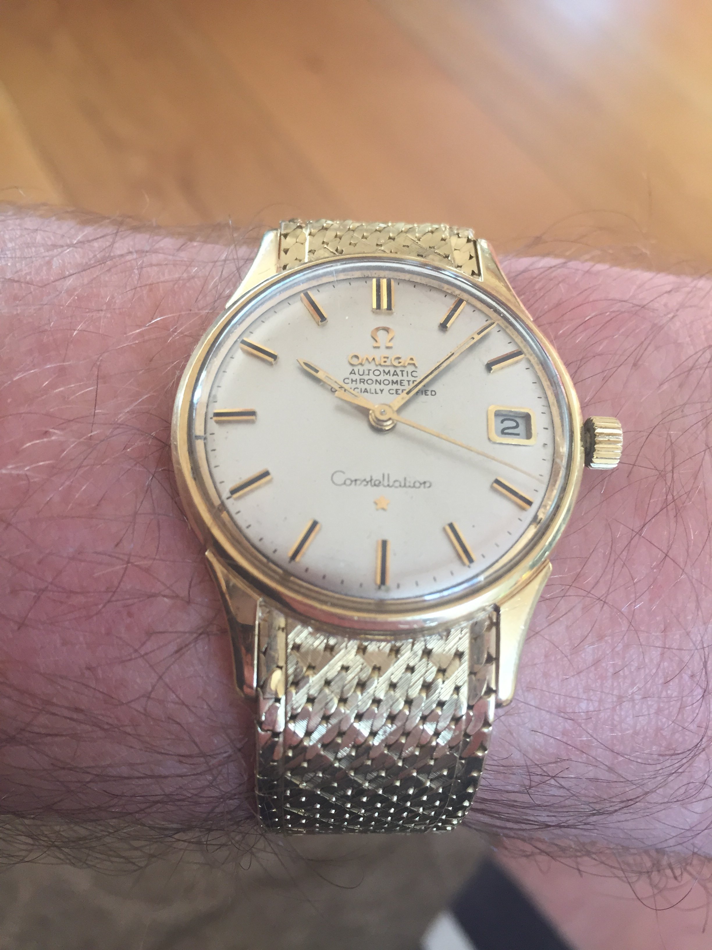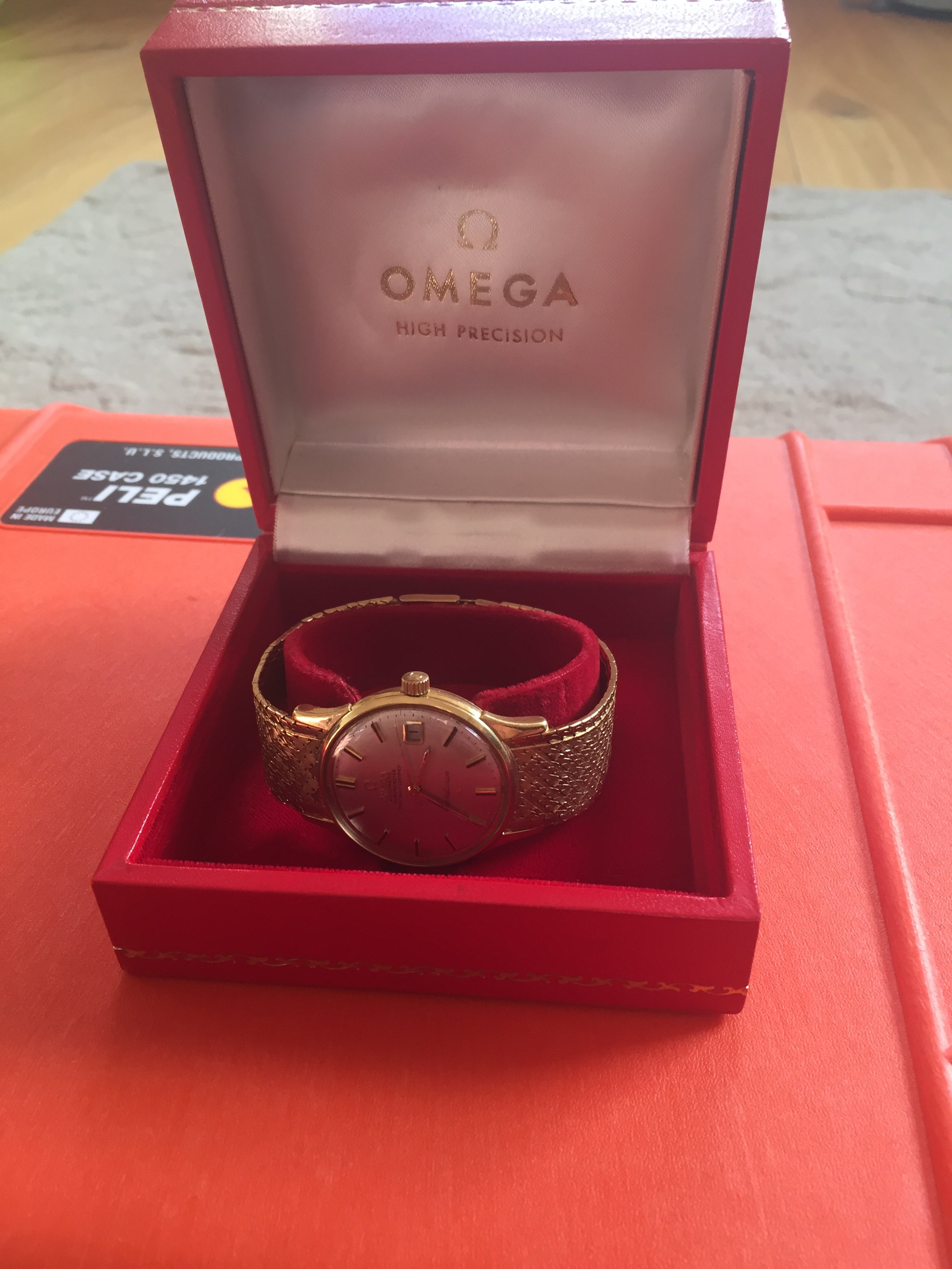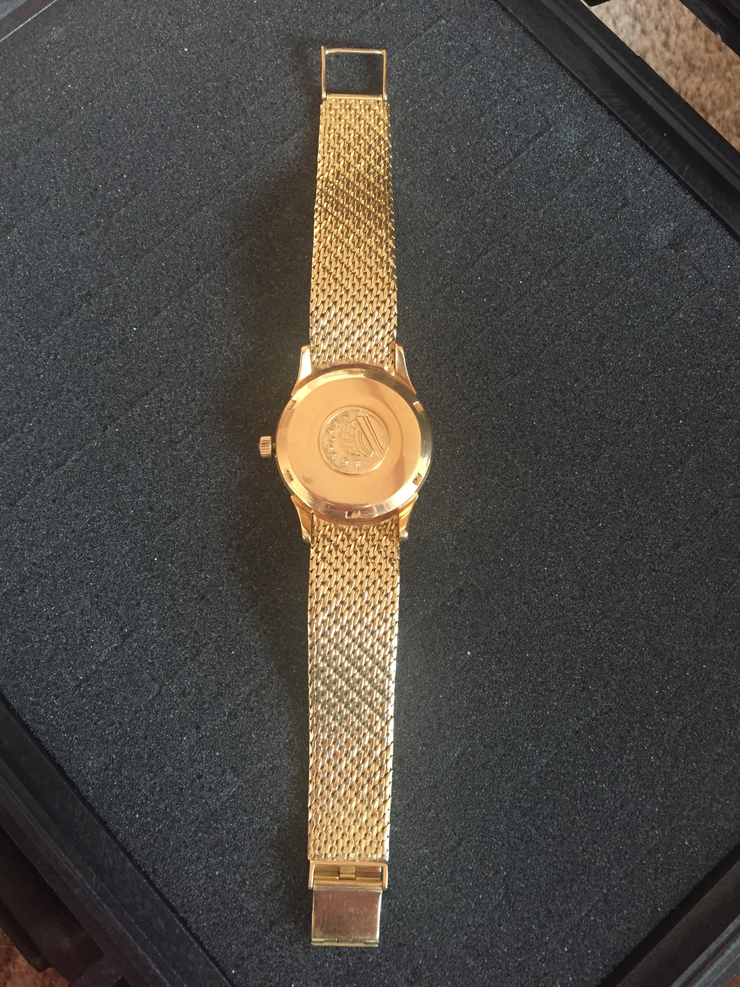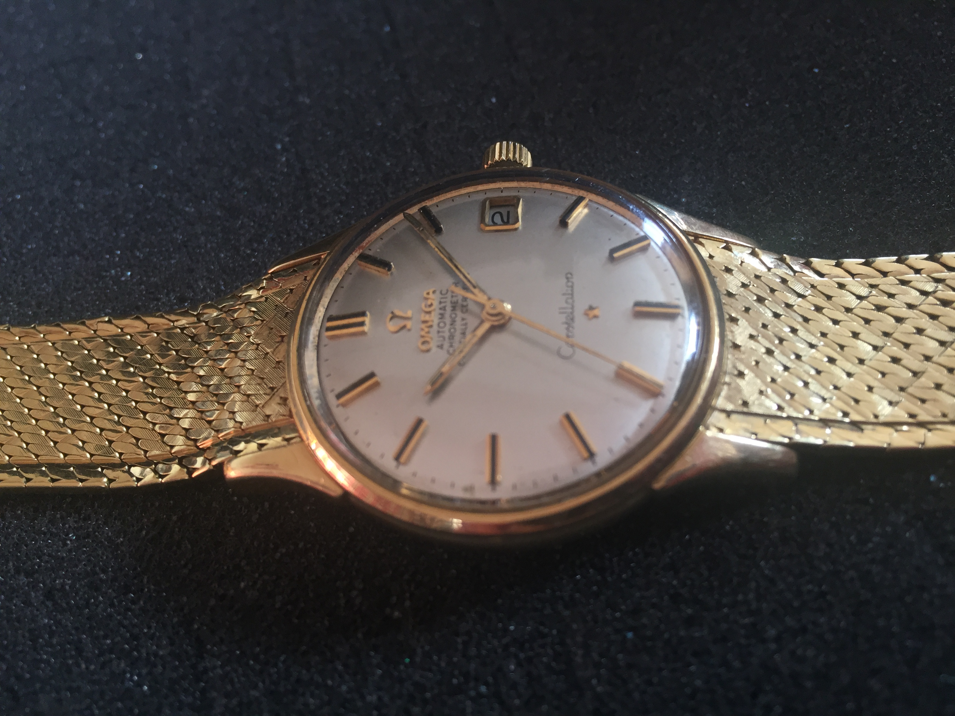 It's an 18k solid gold Schackmann cased Omega Constellation with OWC (Omega Watch Co) and London assay mark (Leopard head)