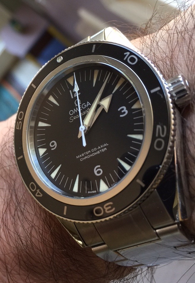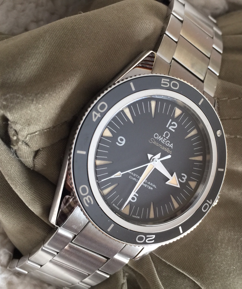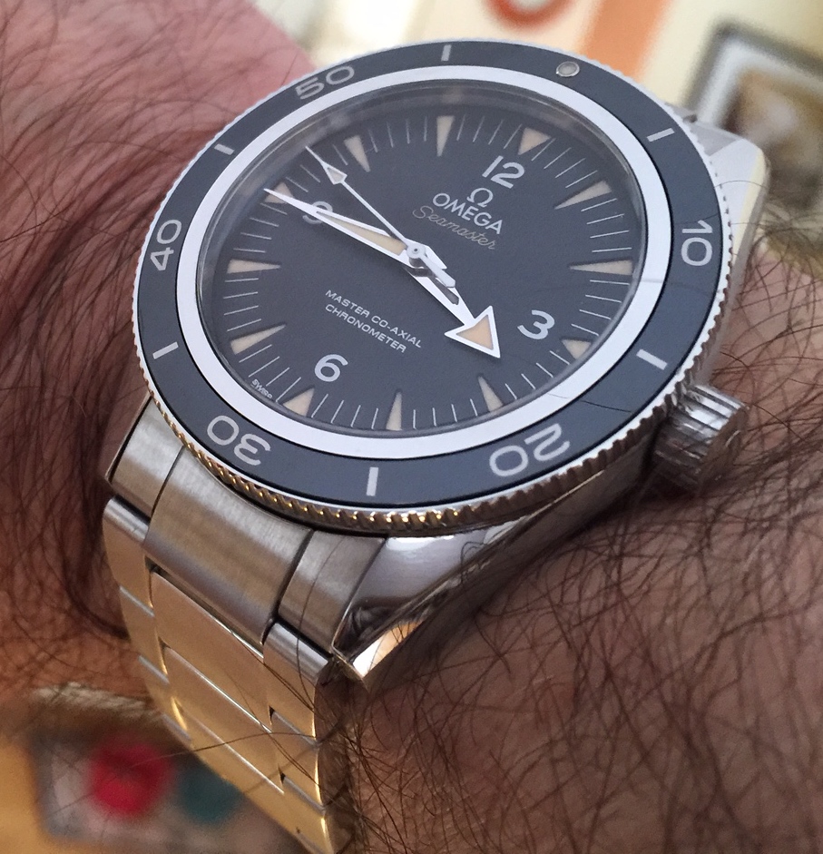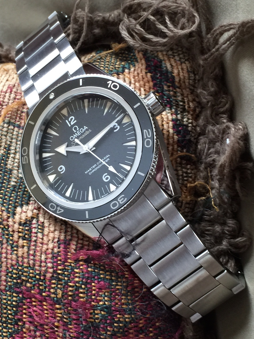 So what is it that makes the watch special for me? Well, it is the total package. I love the alternating surfaces of brushed and polished parts of the case. If you ever owned one of the original Seamaster 300 models, you know how special that look was and is. The design just works. You look at the Seamaster 300 Co Axial and it gives the owner that same comfortable feeling of something very familiar but you also get the luxury of the new technology to enjoy and appreciate. At this point in my life, I can’t afford to buy a large number of fine watches so I need to be really careful with my purchases. This watch for me was and is one of the right choices. It gives me pleasure each day I wear it. The pictures of it do not do it justice but i will include the best ones I have been able to take so far. I forgot to mention the timekeeping. After a month, it seems to deviate 1.5 seconds per day. Why do we buy these watches? To me, they have their functional purposes but they are also art. I look at the Seamaster 300 Co Axial and I see beauty in its harmony and design.