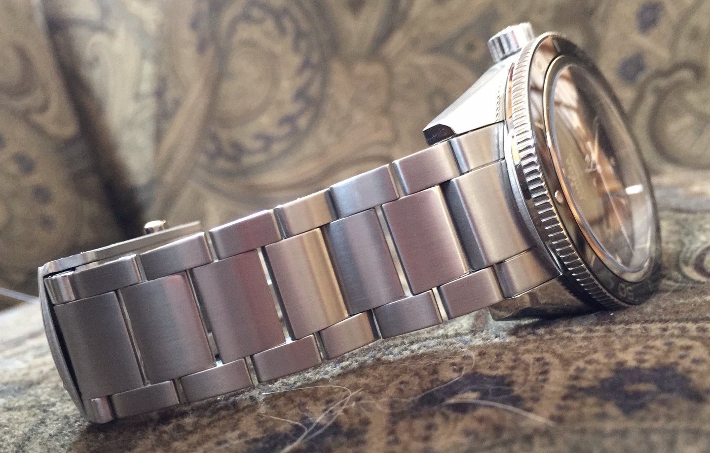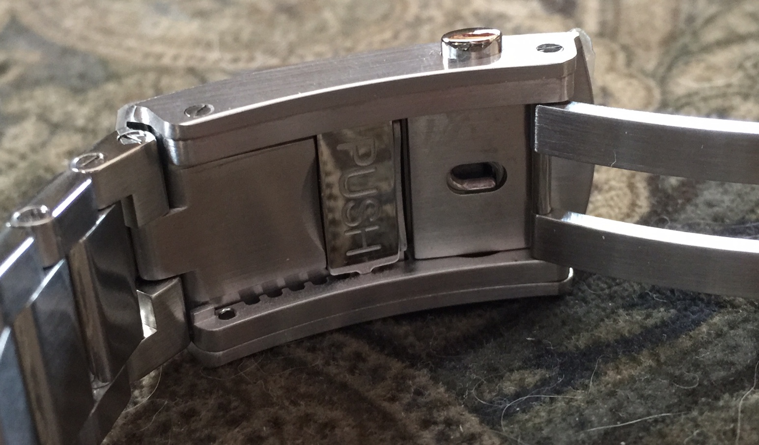 The bracelet comes with outer brushed links and polished center links. If you have read my earlier posts, you know I asked my dealer to have the watchmaker brush the center links to match the brushed look of the outer links. For me, I prefer the brushed look and never liked polished center links but that is a matter of personal preference. I like the micro adjustments you can do on the bracelet. You just push a button and can make small increases in size. I had it sized tight to my wrist and will let it out a bit in the warmer months.