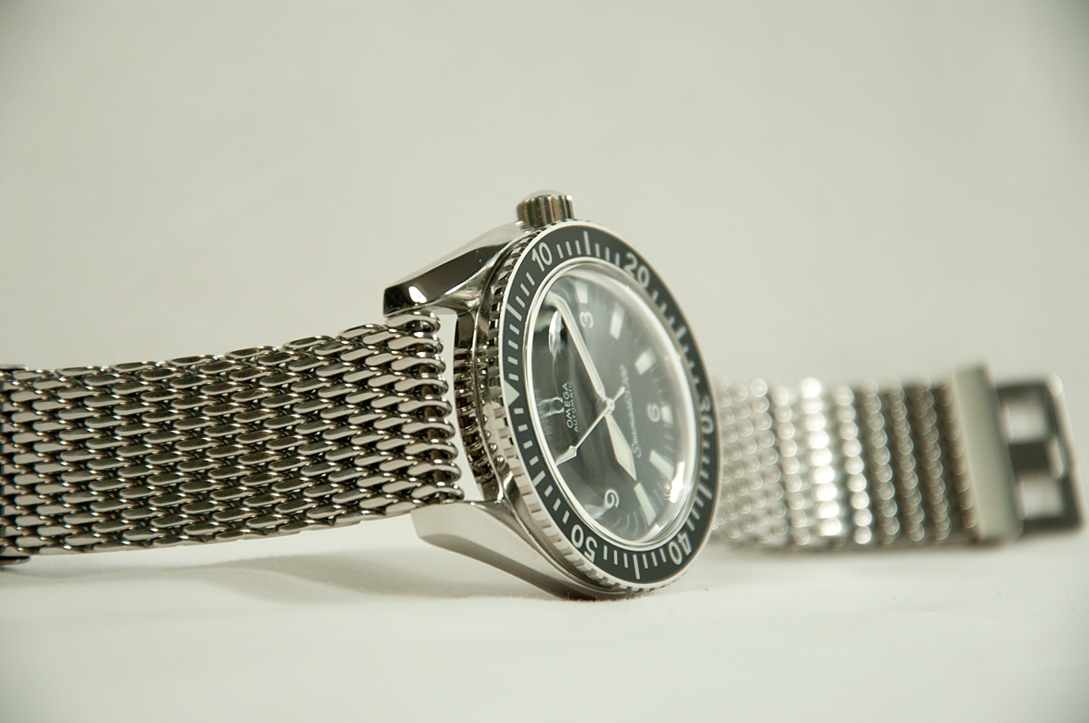 Omega’s Vintage Mesh bracelet is considered one of the best mesh bracelets ever produced, so good in fact that it is commonly seen attached to Seiko, IWC, Breitling, and even Rolex sports watches, in spite of the fact that it carries a very visible Omega symbol on its clasp. The mesh is several millimeters thick, strong, effortlessly flexible, and as smooth as glass, while carrying a not insignificant heft to it. The way it fits puts it above the Omega Bond bracelet, and Speedmaster bracelets in terms of comfort, and explains why PloProf owners consider their watch with all its size to be so comfortable.