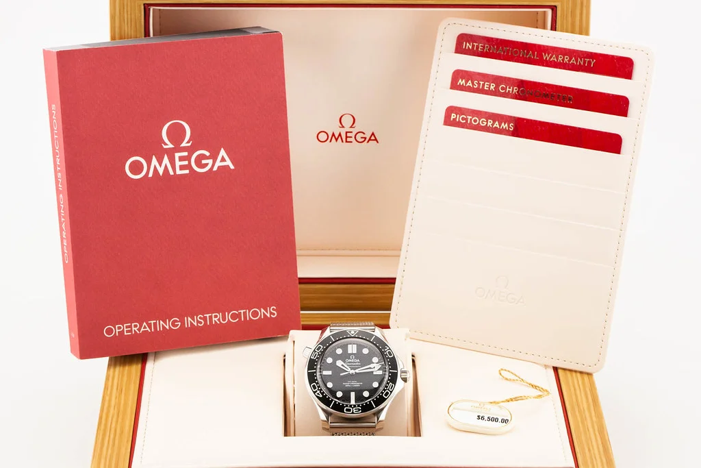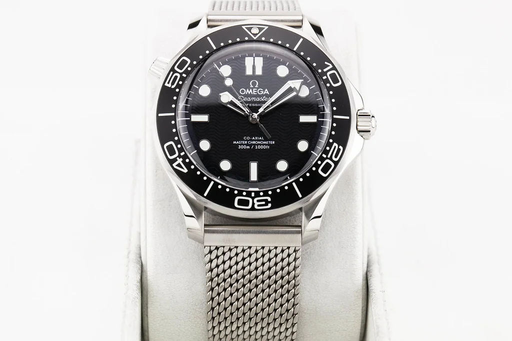 ยทUp for sale is a brand new Omega Seamaster 300M 42mm Black Aluminum Dial & Bezel on Mesh Bracelet, reference # 210.30.42.20.01.010. It comes complete with all boxes, papers, booklets, hang tag and Omega Warranty Card dated August 2025.